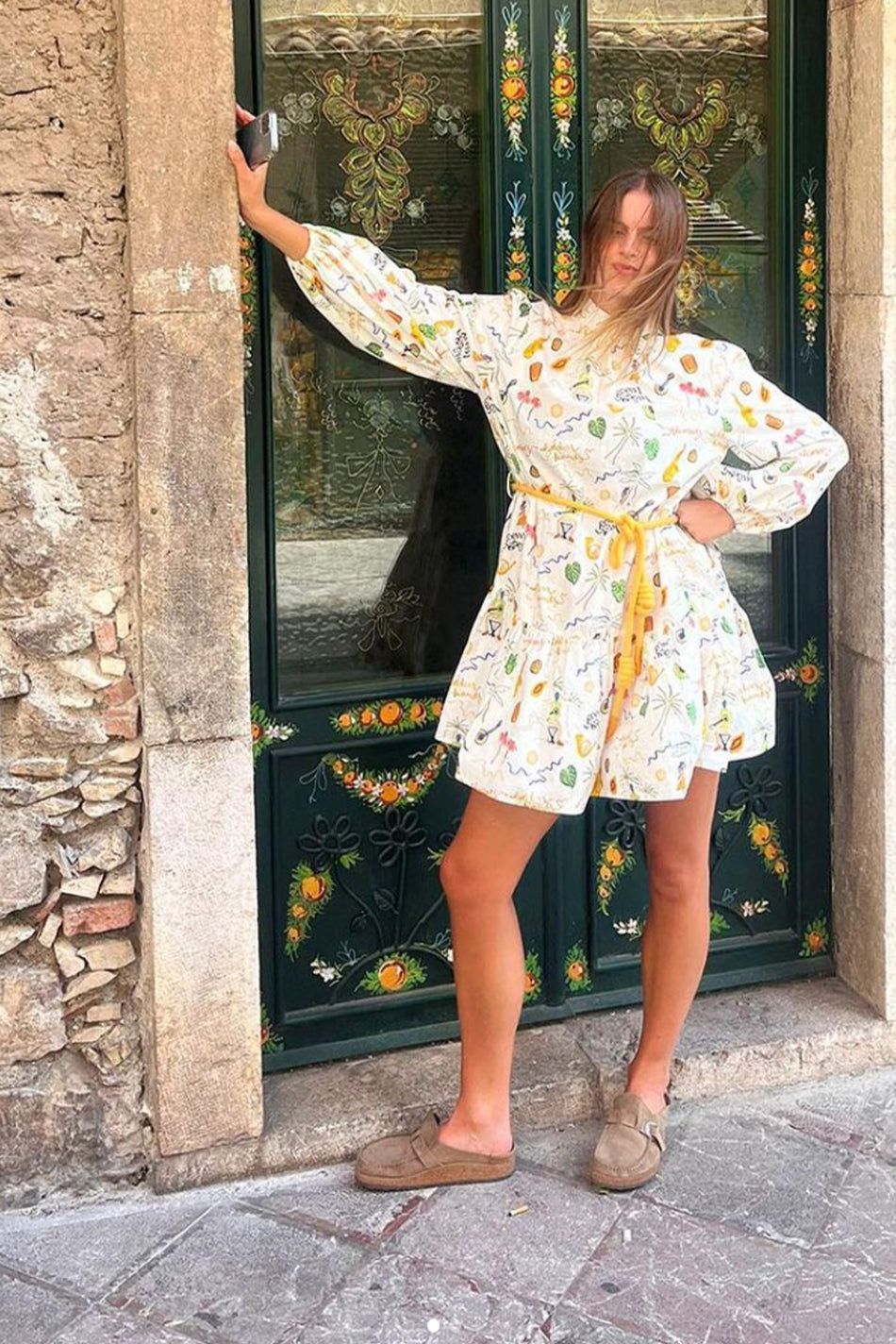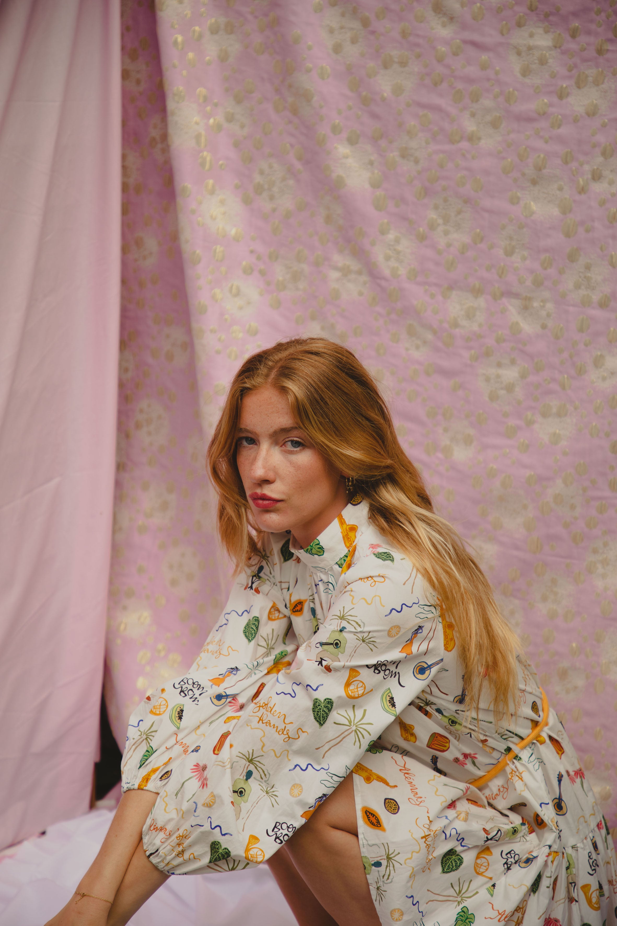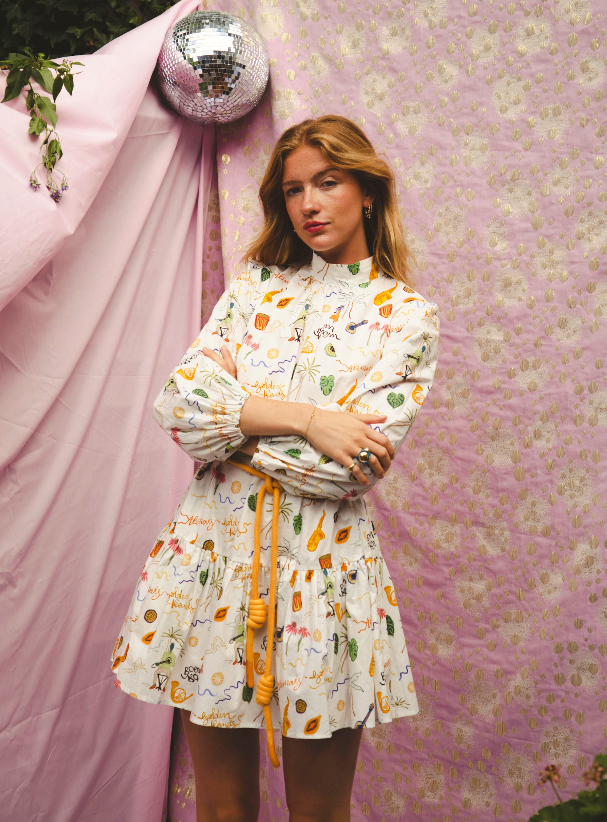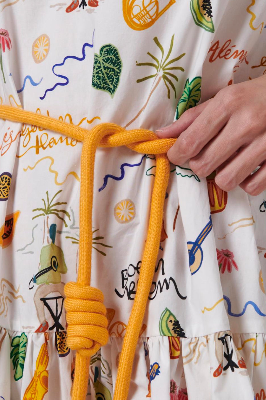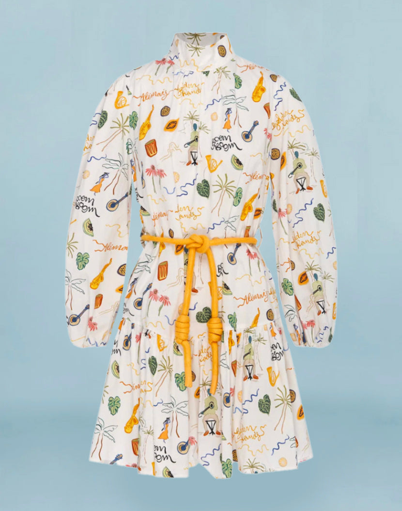 Cut with long elasticated voluminous sleeves and a high neck, this smock dress is made from organic cotton for an easygoing style. With a yellow cotton rope belt at the waist to define your figure, this dress is finished in a multi-motif print.