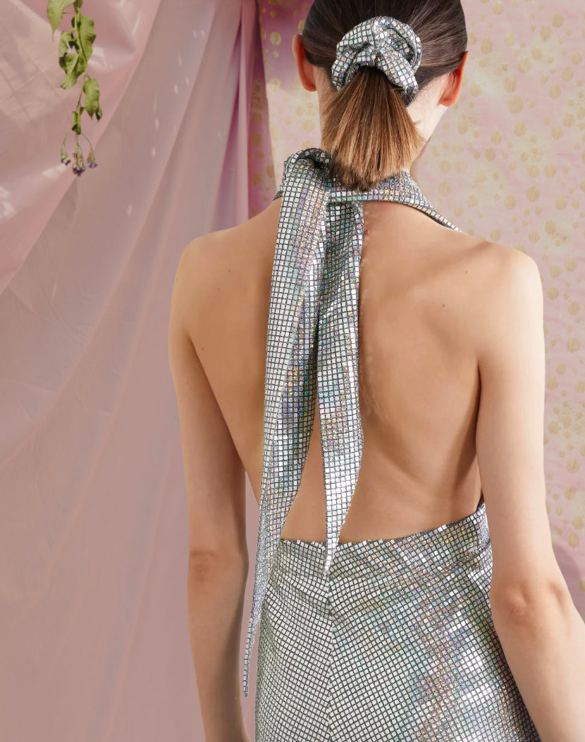 Stand out in this show-stopper of a disco ball dress. Ties as a halter neck at the back and has an elasticated waist with no zip. Comes with a matching scrunchie.