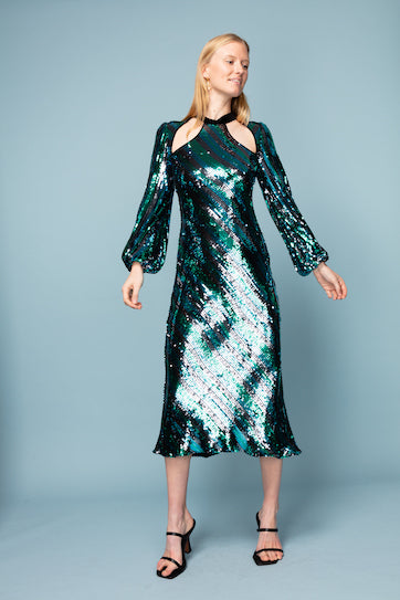 High neck black velvet detail, with green sequin long sleeves and elasticated cuffs. Low back detail, with black velvet ties