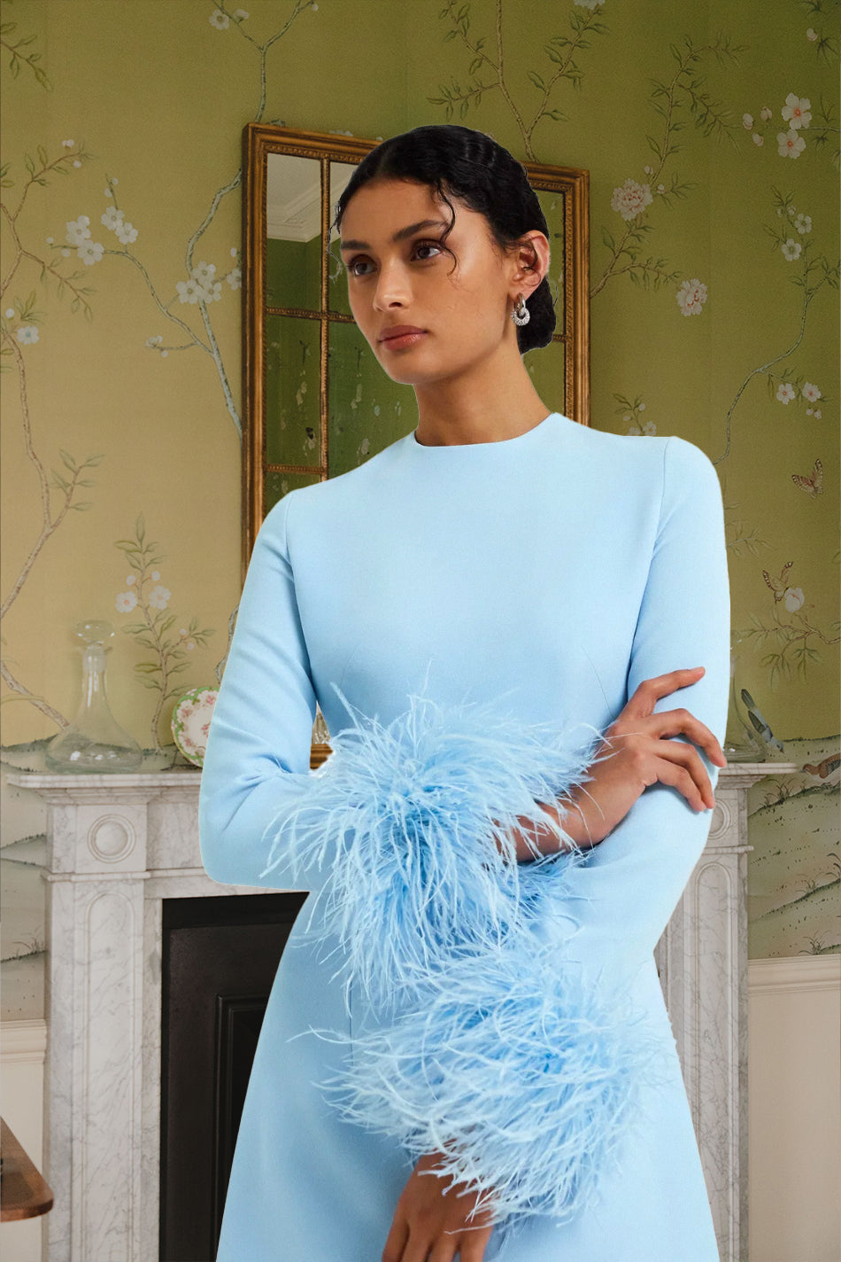 Mini A-line dress with long sleeves and statement feather trim in pale blue. The feathers are not as abundant as they once were; there are some missing so it is less volumous on the sleeves! Please get in touch if you would like to see photos.