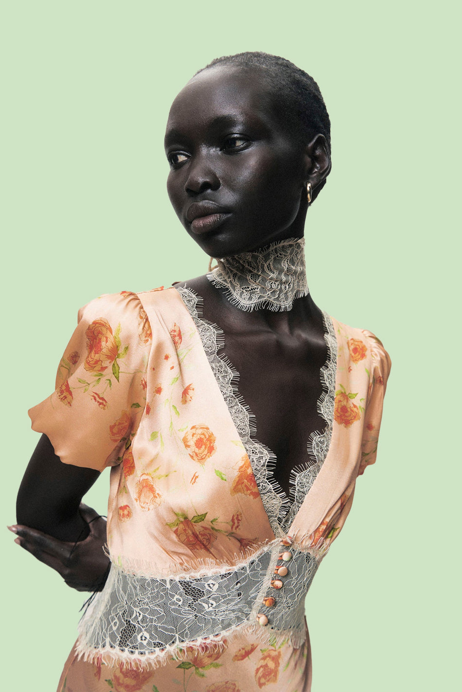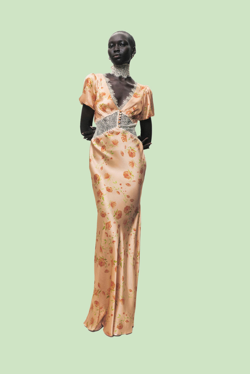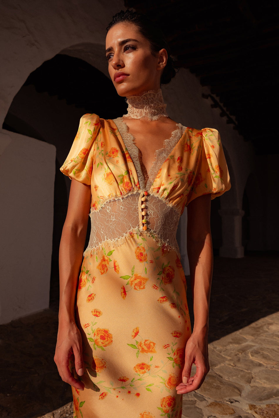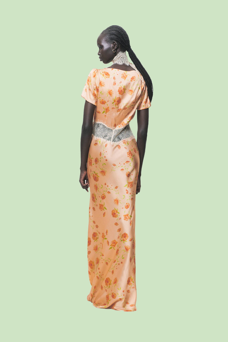 This style is crafted from a lightweight silk satin selected for its delicate drape and flow. This style is selected for its romantic and airy feel. Includes matching lace necklace