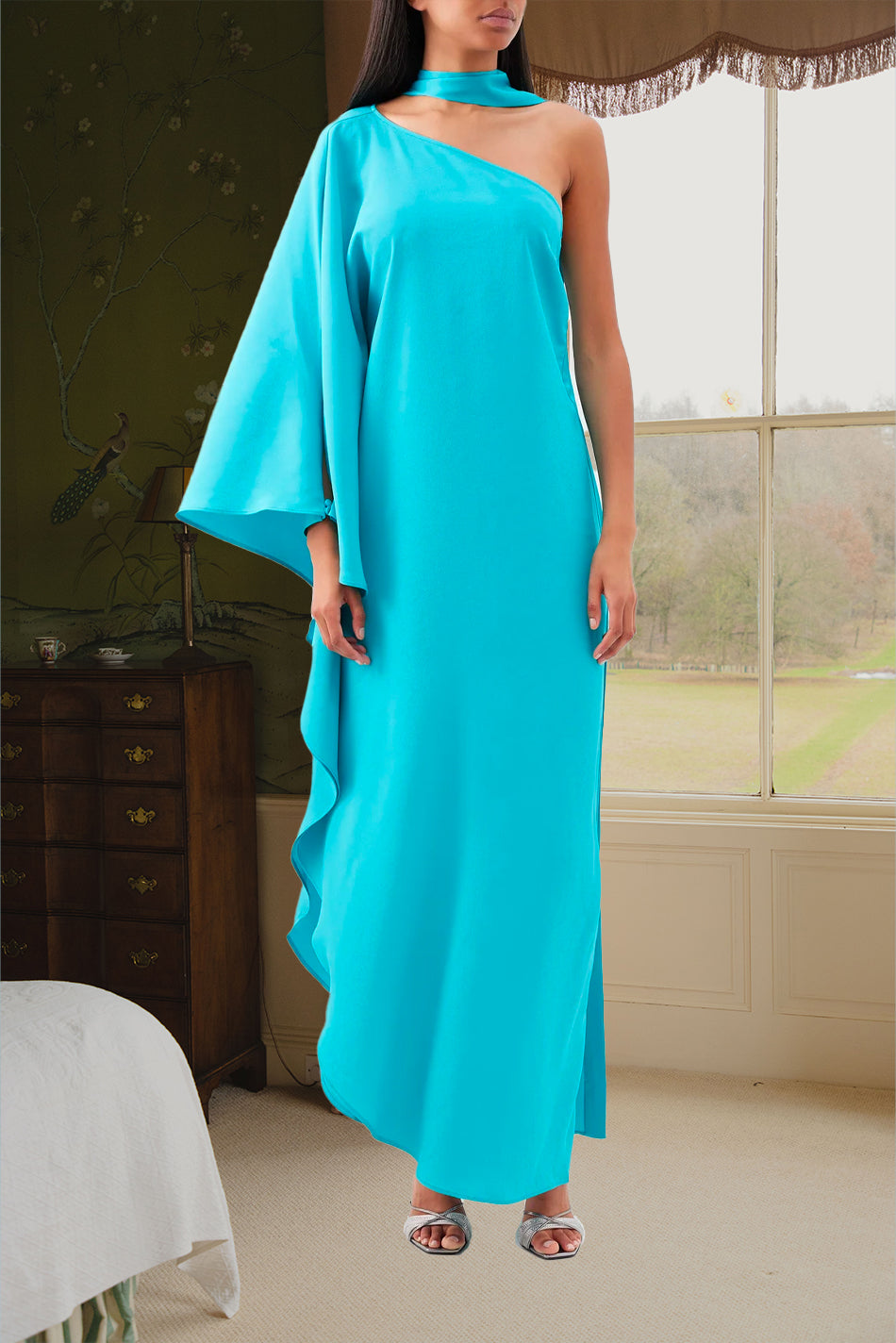 Known for its sweeping silhouettes and bold design direction, Taller Marmo presents the turquoise-blue Bolkan maxi dress. Its one-shoulder shape billows with movement: it's cut with a matching scarf and a single split sleeve that drapes and falls to an asymmetric hemline.