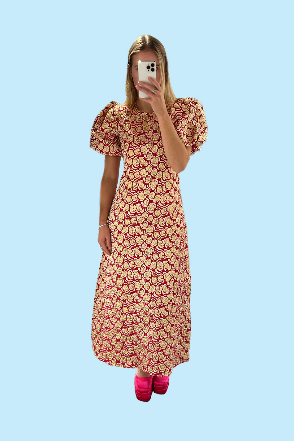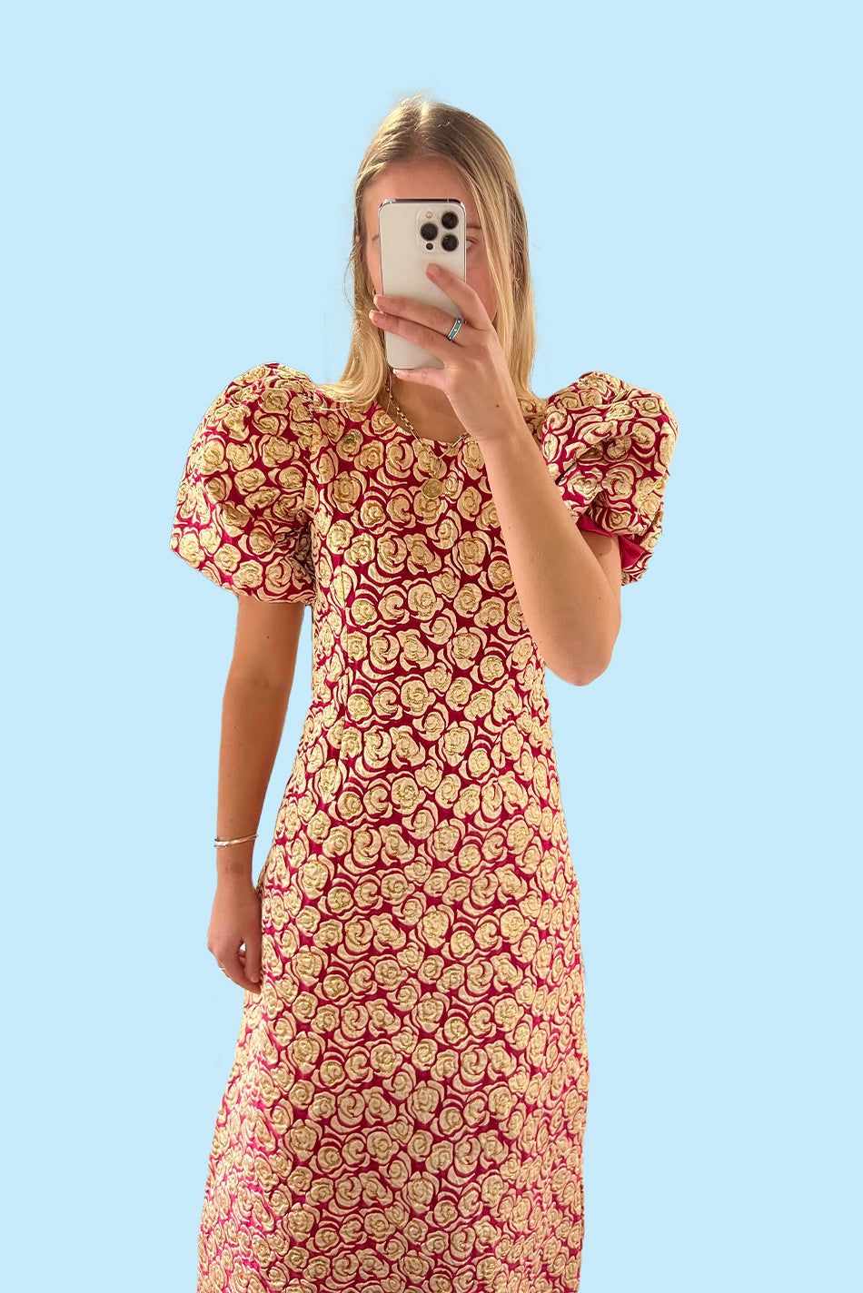 This midi pink and gold dress dress, designed in jacquard fabric adorned with metallic detailing that catches the light beautifully, is the perfect party outfit. Match with chunky gold heels for a killer look.