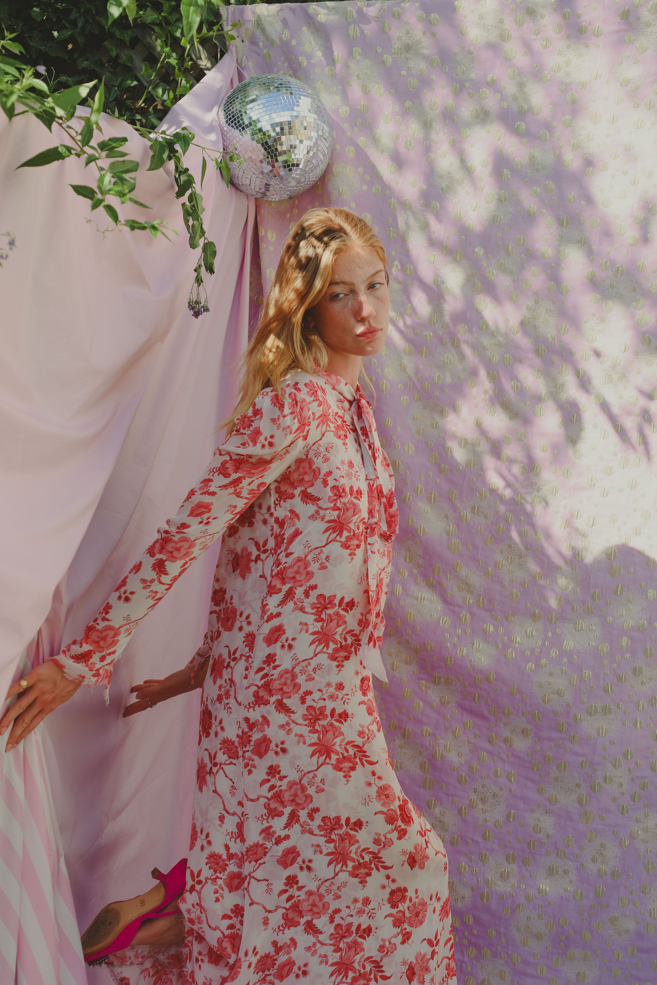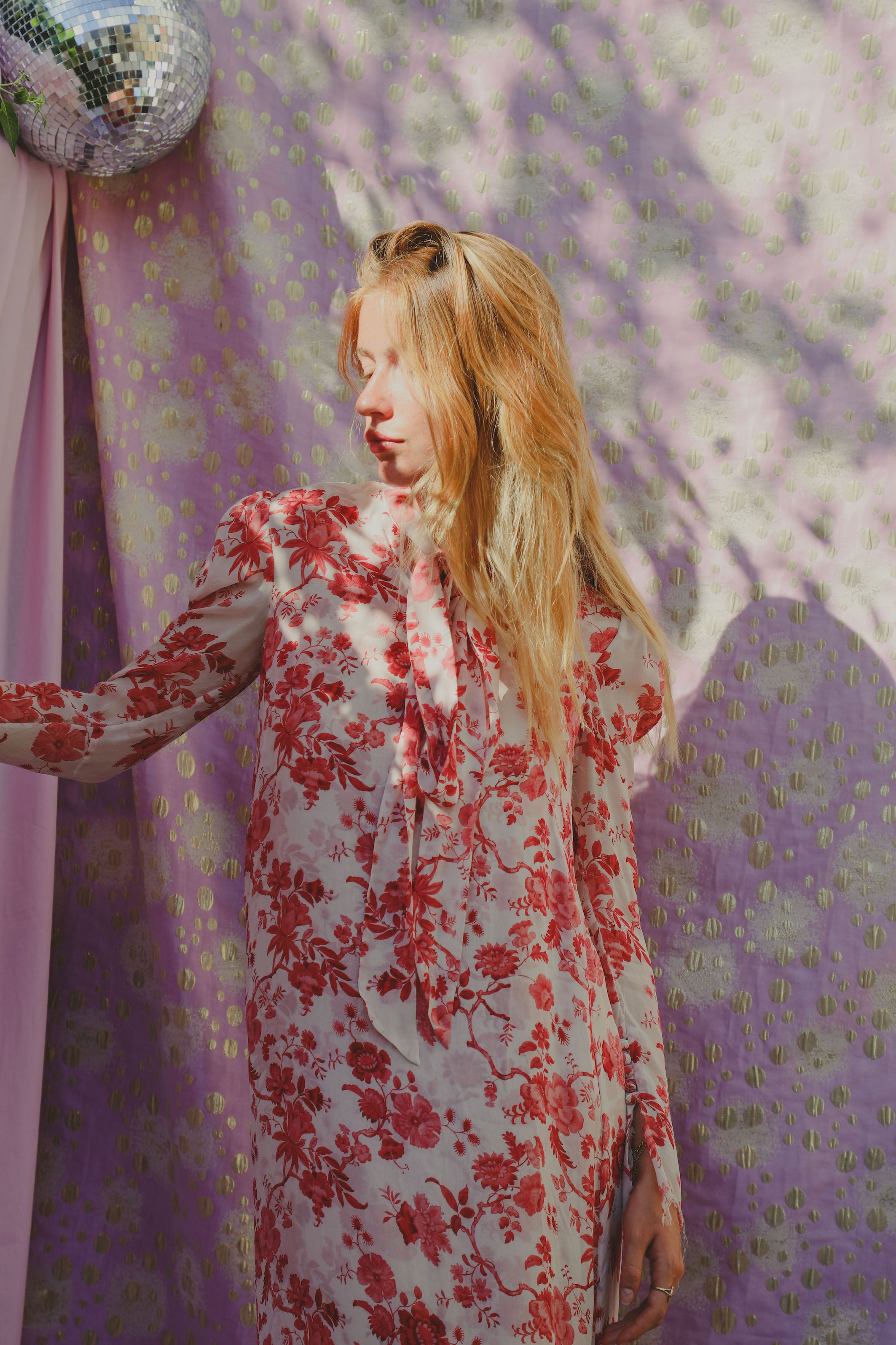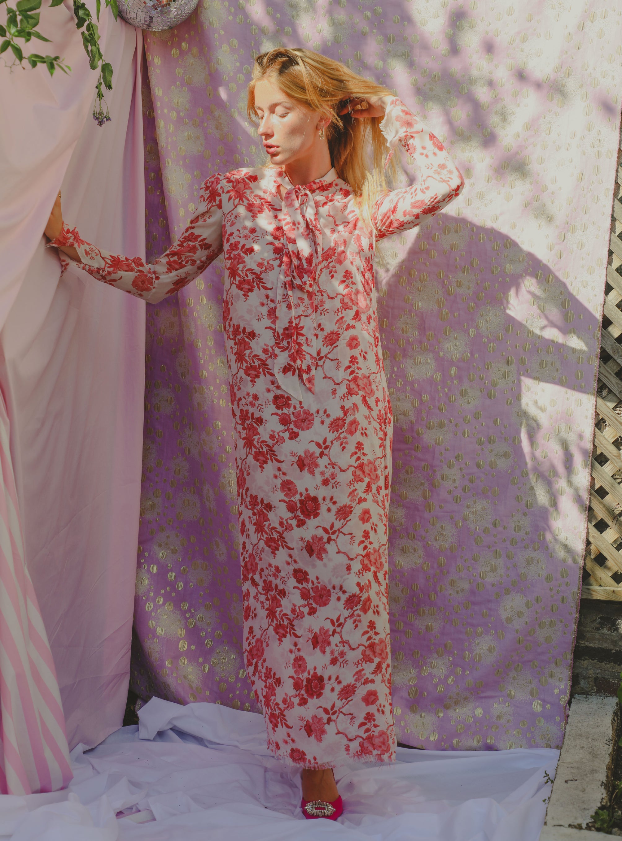 A floral print, 100% silk dress that is light and floaty. It has a pussy bow neck tie and zips up at the back.