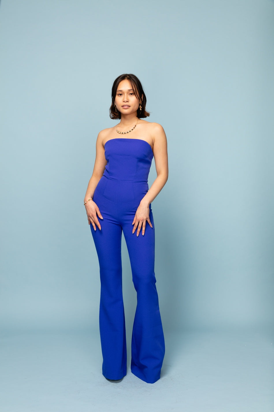 Sexy strapless jumpsuit, with figure-hugging material. This jumpsuit has a concealed zip at the back. NB there are some signs of wear to this jumpsuit, like bobbling or marks on the hem, which are not noticeable when on!
