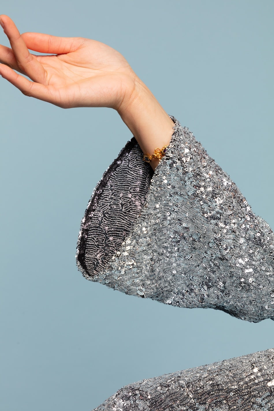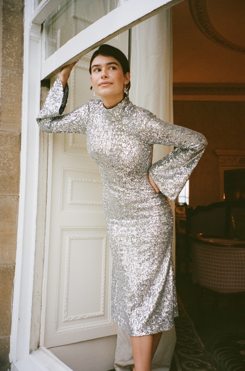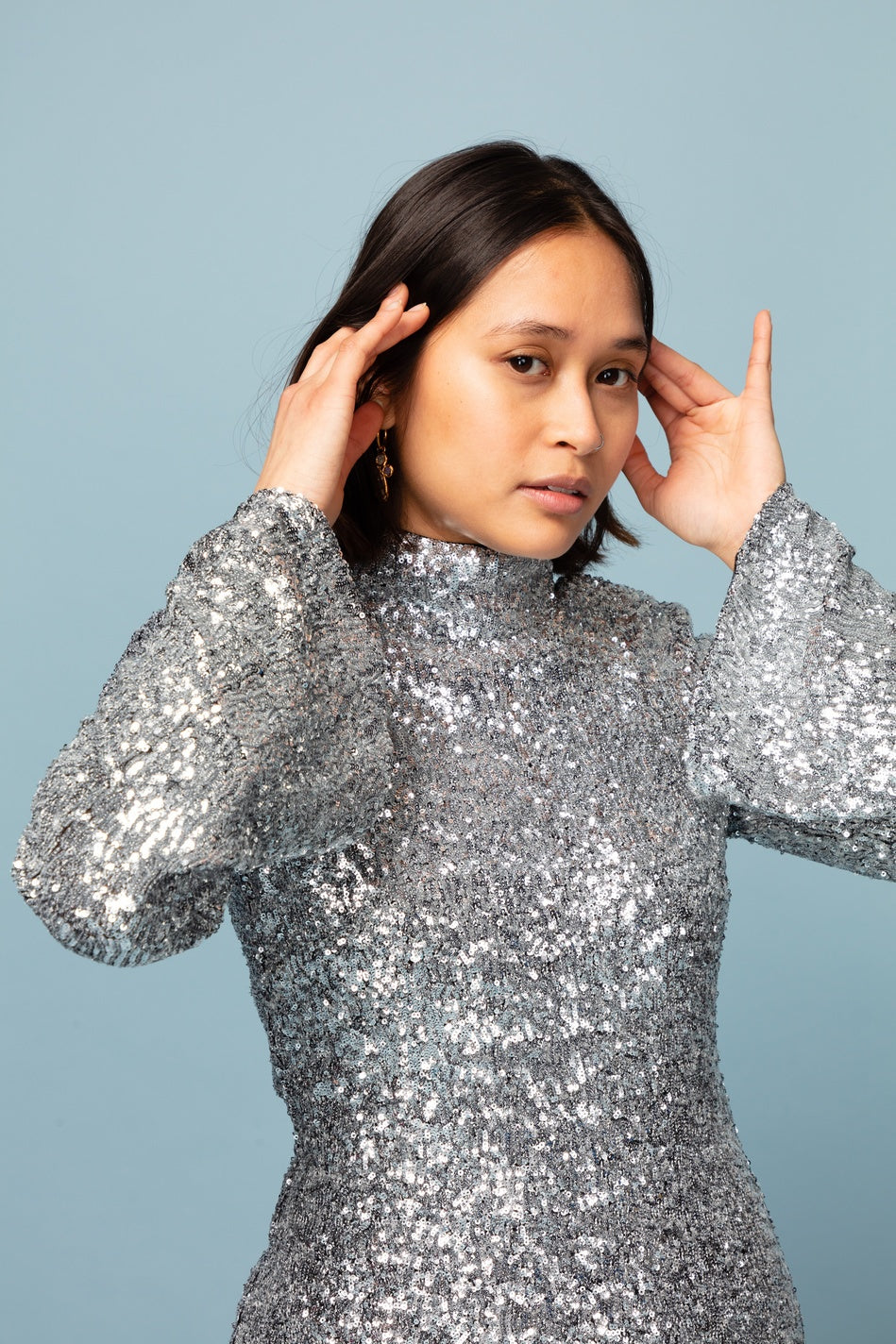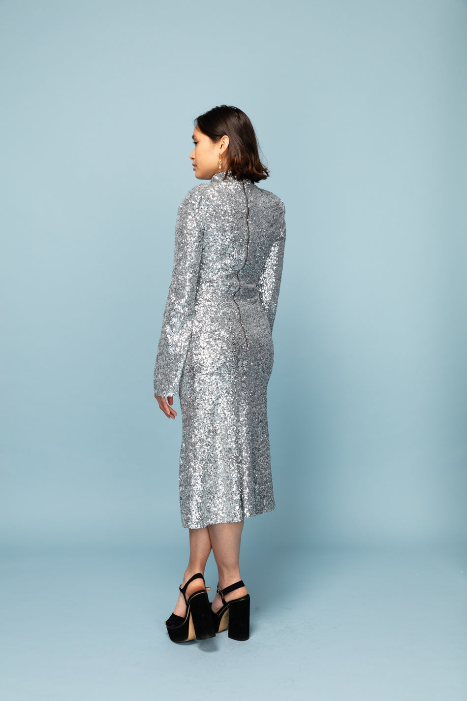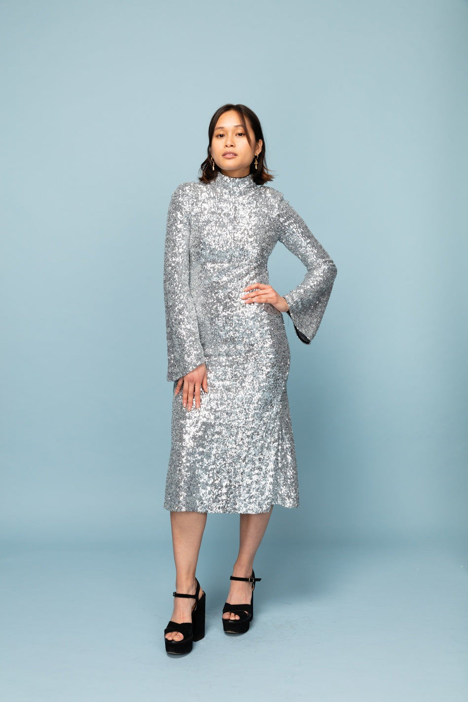 Statement dress, which although sequin, has a bit of stretch so fits to different body shapes. The sleeve is flared, and the neck is high. The zip is at the back