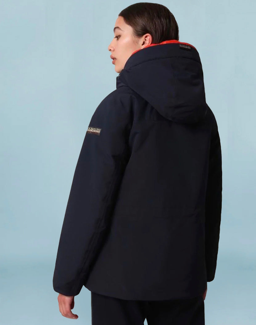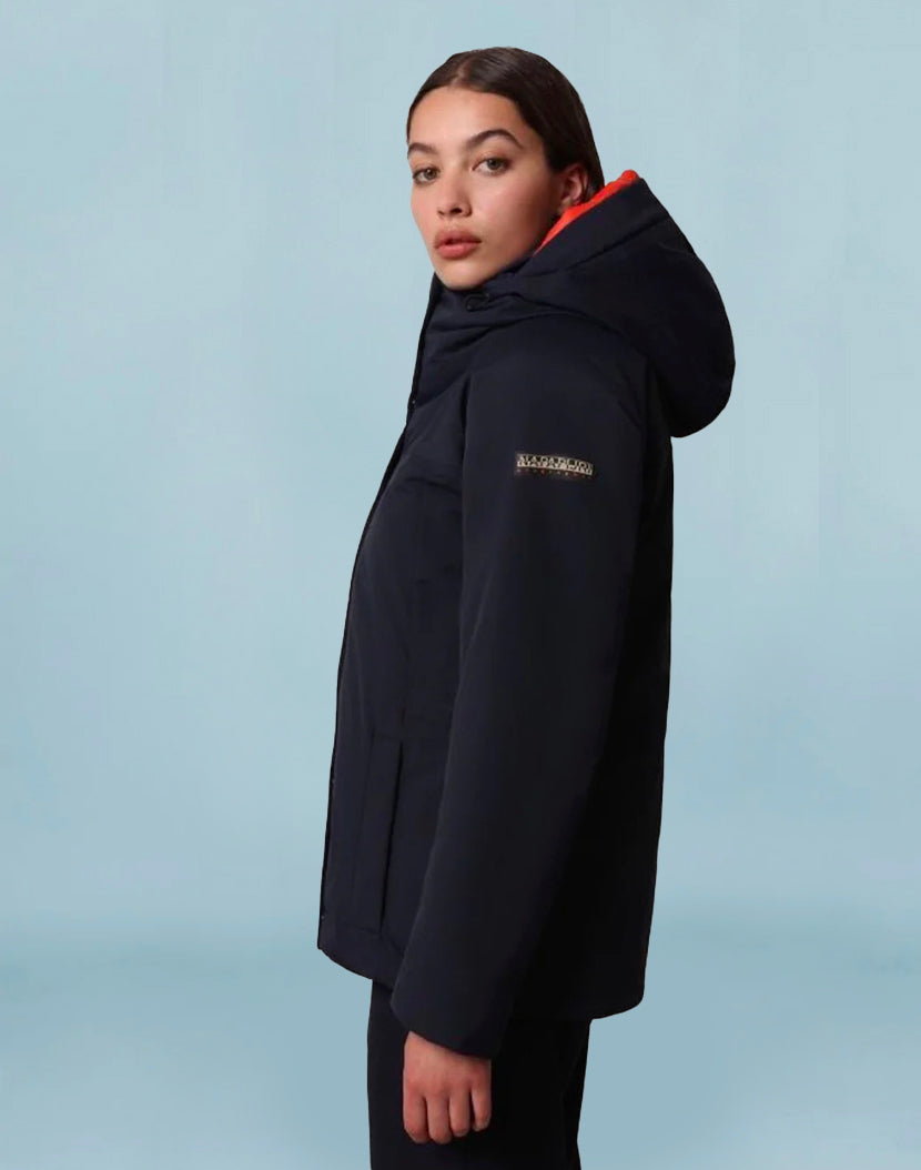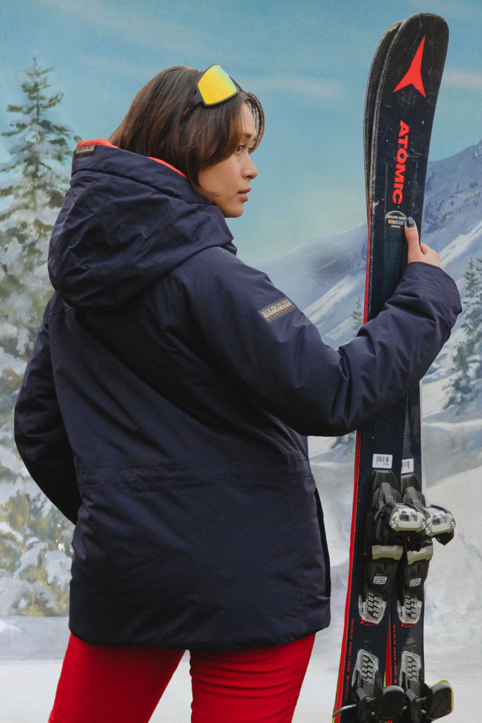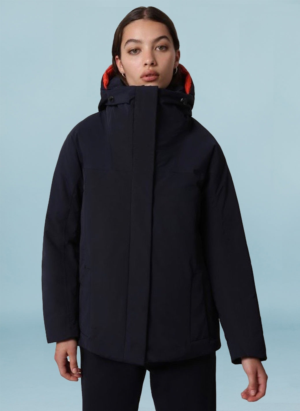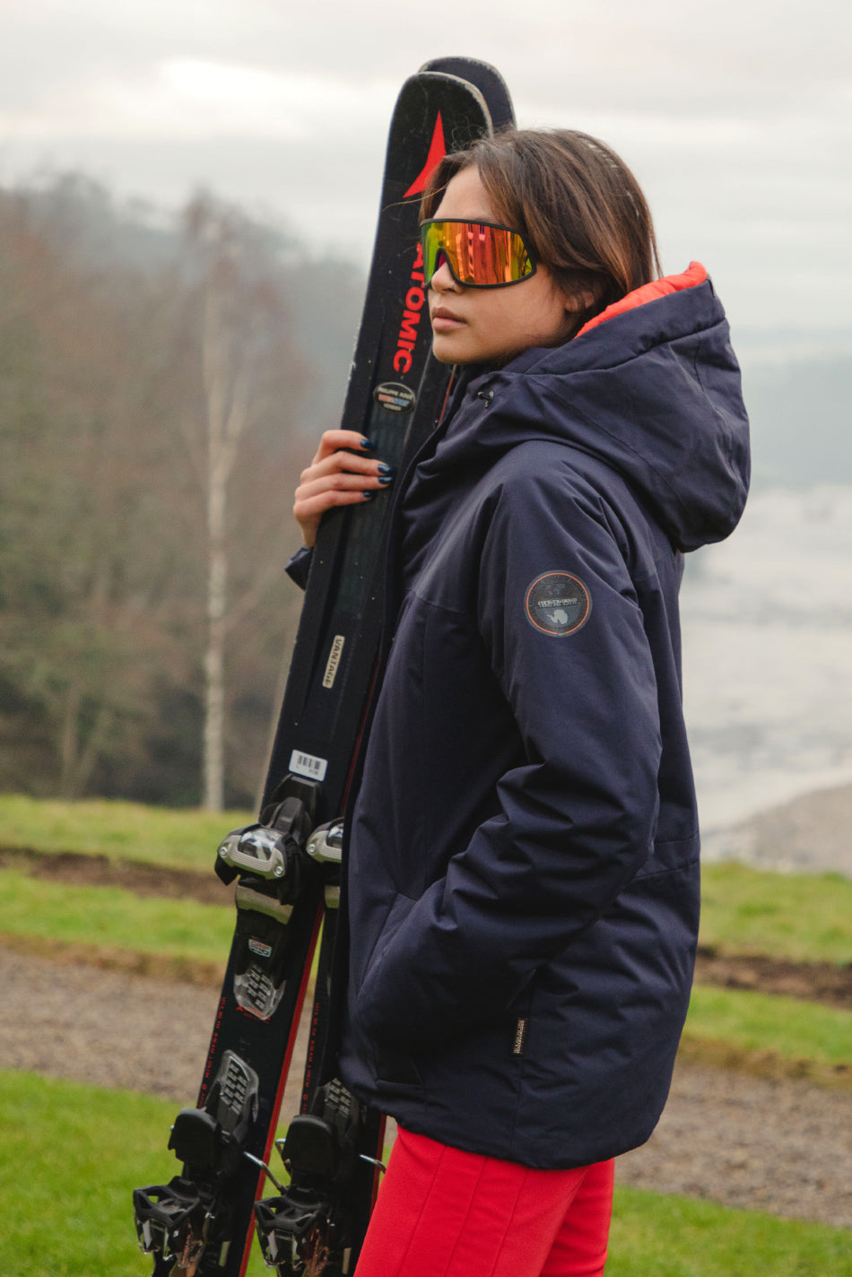Dark navy ski jacket with orange detailing and cosy fleece lined.