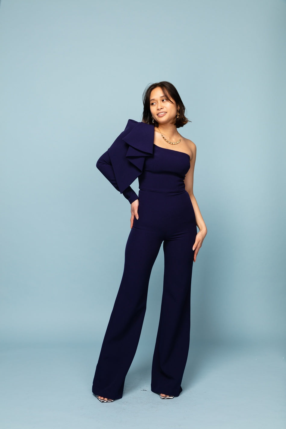 This sophisticated jumpsuit has elegant detailing on the shoulder. There is a zip at the end of the sleeve, so decide if you want it open or closed! There is a concealed side zip. NB - This jumpsuit has signs of wear - there is bobbling on the back. Get in touch if you would like photos/more info!