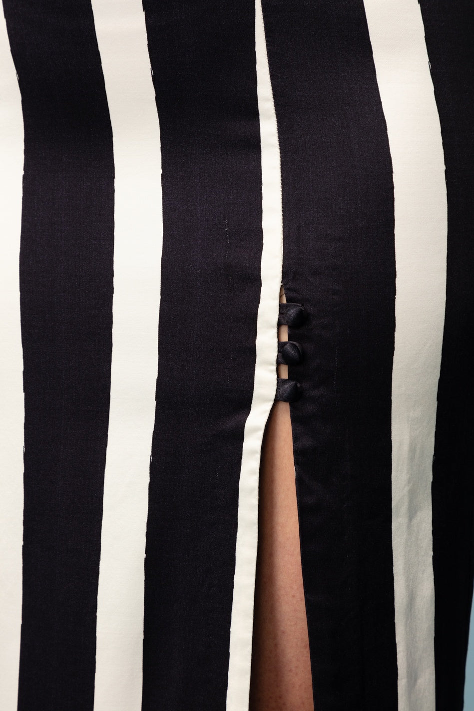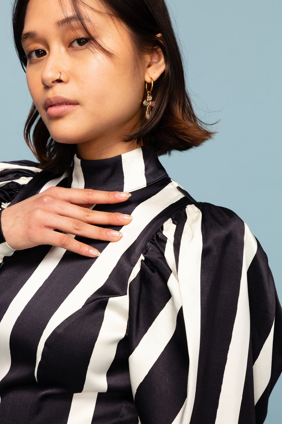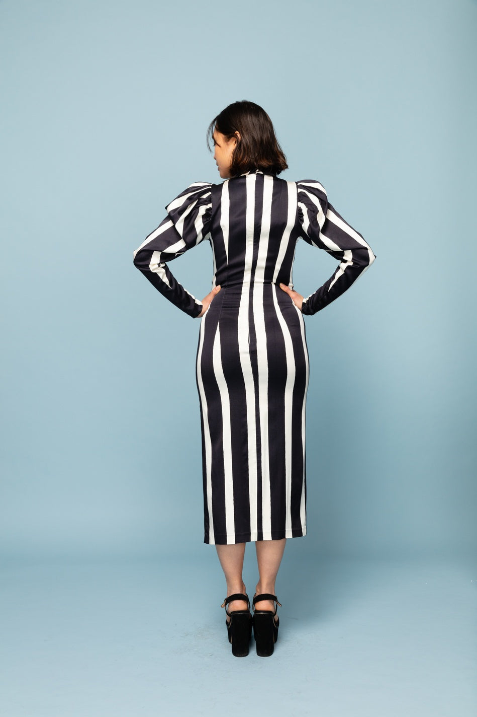 The funkiest dress, with outrageous puff sleeves and high neck. Concealed zip at the back, and sexy leg slit with beautiful button detailing