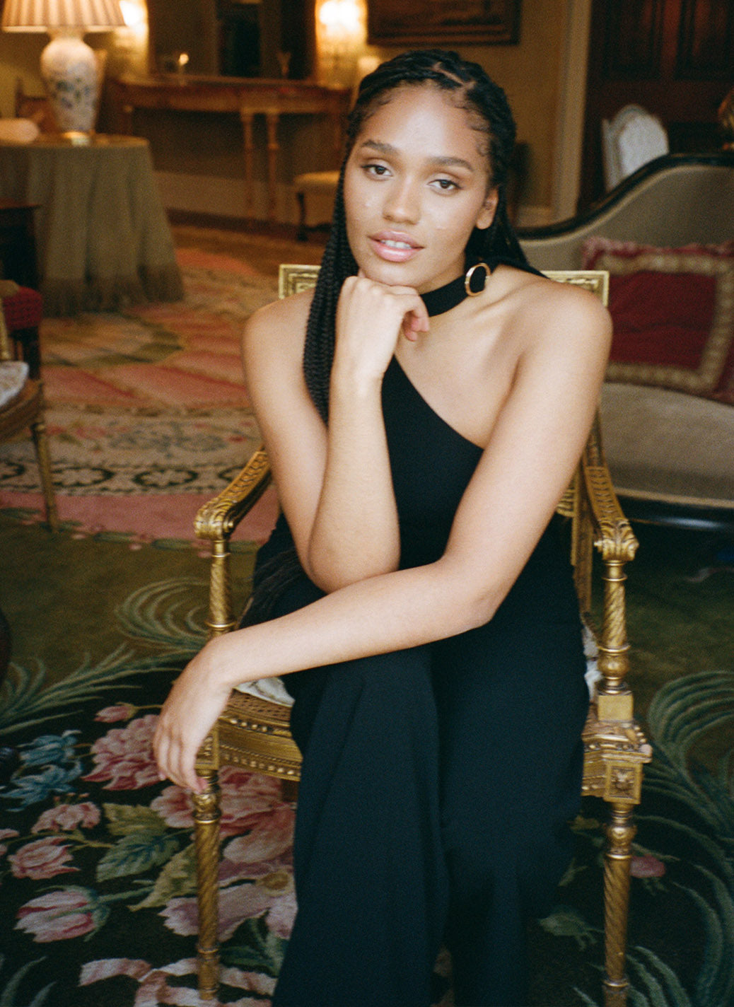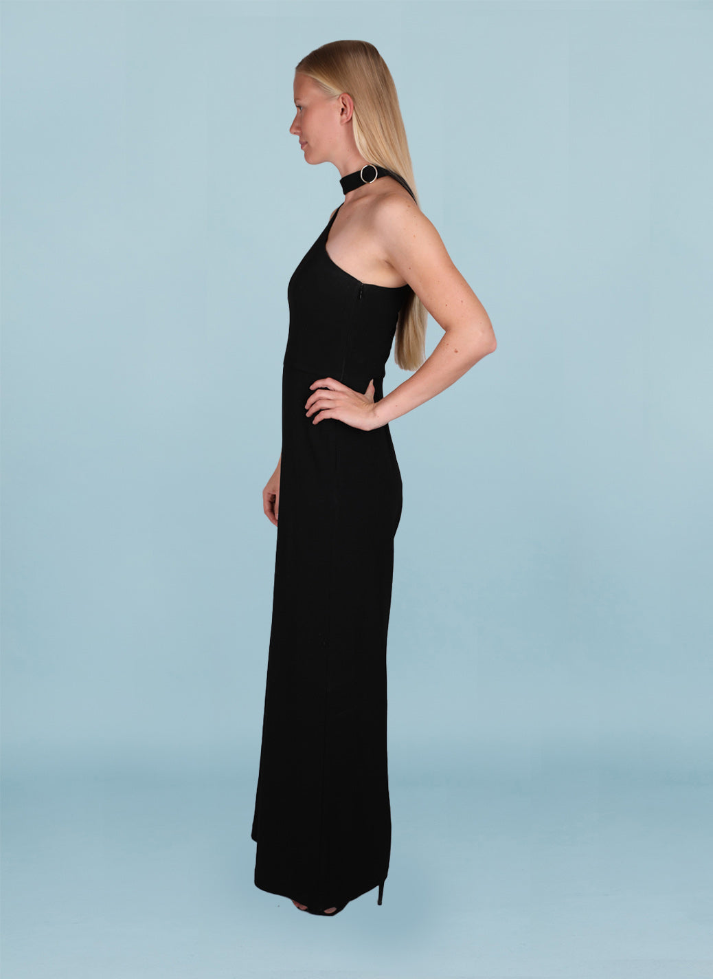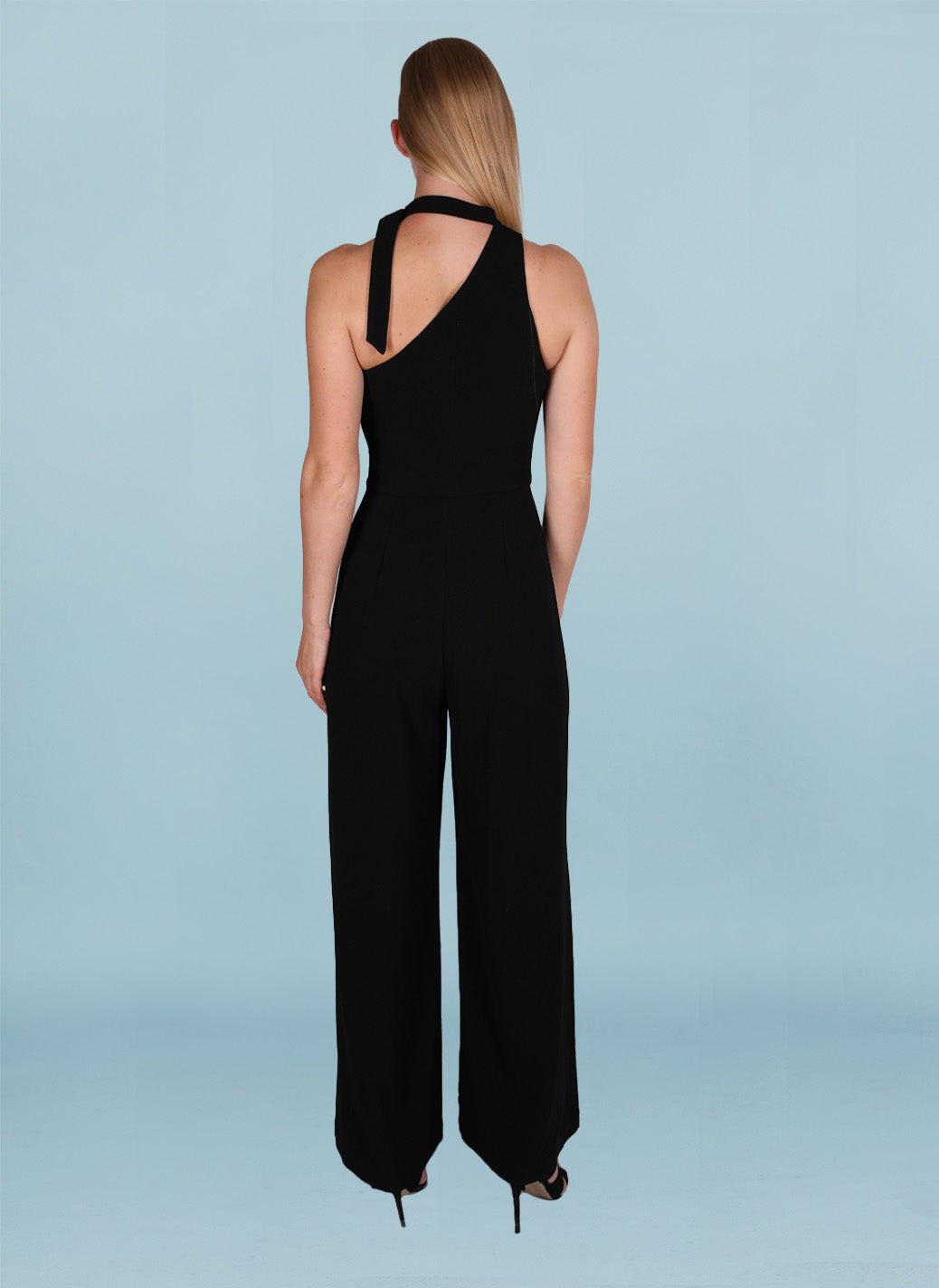 Black, textured, low-stretch crepe fabric. Fitted at the bodice with a wide leg silhouette. A flattering one-shoulder neckline with a fixed necktie with o-ring buckle and a concealed side zip closure
