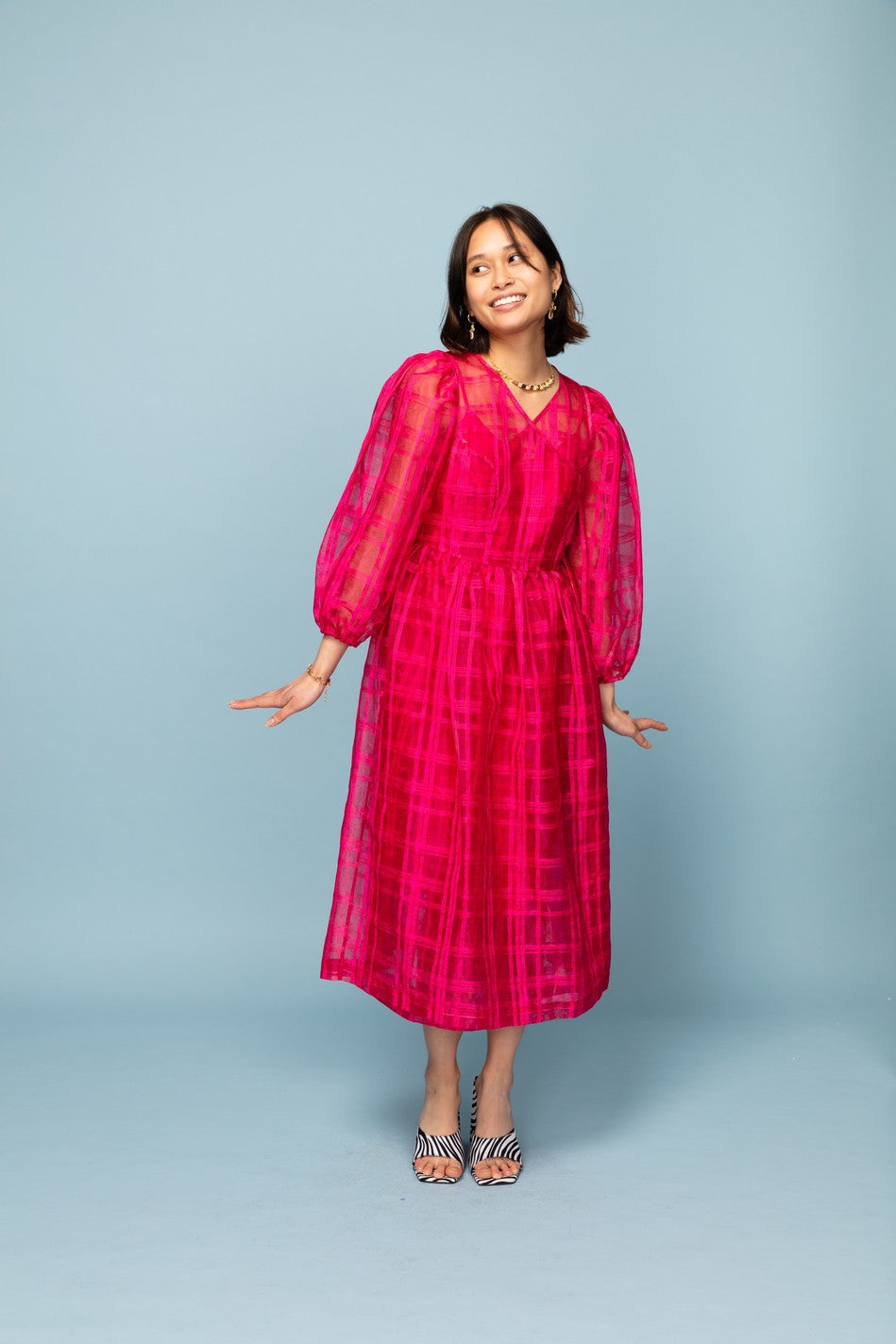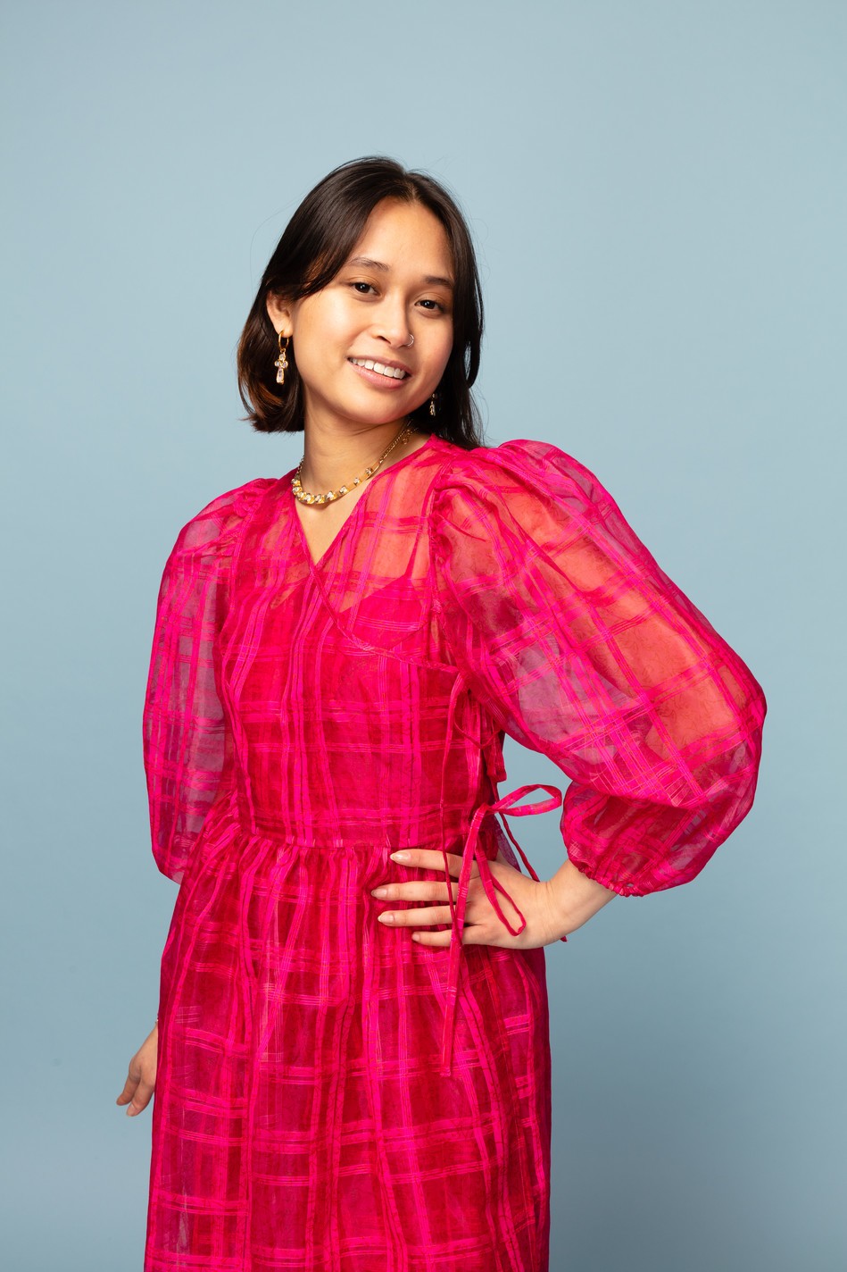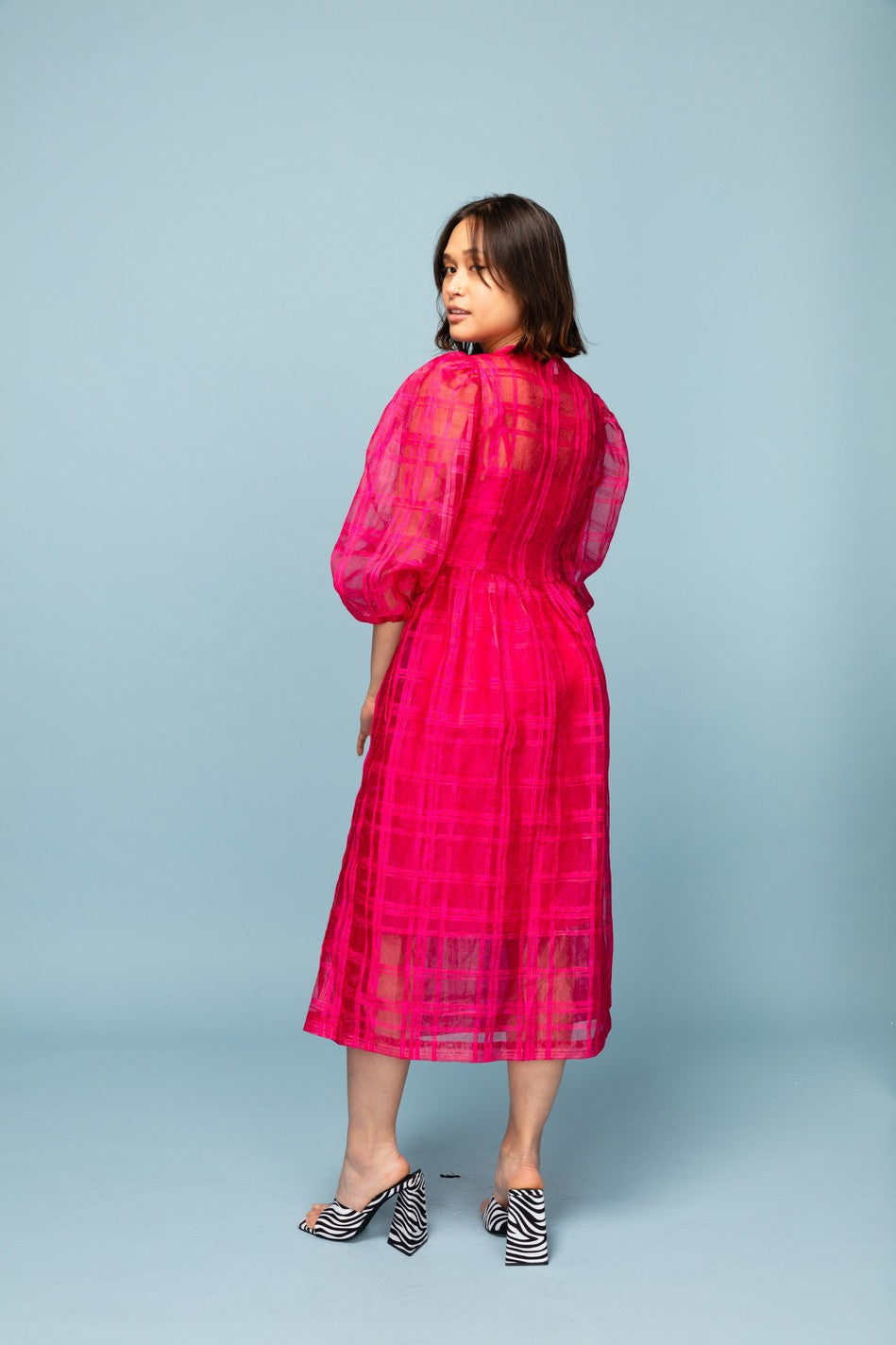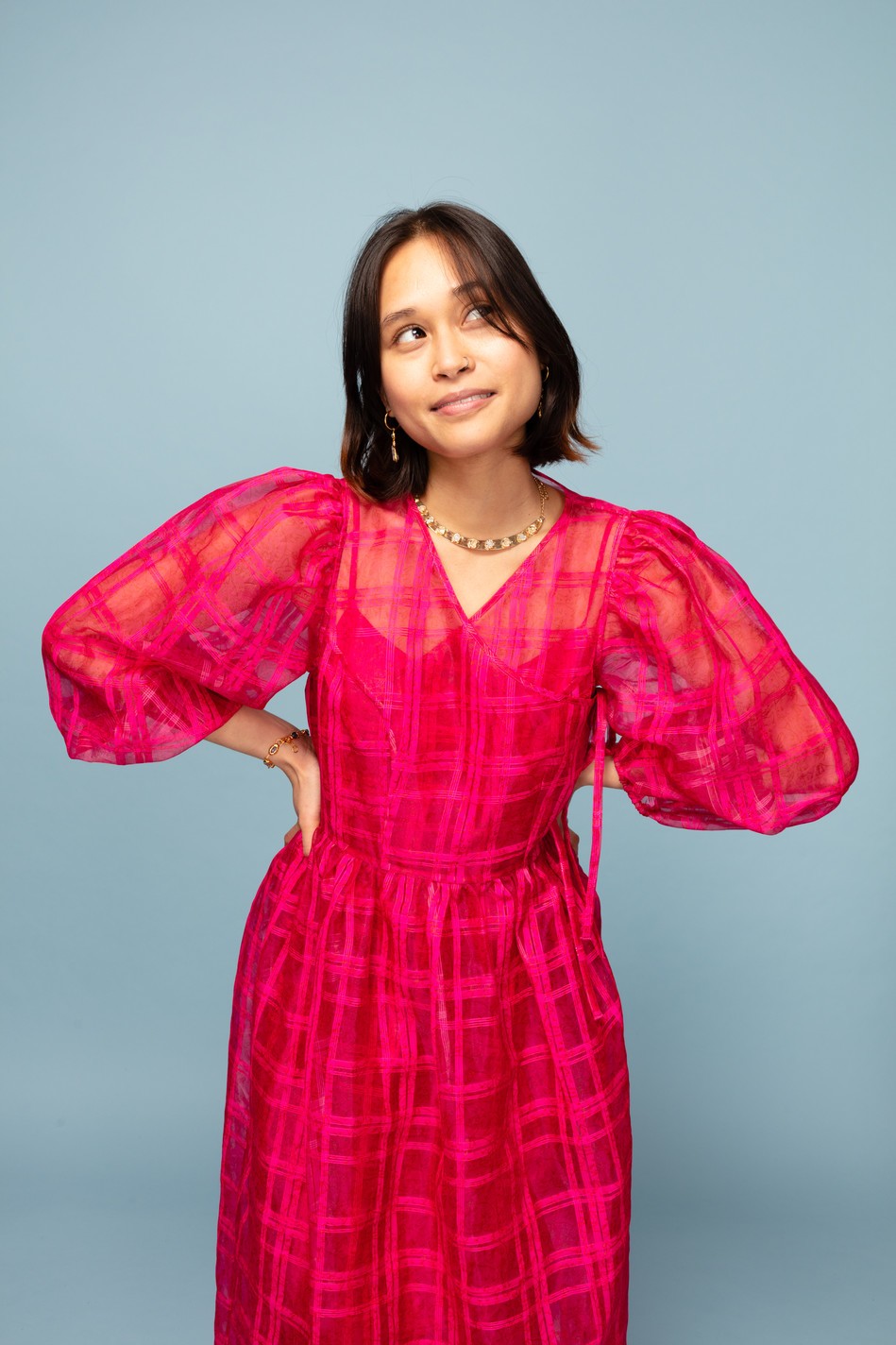 From the Spring/Summer 2020 season, this Shrimps dress is made from whisper-weight, checked organza with a hand drawn cat pattern. Underpinned by a crepe slip dress, it wraps and ties to create a flattering V-neckline enabling flexibly with sizing. It has voluminous cropped sleeves with fitted cuffs.