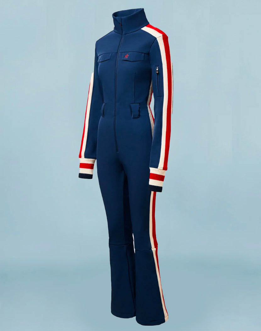 More retro vibes than your favourite vintage store, this suit is all about sliding down the slopes in style. With a contour fit and flattering stripe, it's the kind of one-piece that looks just as good at sunset drinks. Its thermal fleece lining means no need for layering on milder days, plus it includes a ski pass pocket. Adhesive layers which enhances durability when encountering percpiration. NB there is no belt with this ski suit.
