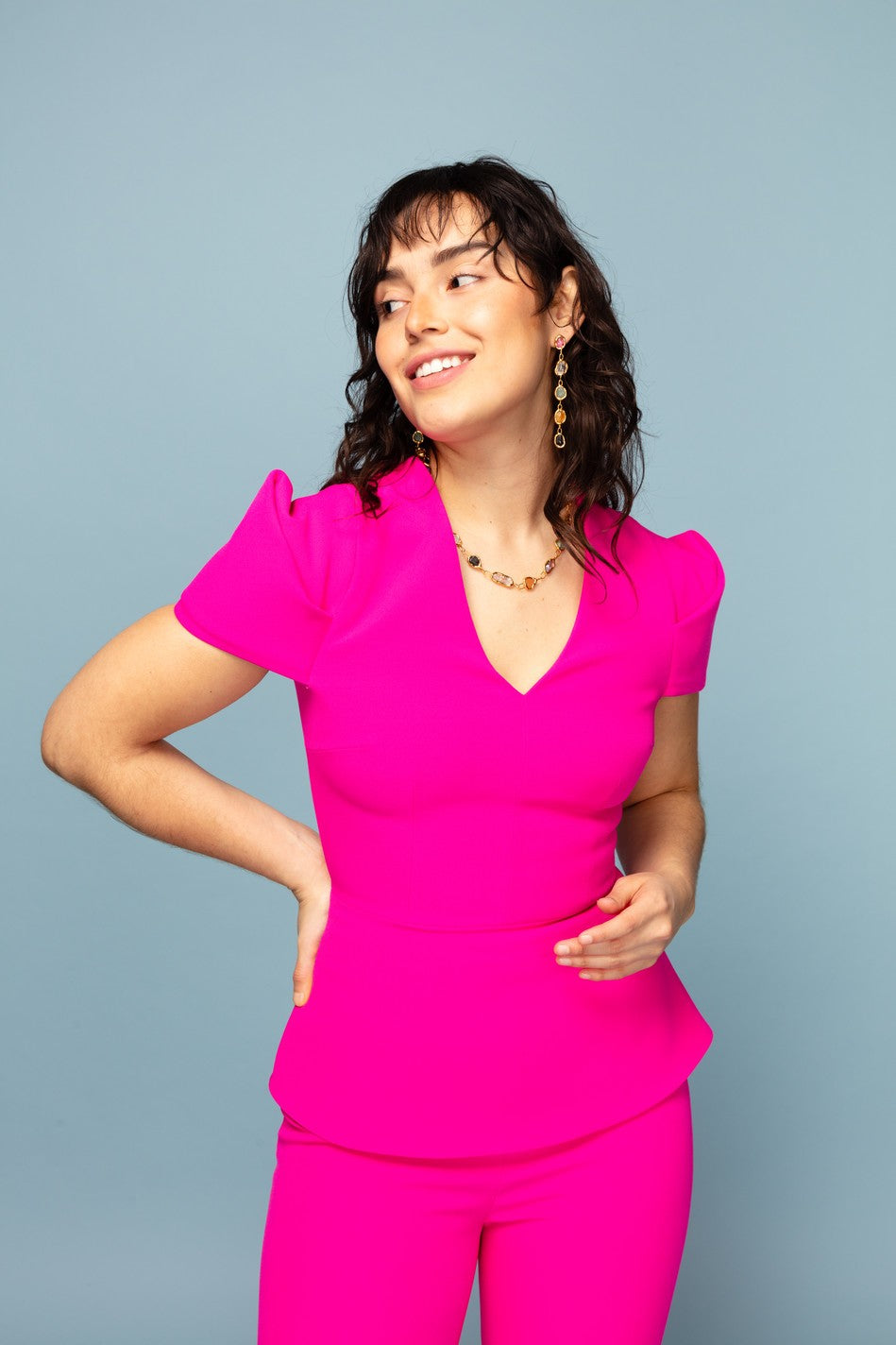 Hot pink, slightly flared leg trousers with side zip. V-Neck top with dramatic shoulders.