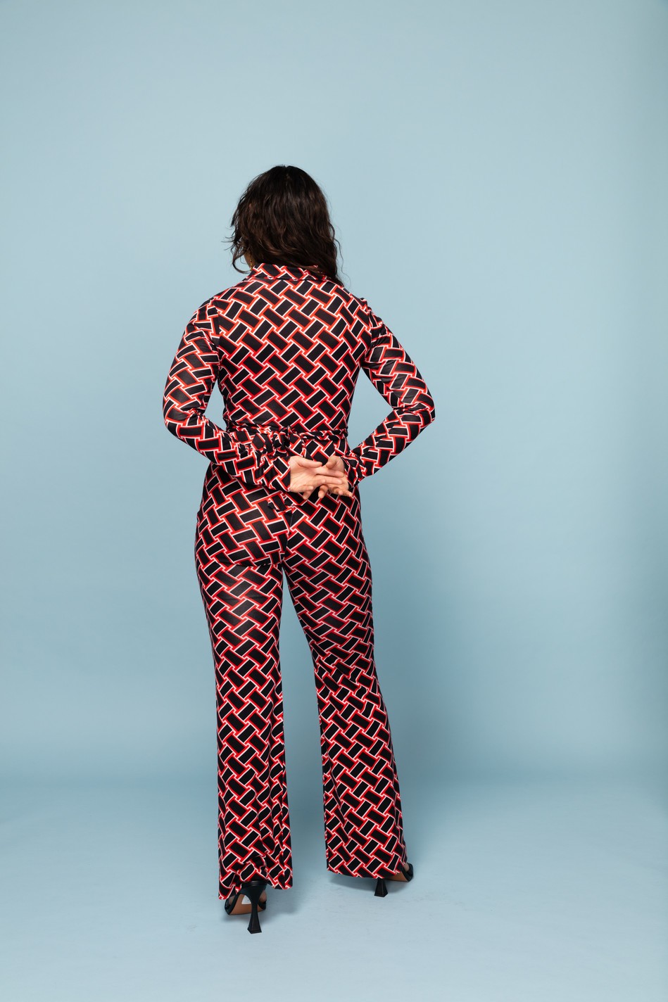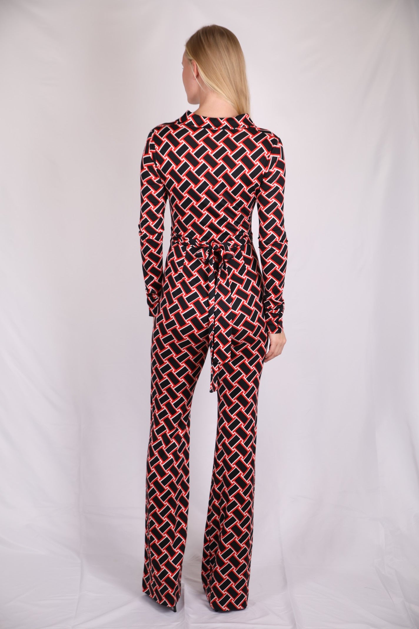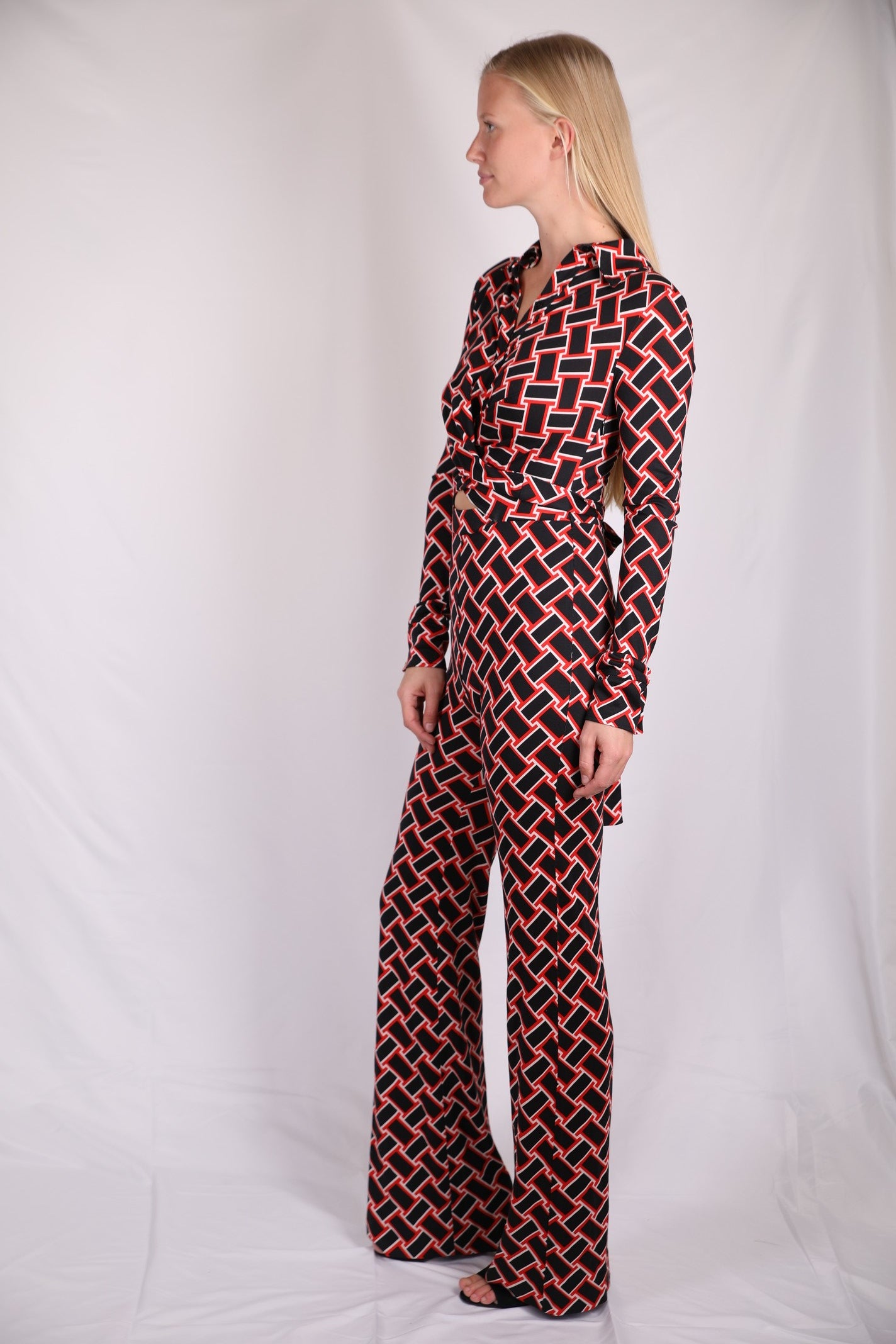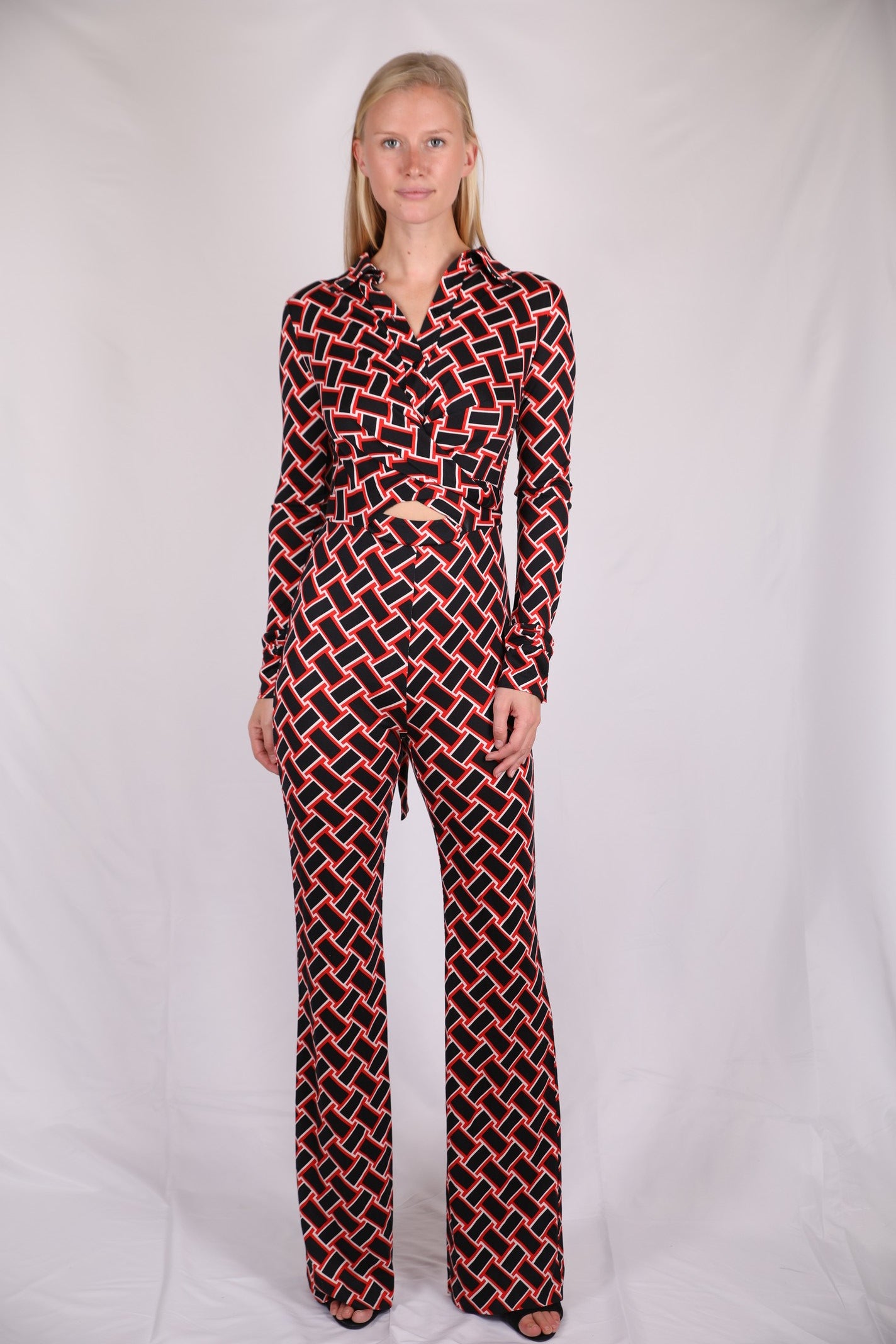 Geometric black and white diamond pattern on red, designed on a mid-weight fabric which is stretchy and unbelievably comfortable! Collar neckline, with up-turned cuffs. Front fastening with black buttons, and loose legs.