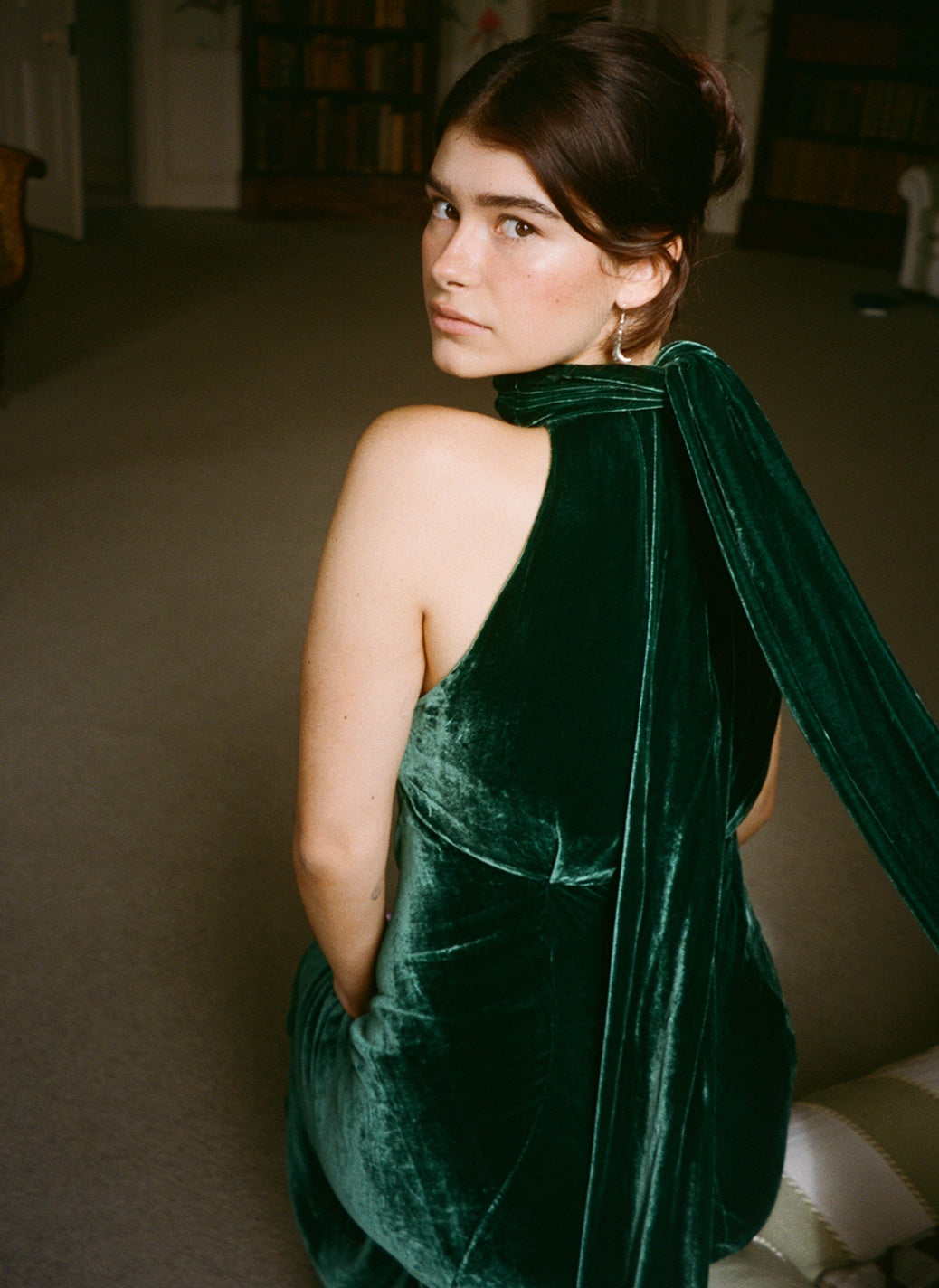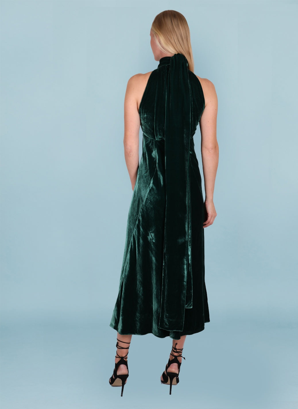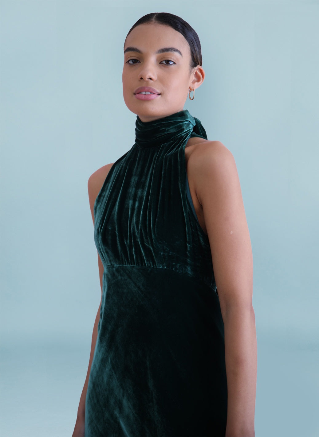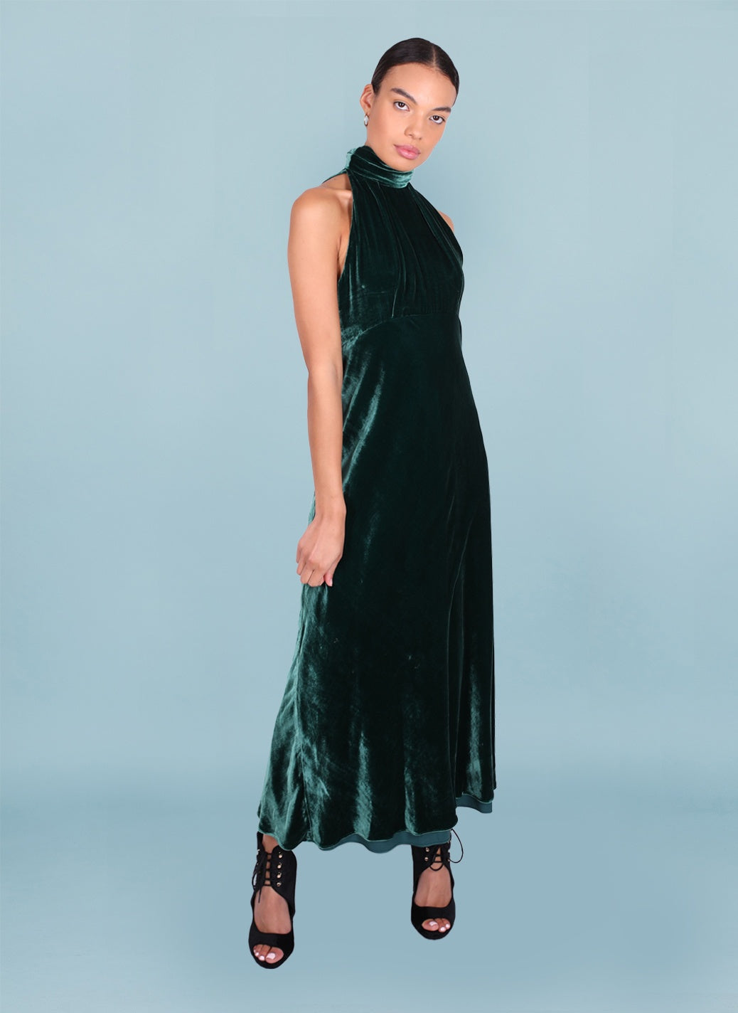 High neck velvet dress, which ties in a knot at the neck, with the strands hanging loose to the bottom of the dress. Option to hook the dress closed at the back, or leave it slightly open