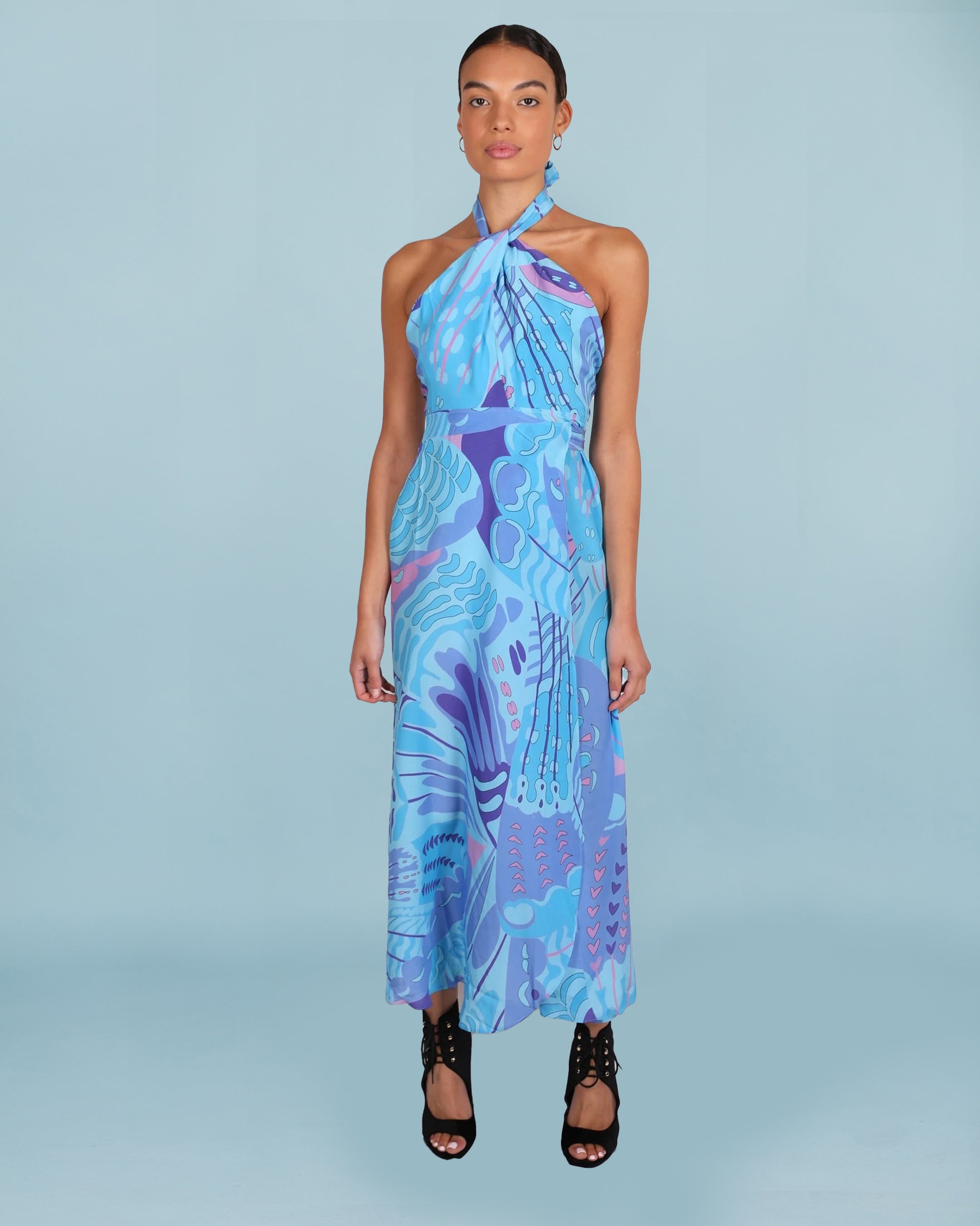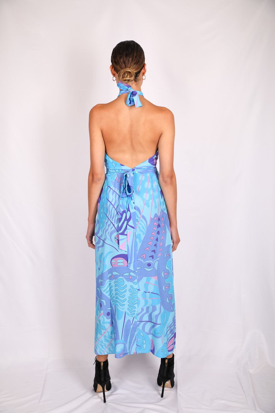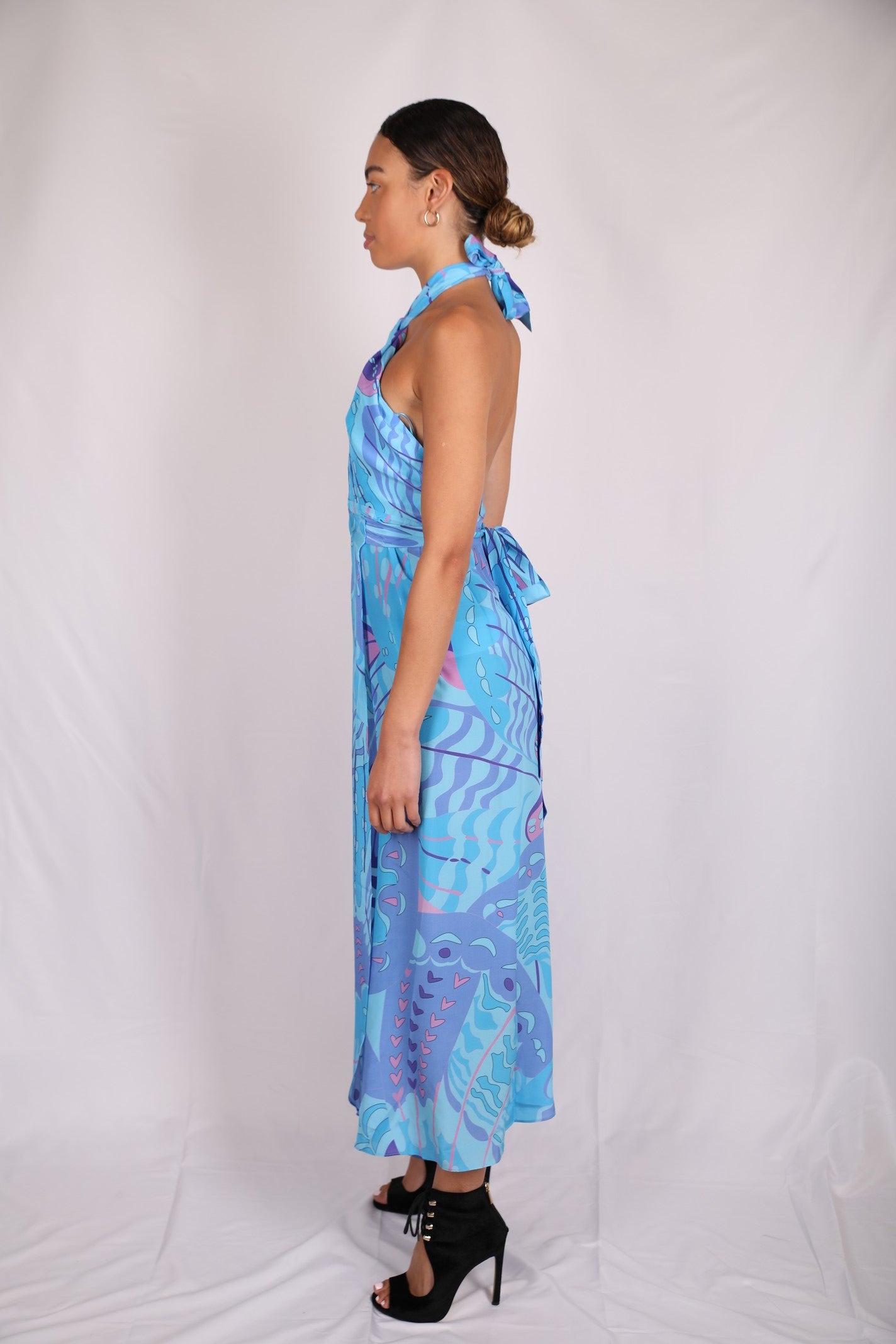 Super fun halter-neck dress, with sexy backless element. This dress ties round the neck, and is also wrap around the midriff, so is very adjustable size wise