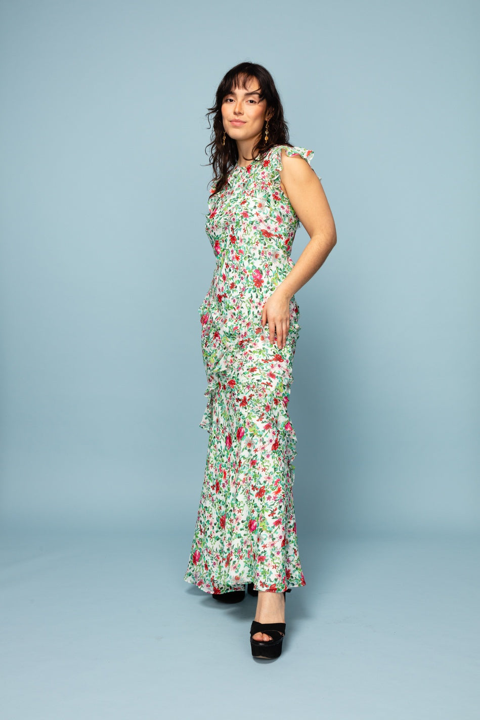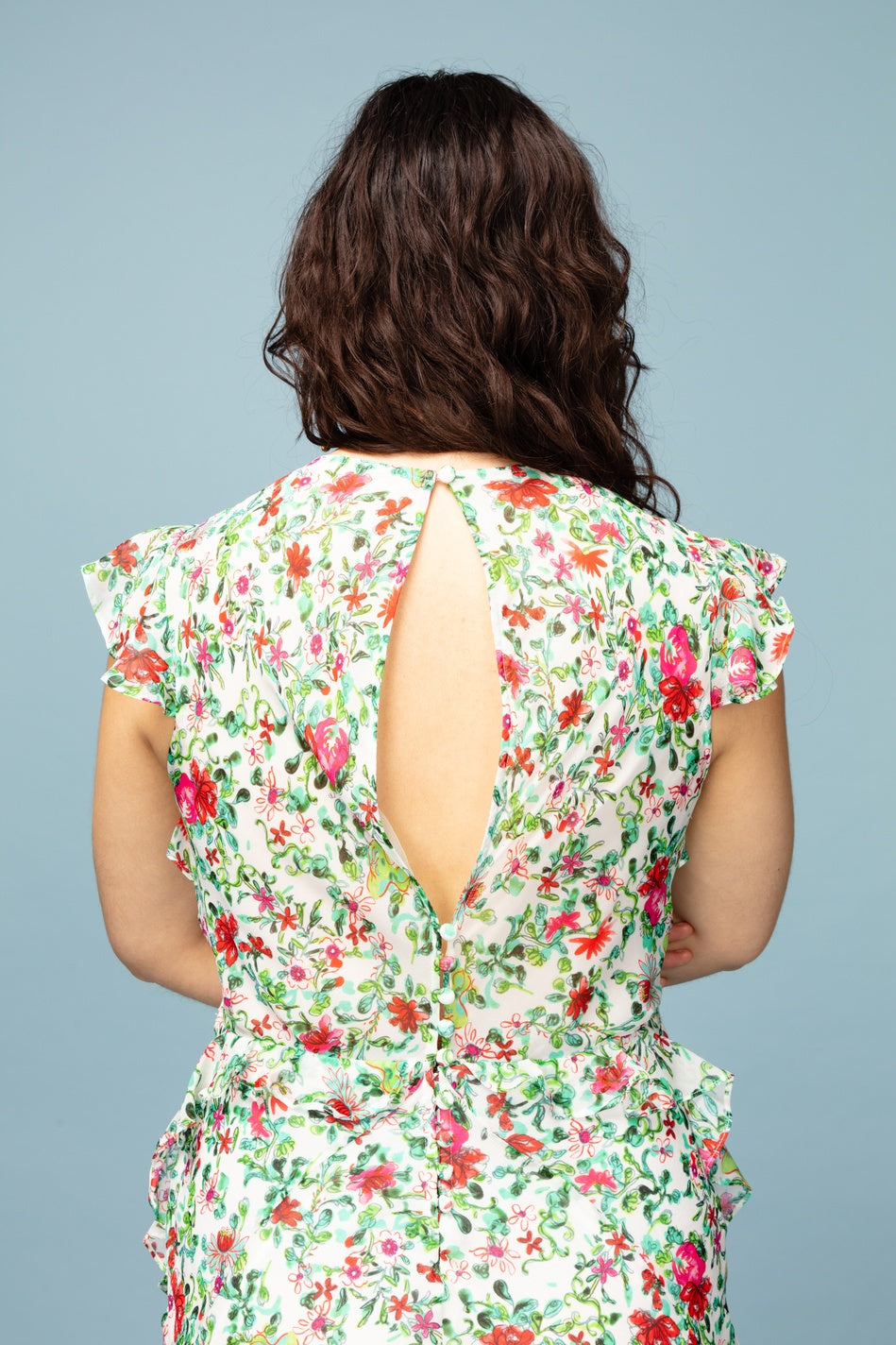 Gorgeous round neck dress, with slight subtle ruffles and beautiful buttoning deatil at the back