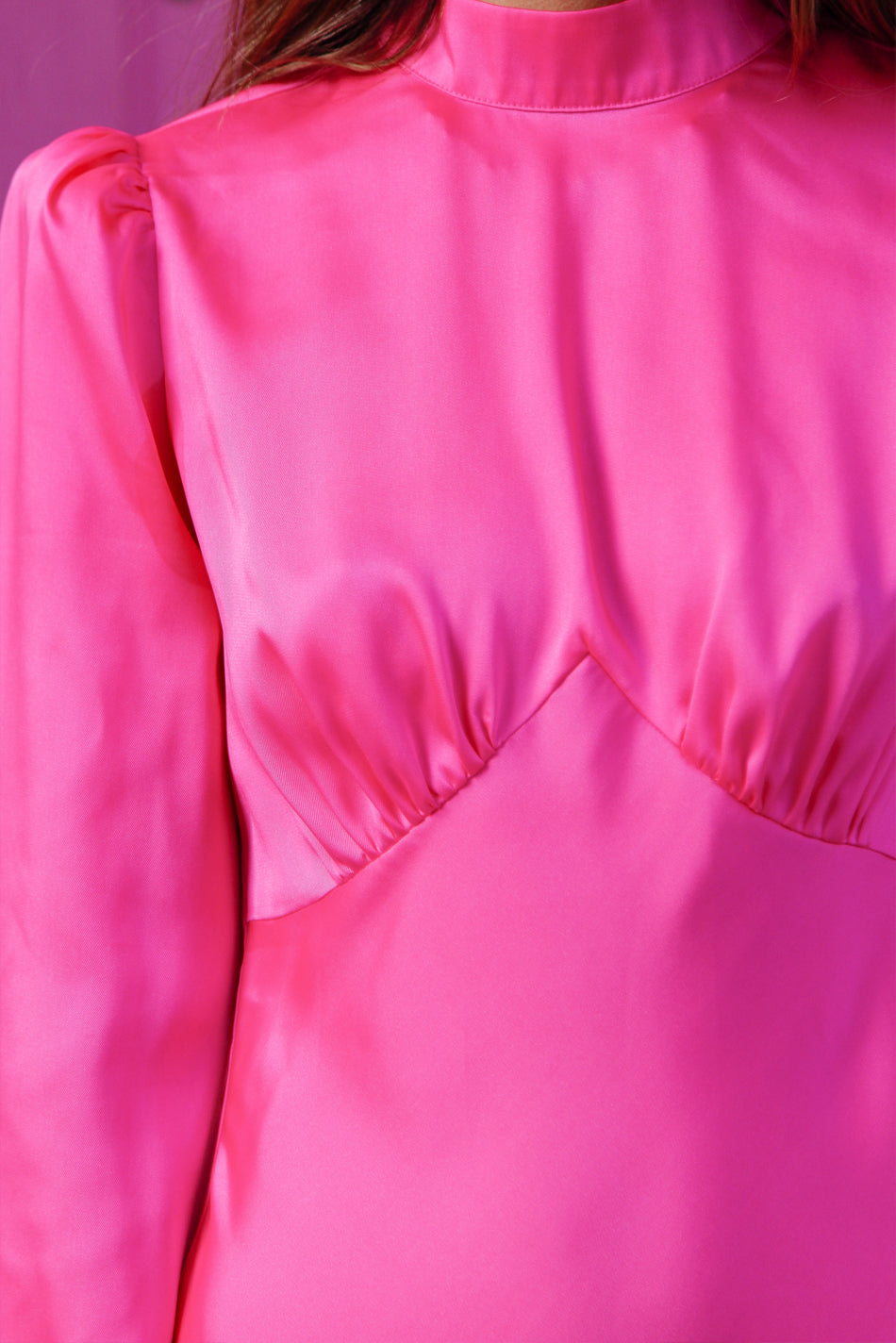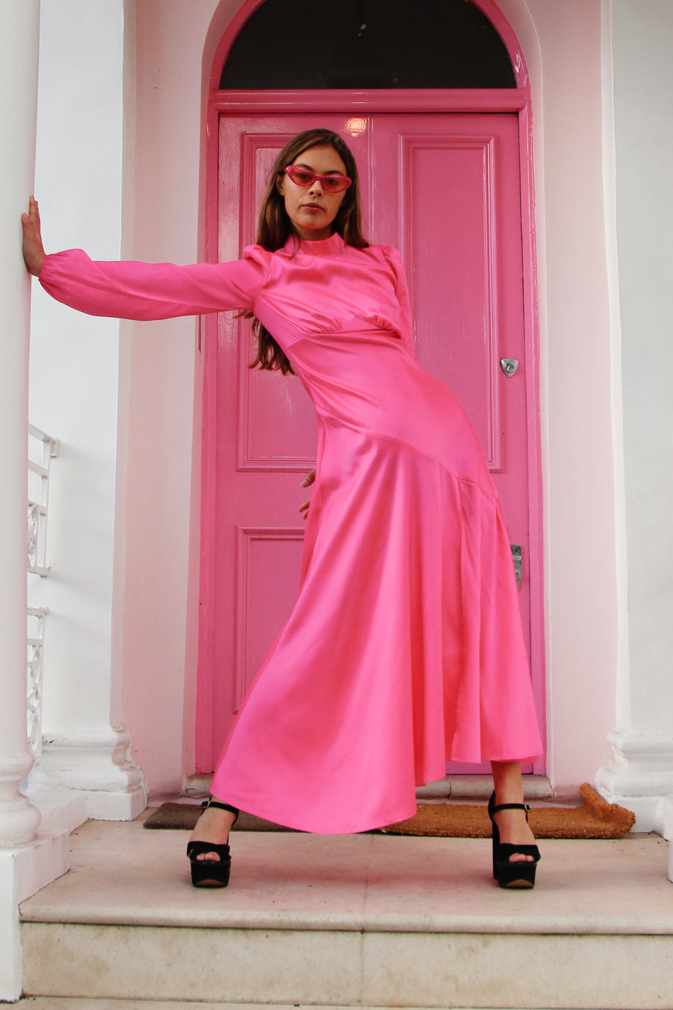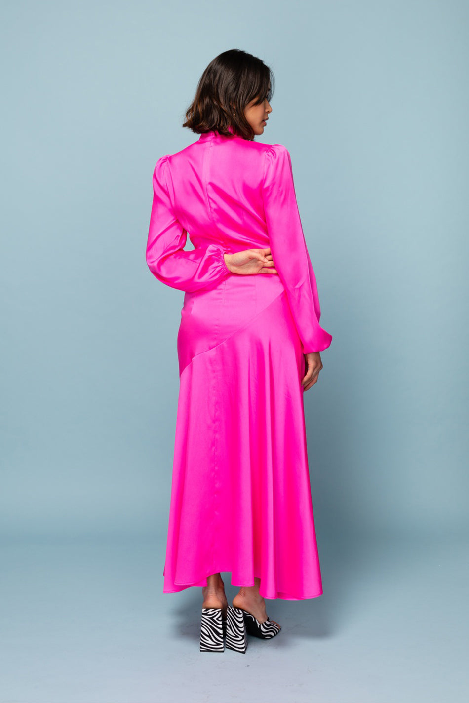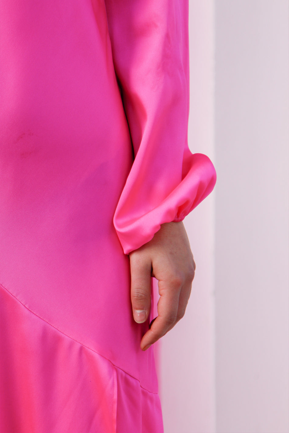 This hot pink dress is cut on the bias to create a beautifully falling feminine silhouette. It has elasticated cuffs and a concealed zip fastening along the back. NB the price of this item has been reduced due to markings
