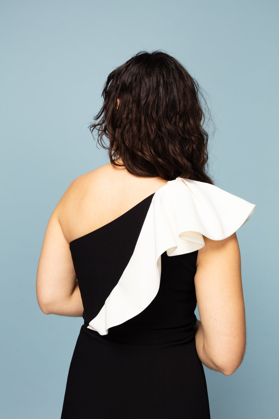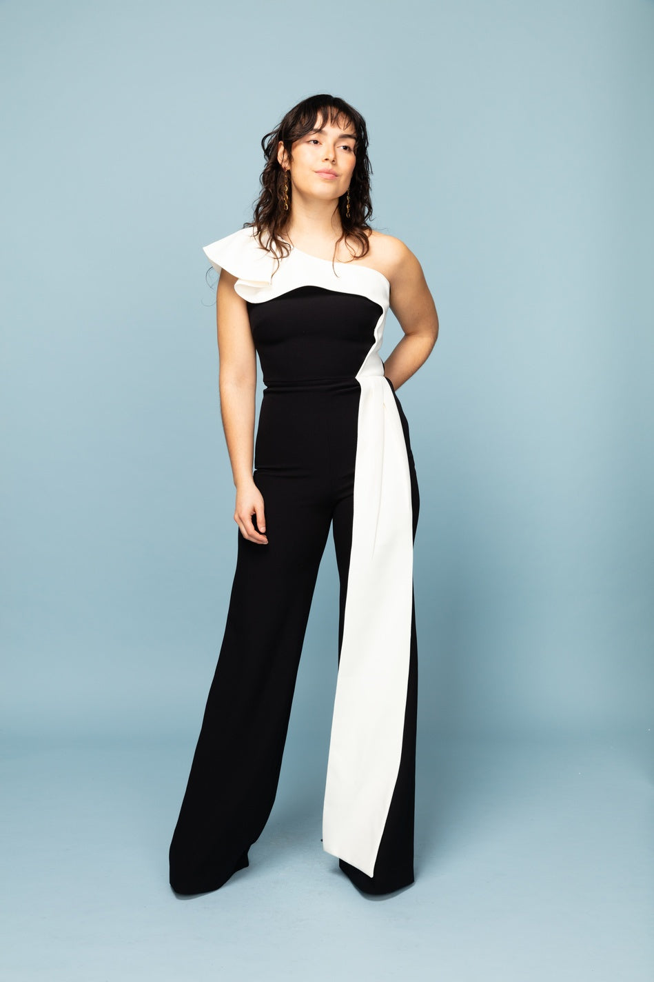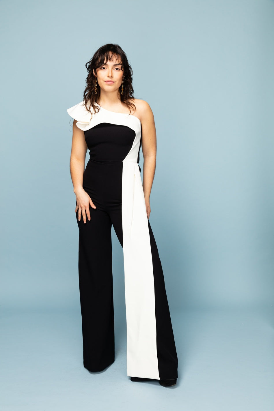 Elegant jumpsuit, with one-shoulder and concealed zip. The white sash hangs loose from the jumpsuit