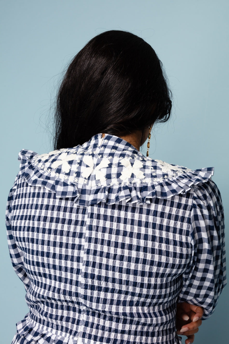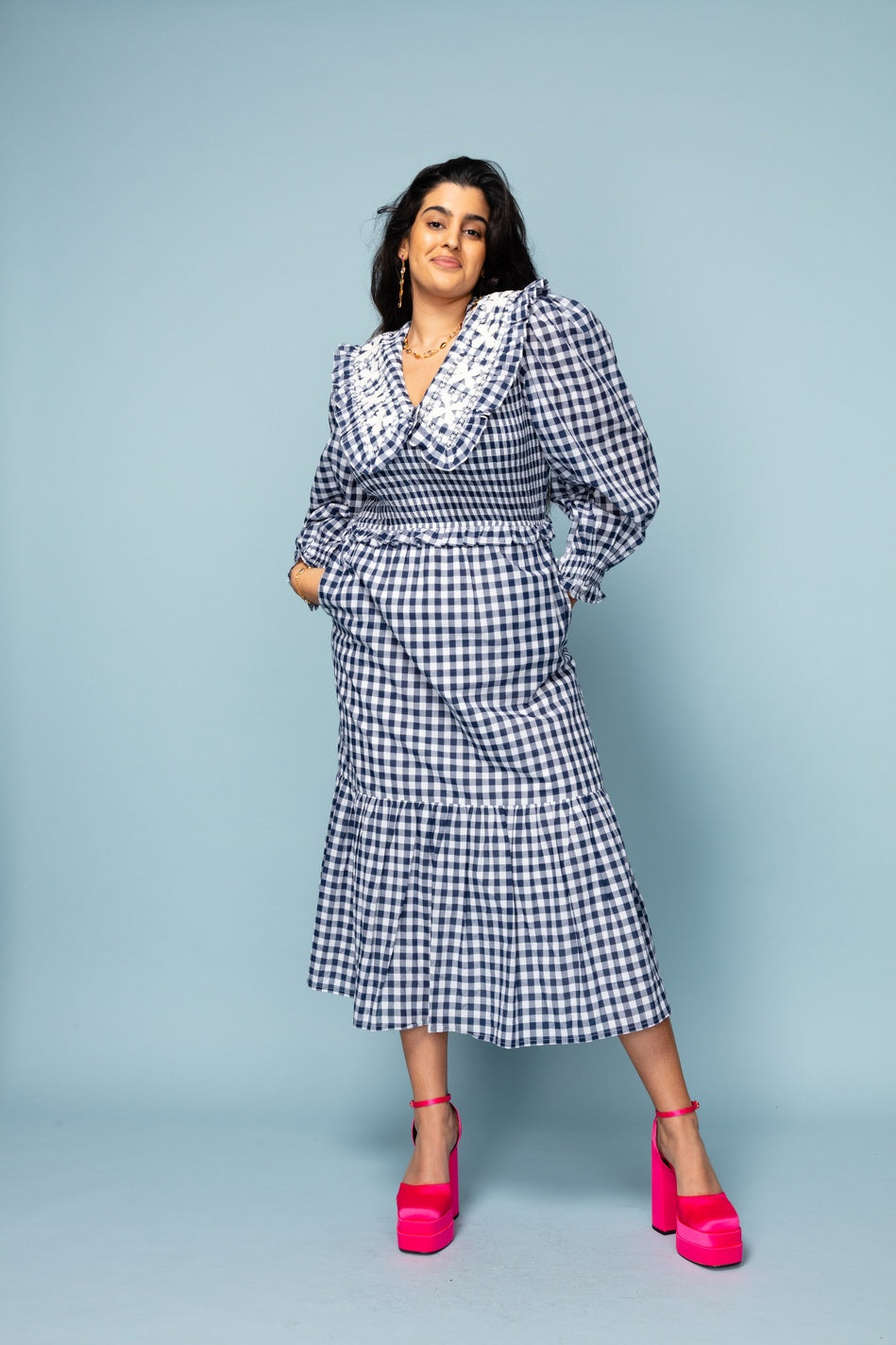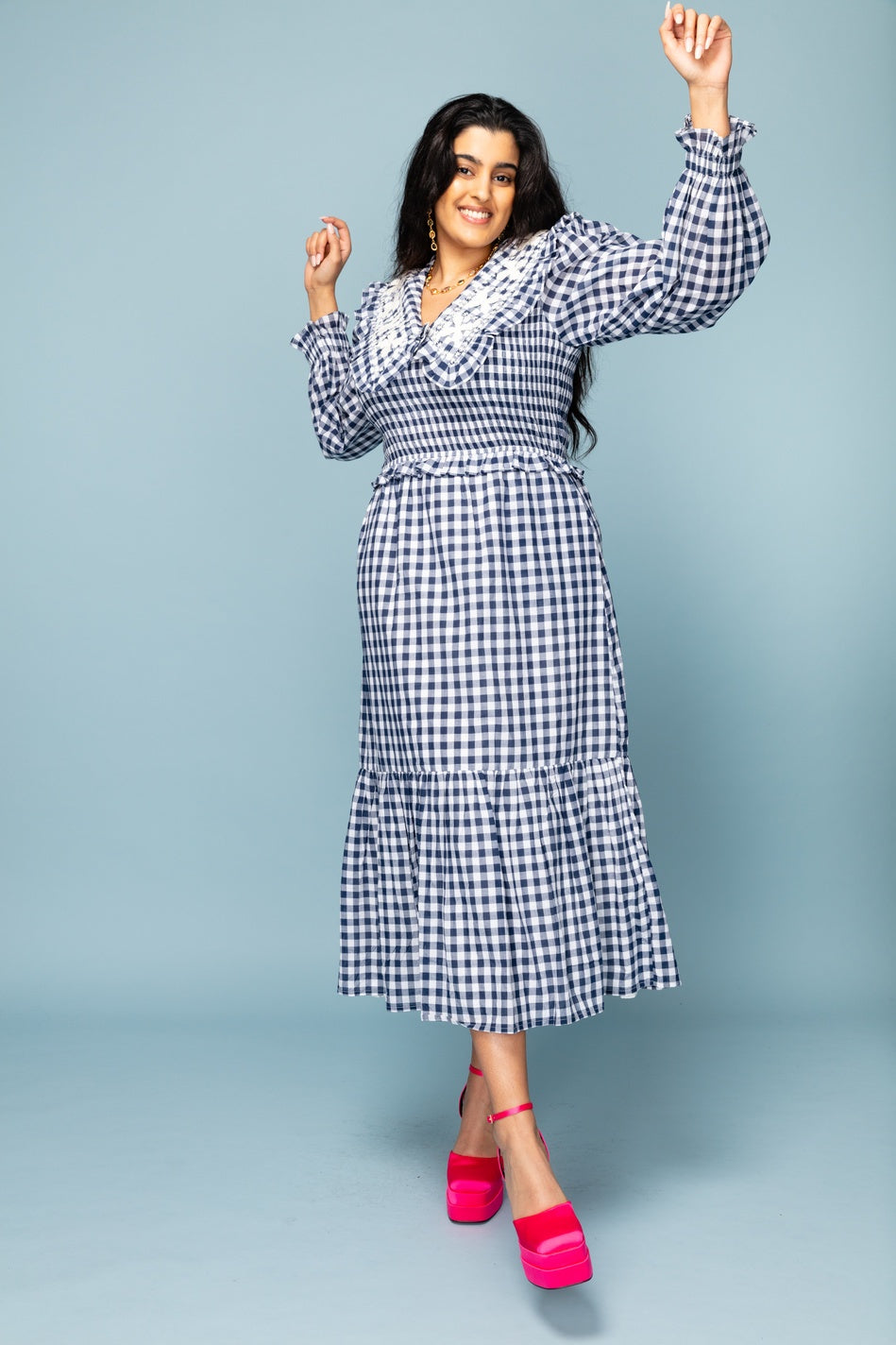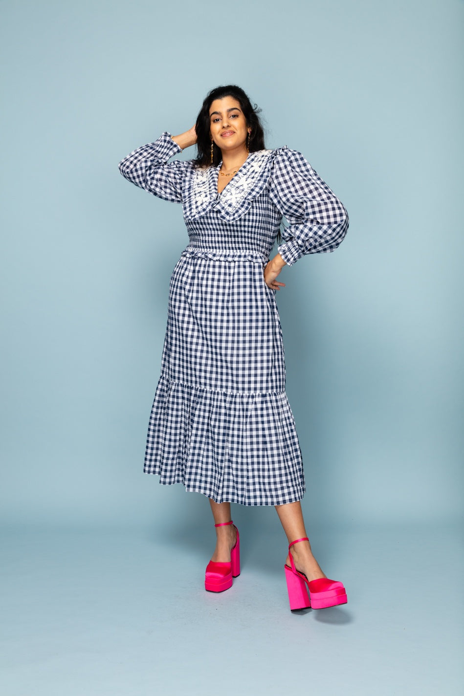 Gingham dress with big emboirdered collar detail, and long sleeves with elasticated sleeves. Elastication also round the waist, meaning it can adjust to many different body shapes