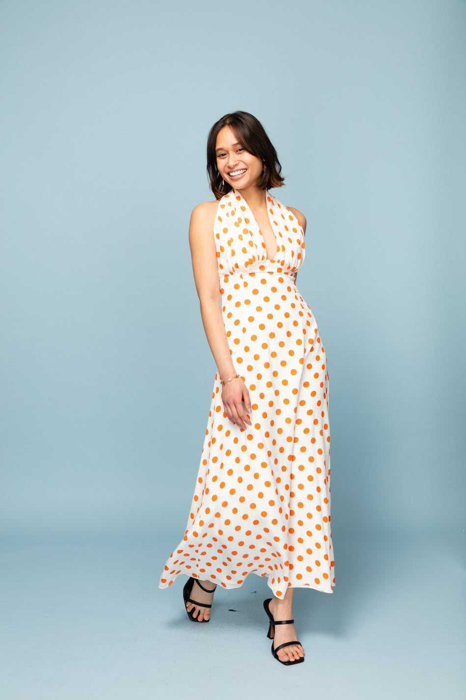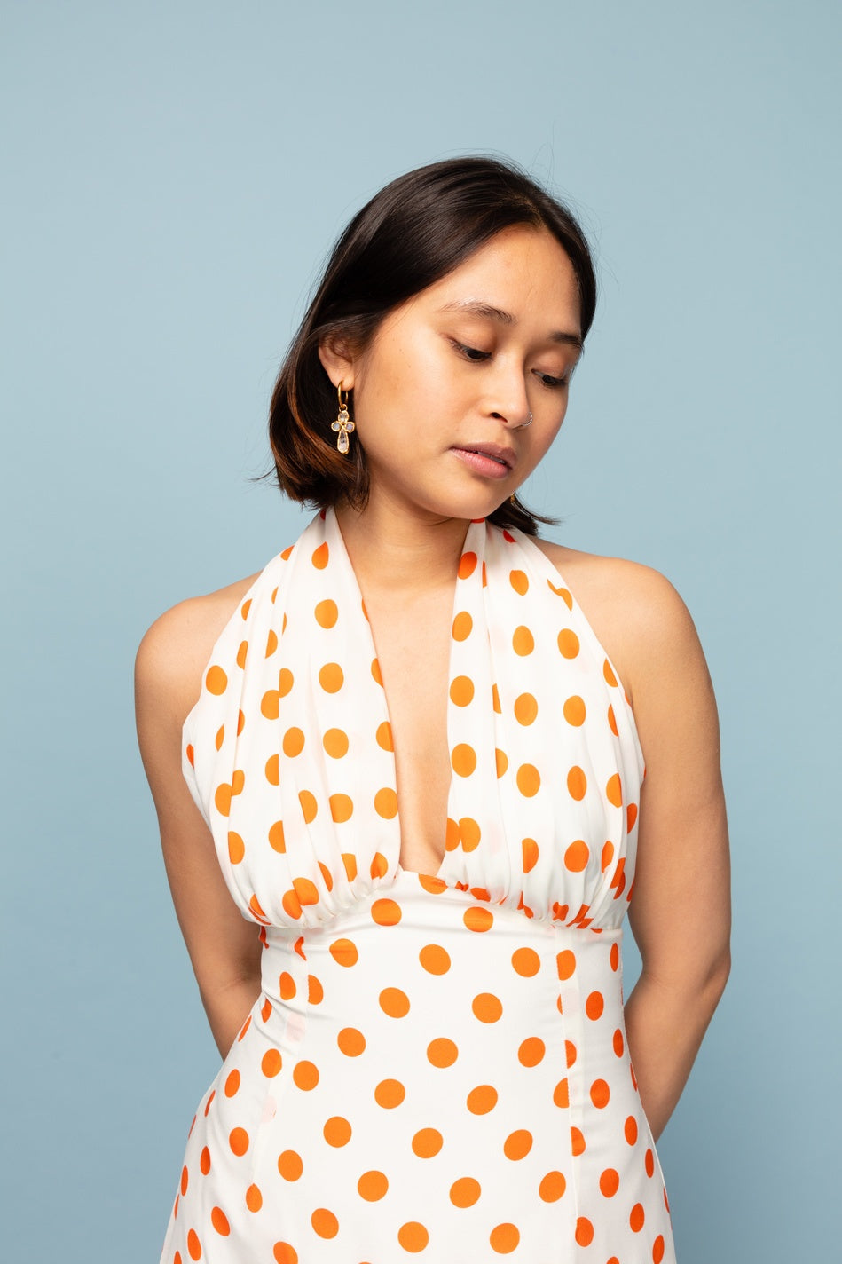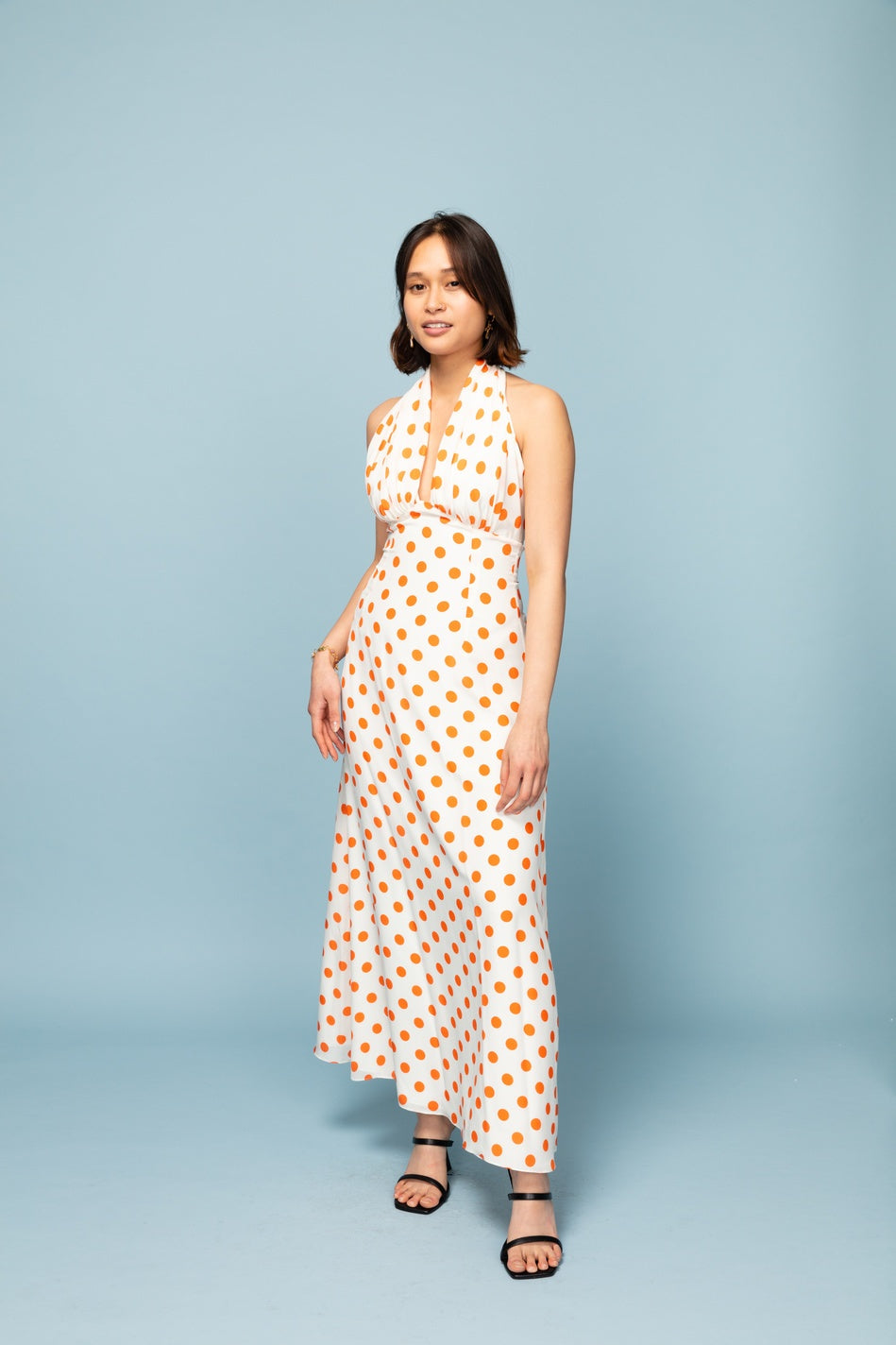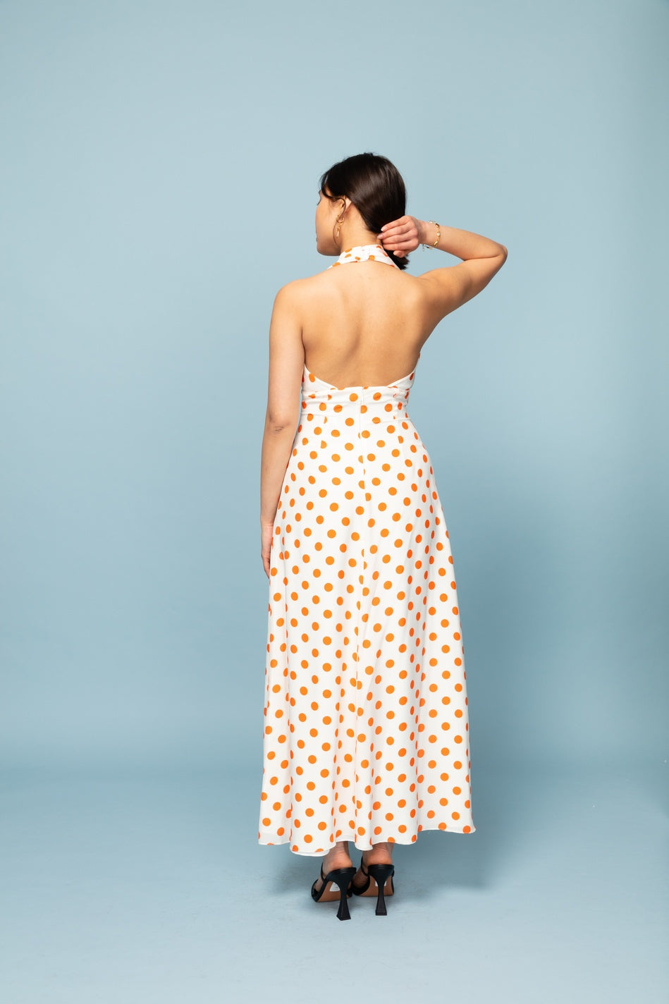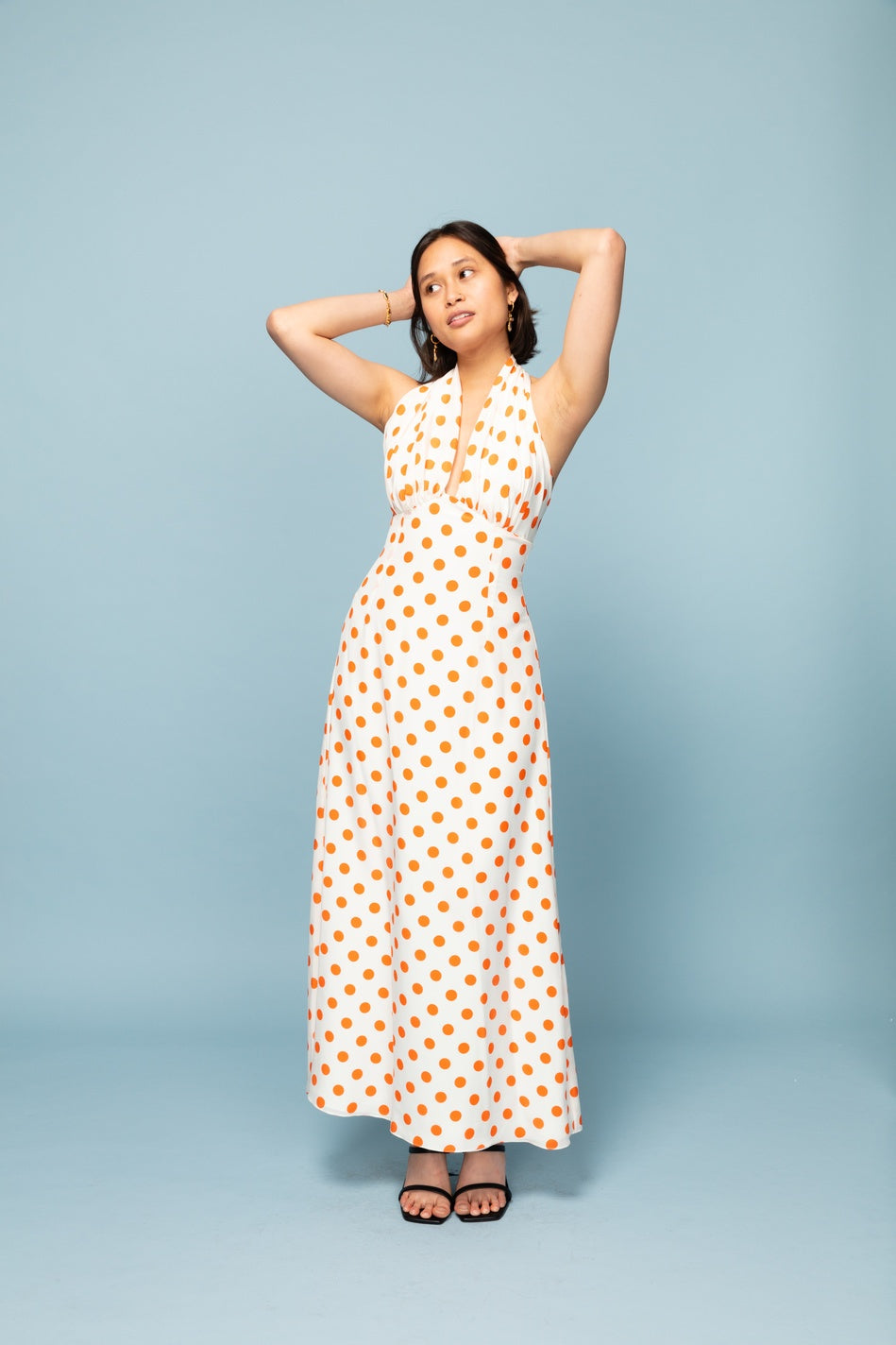 Beautiful light-weight fabric, with halter-neck and low back. Concealed zip at back, and button up neck.