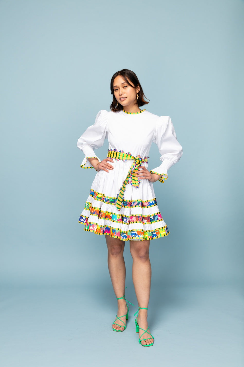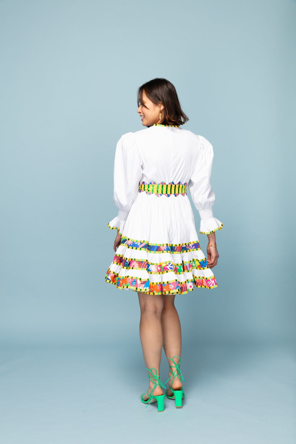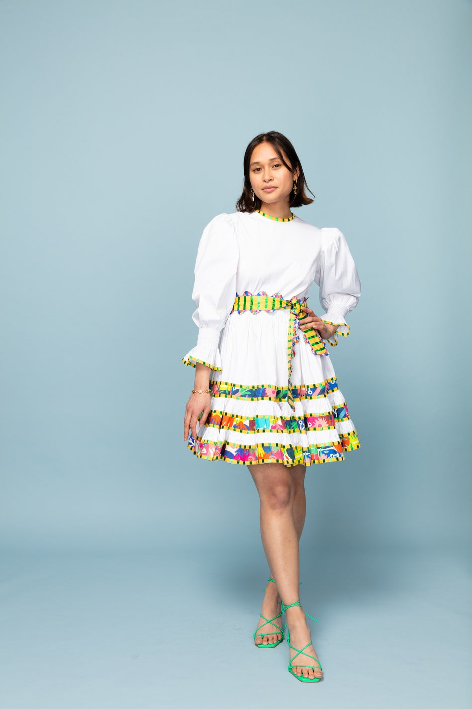 White dress with multi-coloured ruffle detail and coloured belt to tie round the waist. Elasticated sleeves and concealed zip at back
