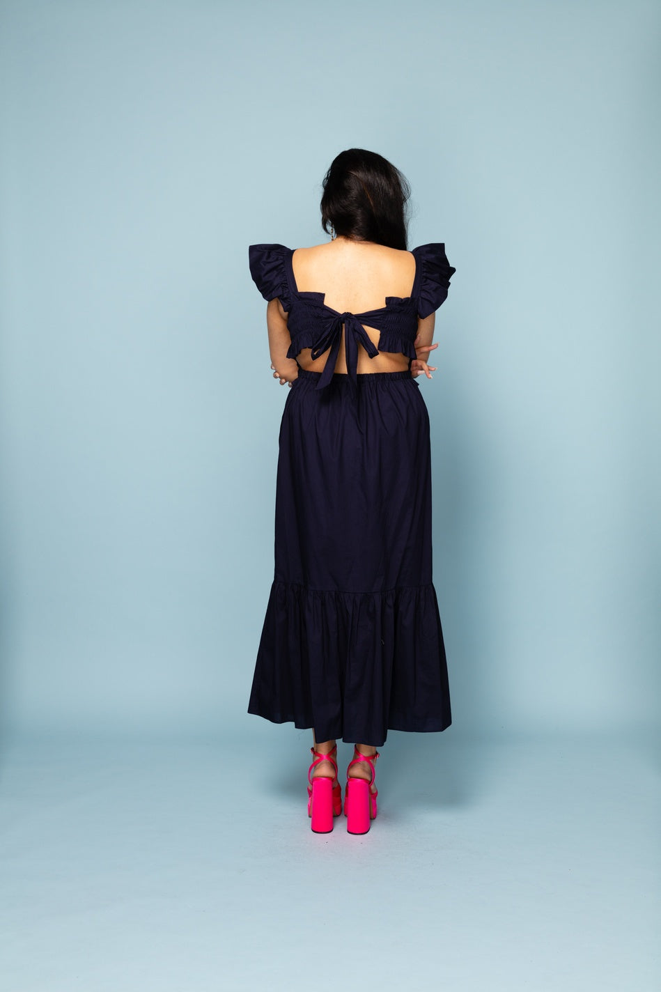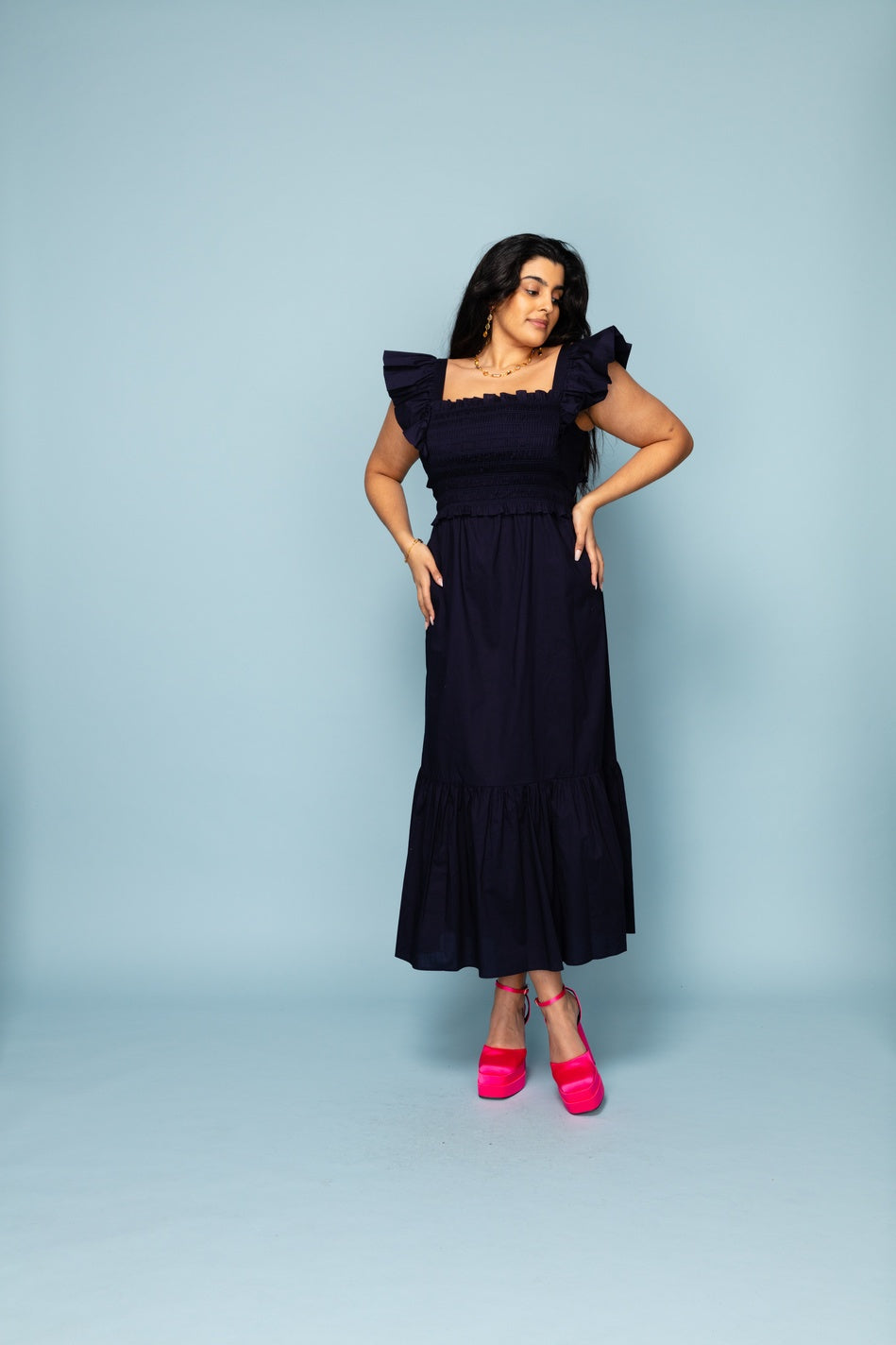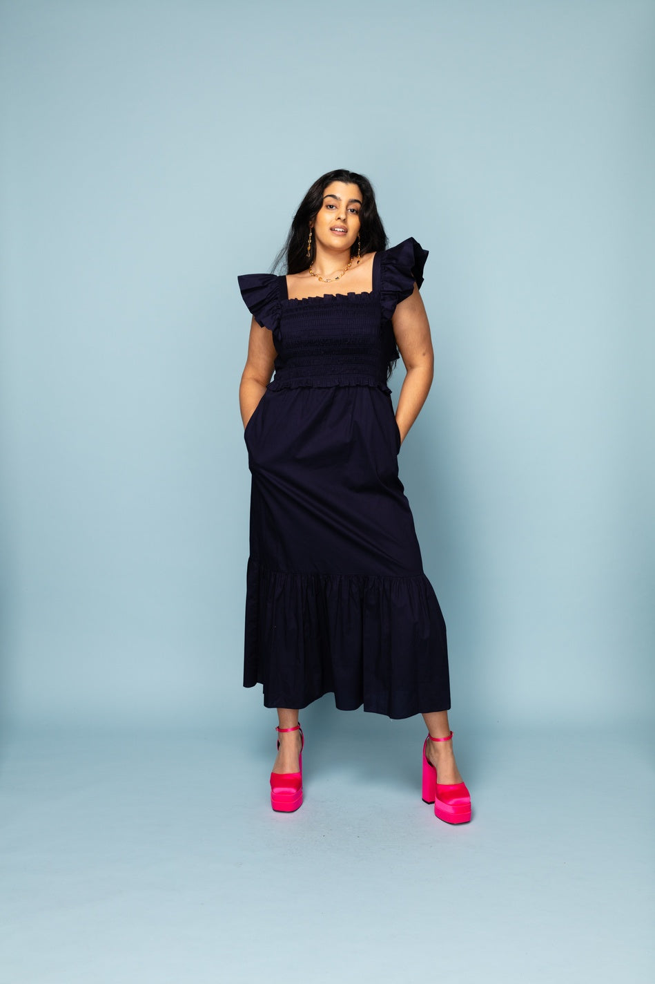 L (we find this dress very adjustable size-wise due to the elasticated top and back tie, and believe it works for anything from a UK10-UK16)