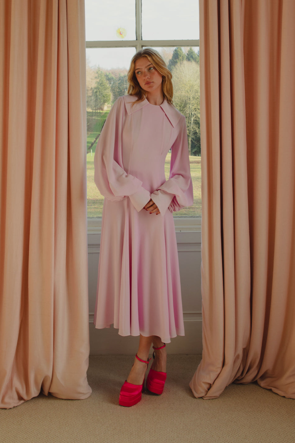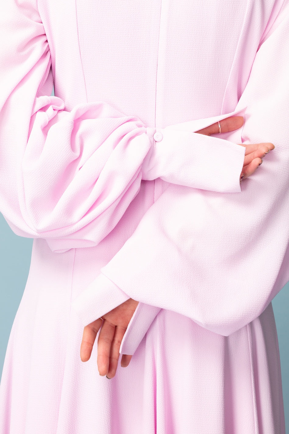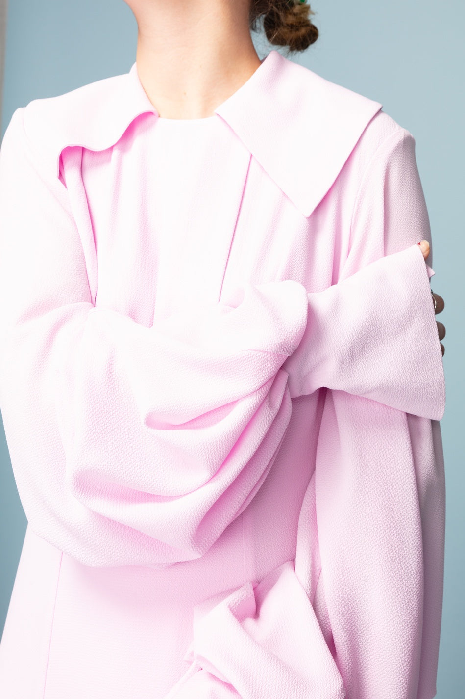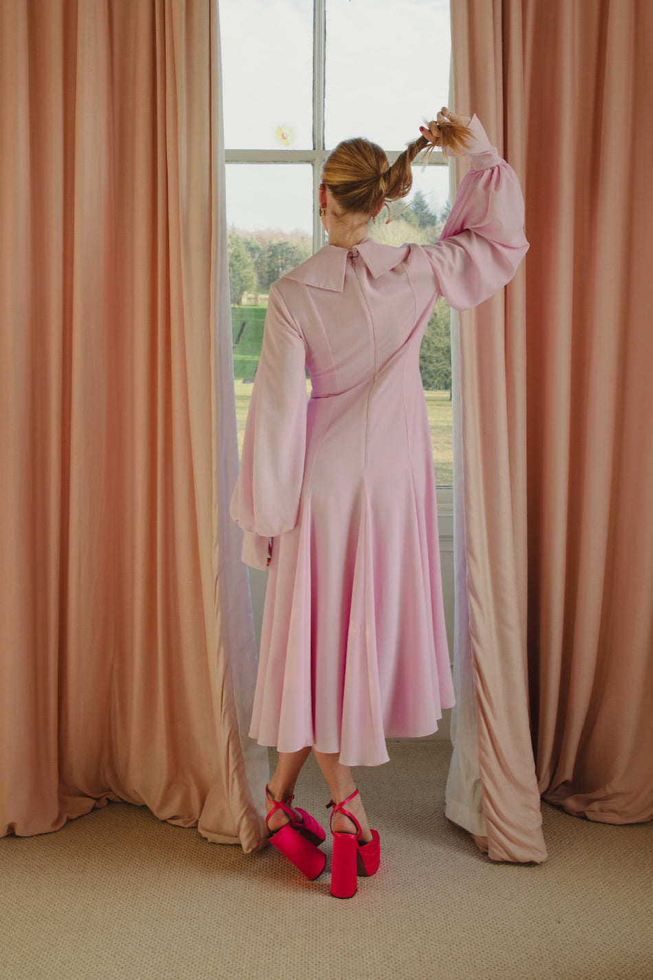 Beautiful dress with oversized collar, and billowing puffy sleeves, which come in elegantly to be fastened by buttons