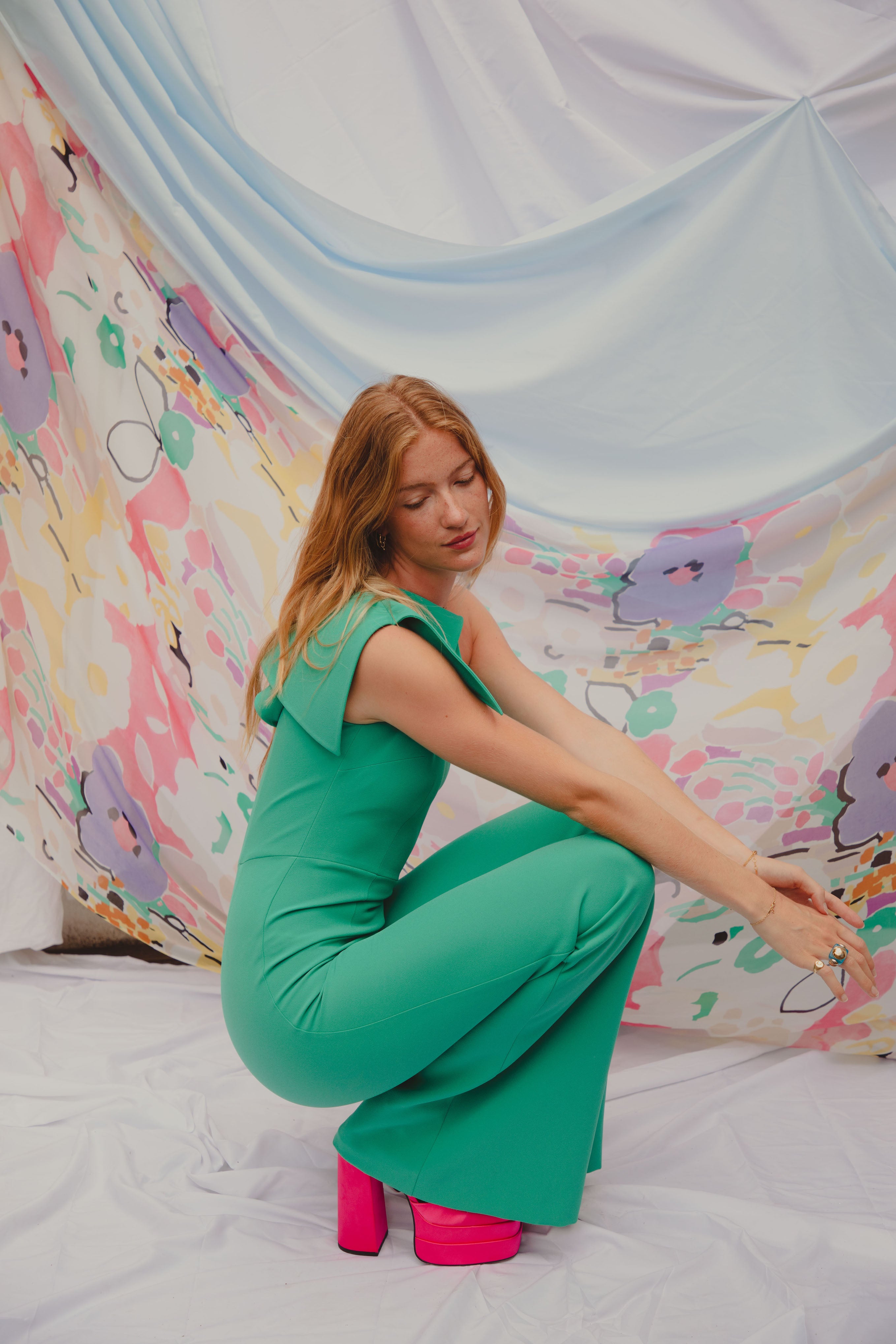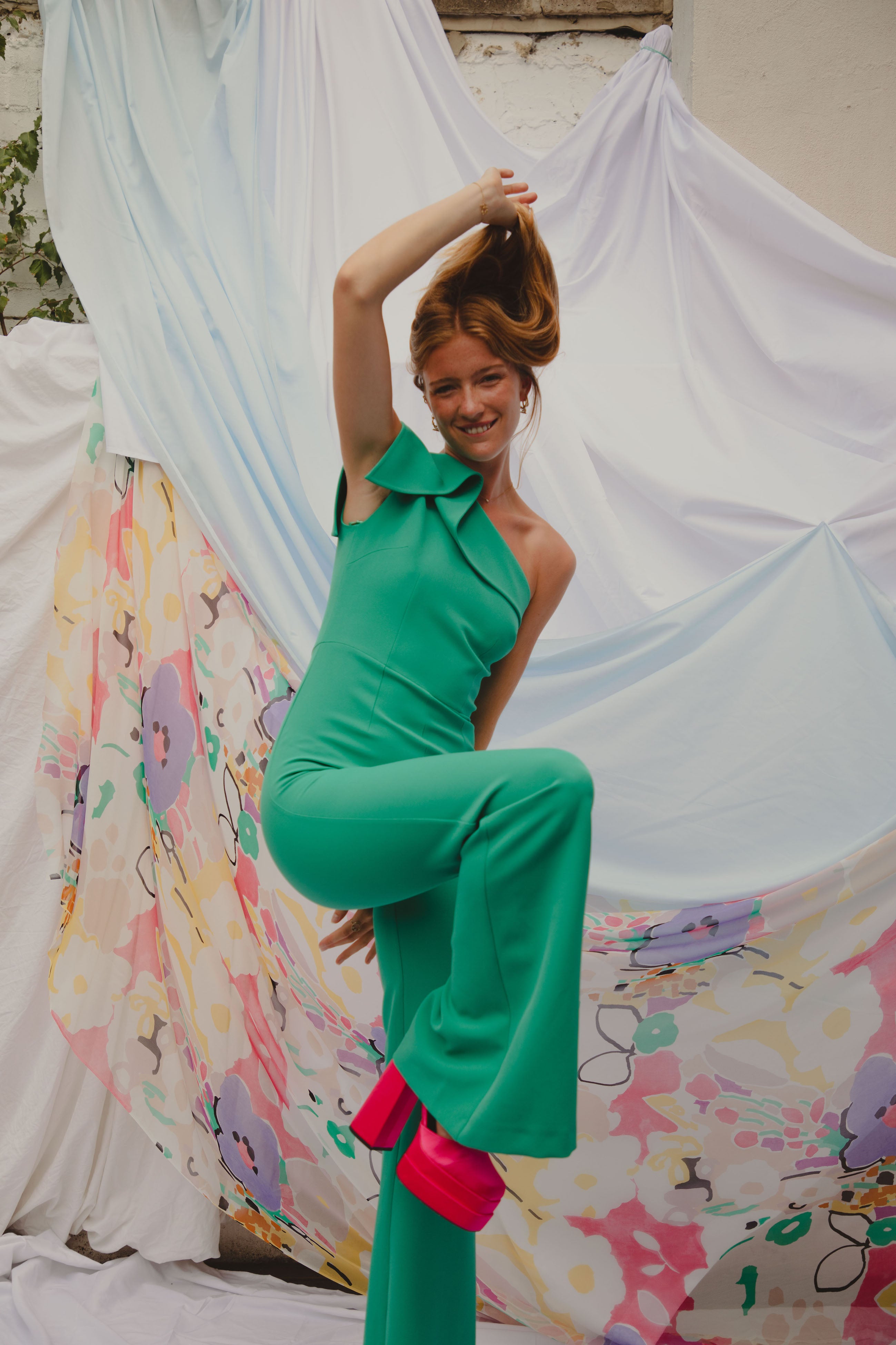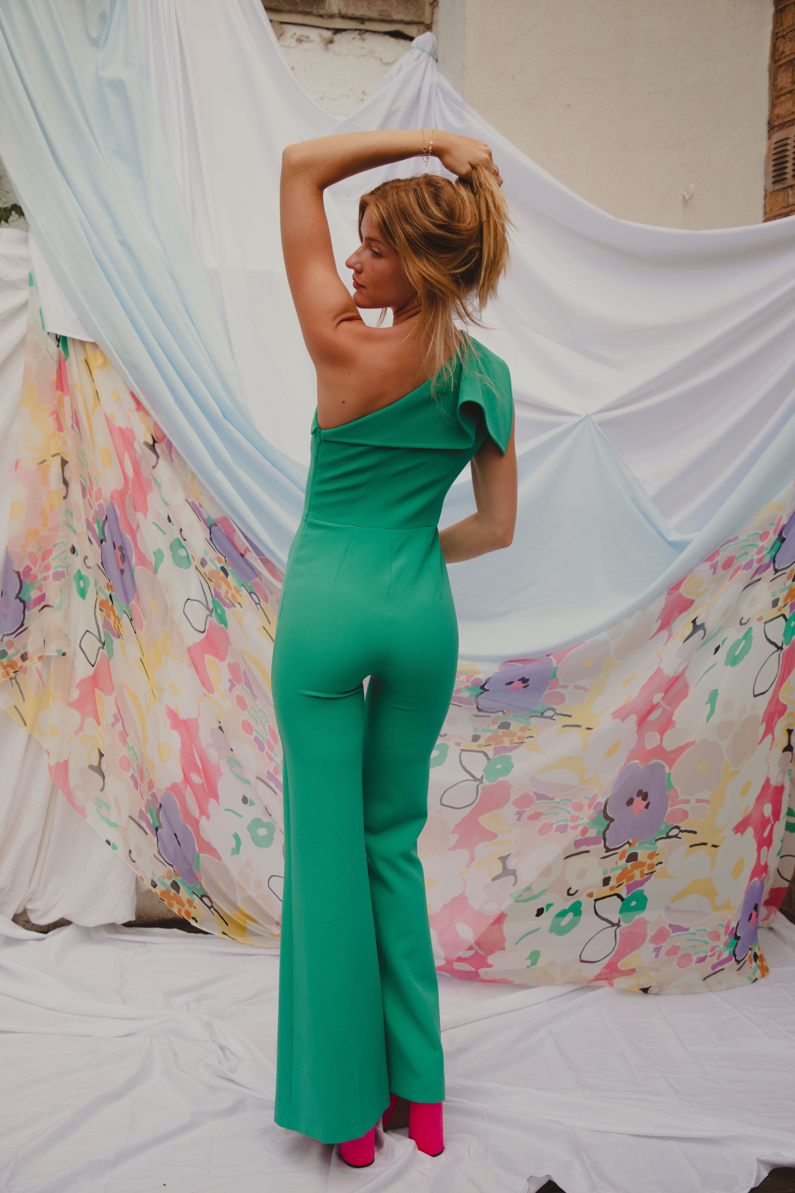 One shoulder jumpsuit with lovely detailing on the shoulder. Concealed side zip and flared trousers