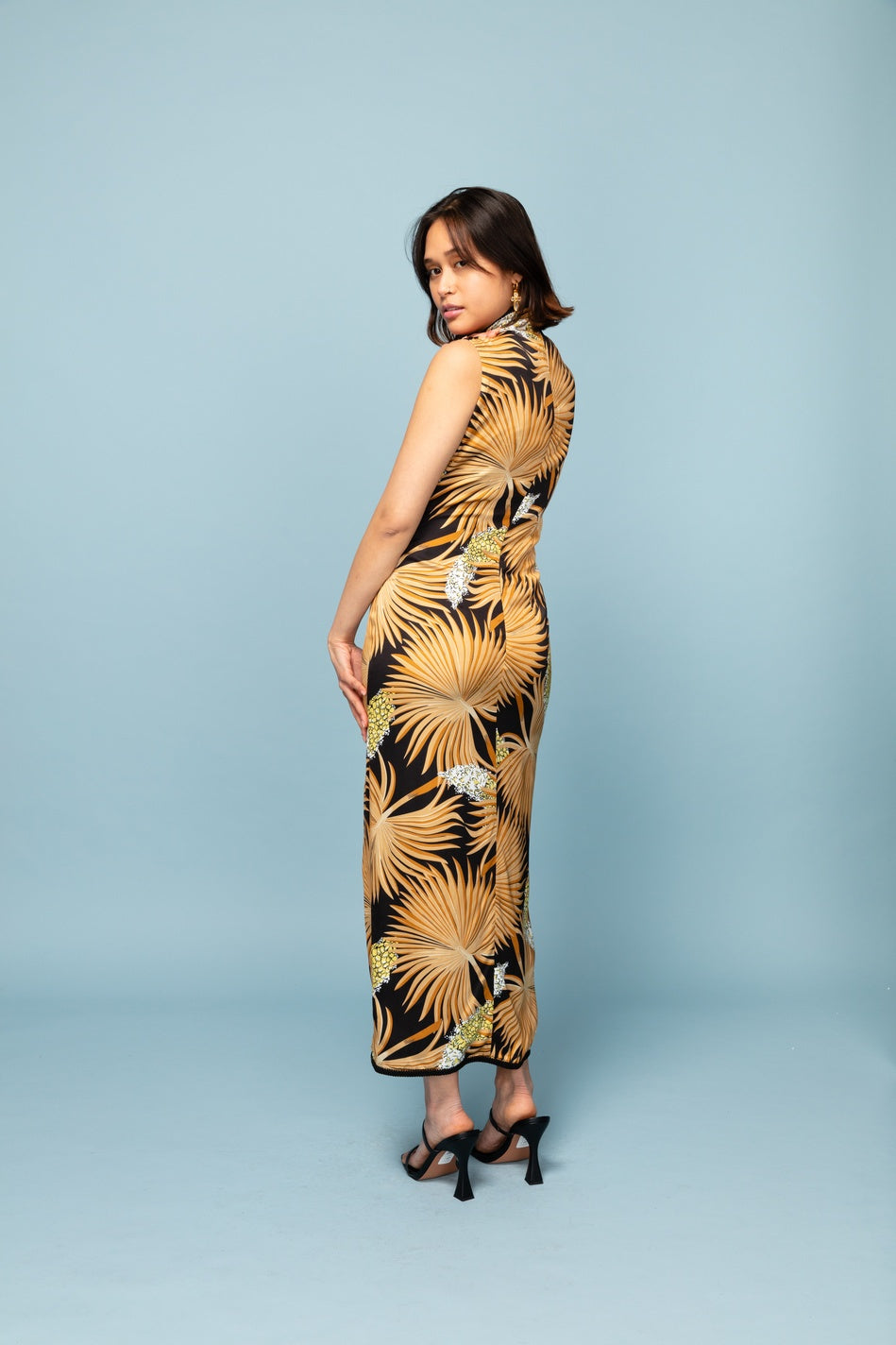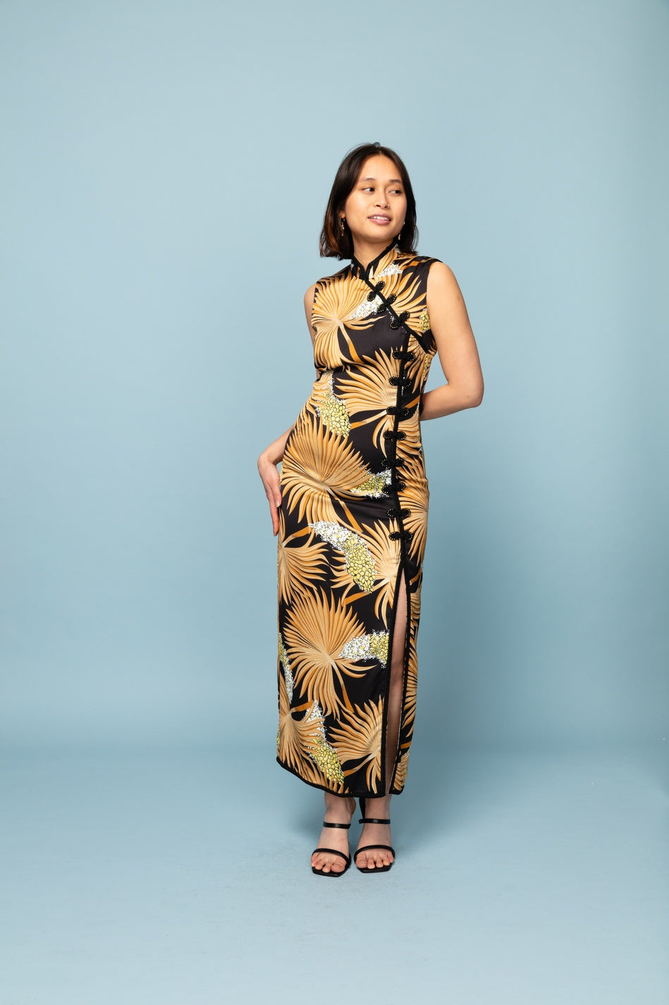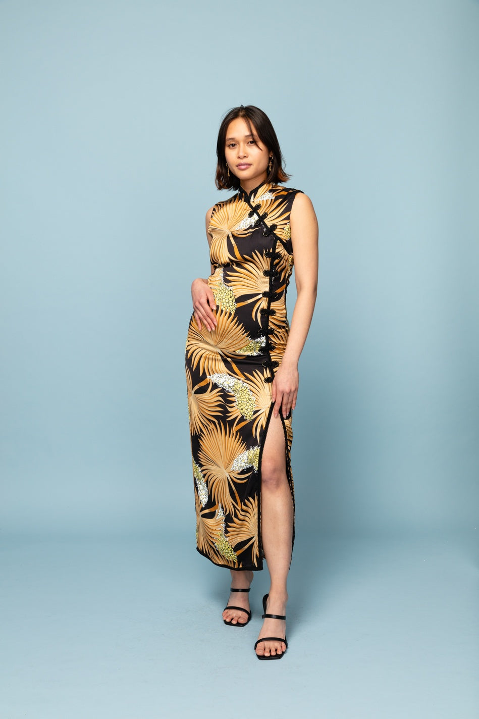 Mandarin collar and black pankou button embellishments with a centre back concealed zip fastening. Slim fit with a front slit.