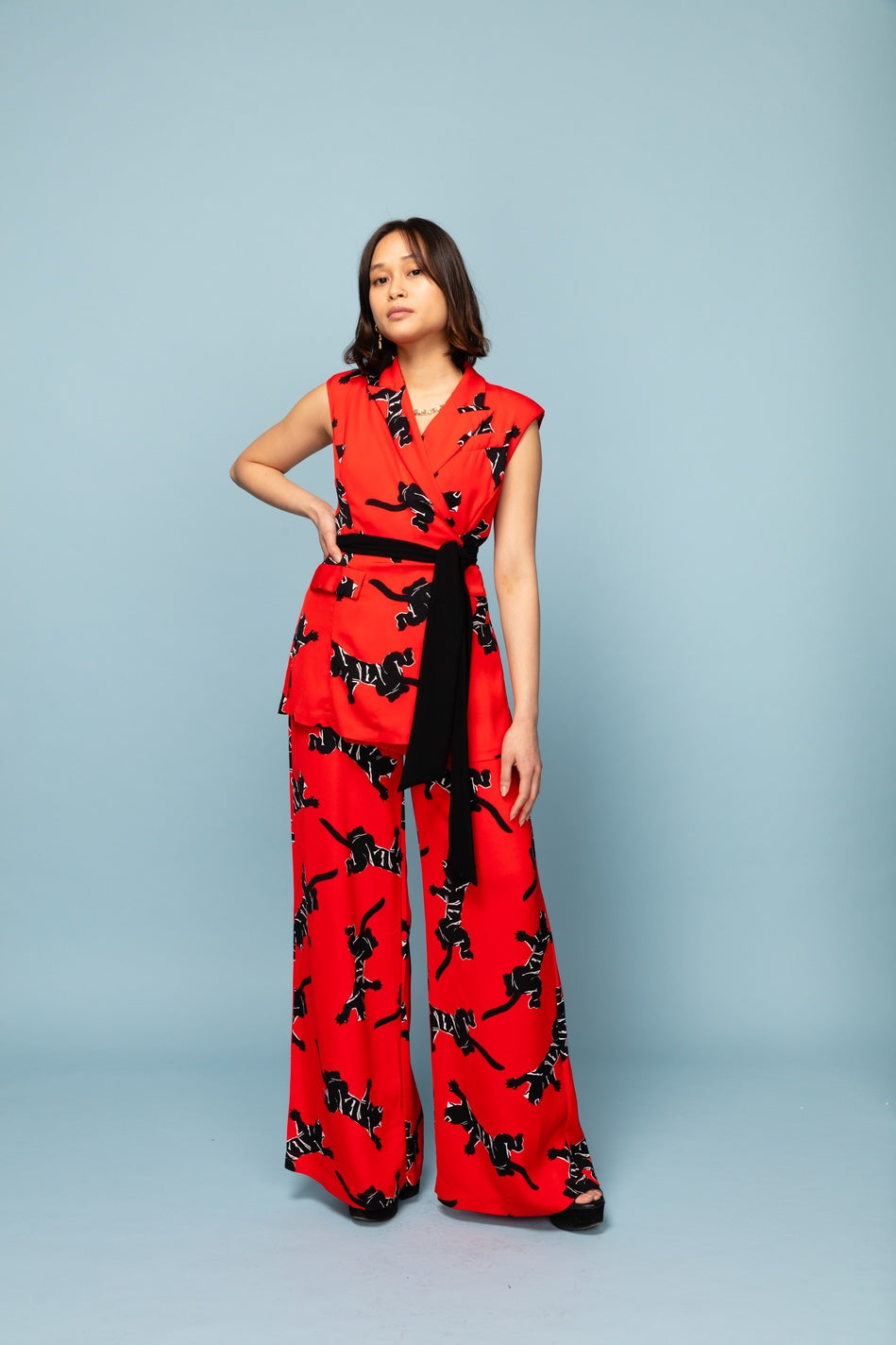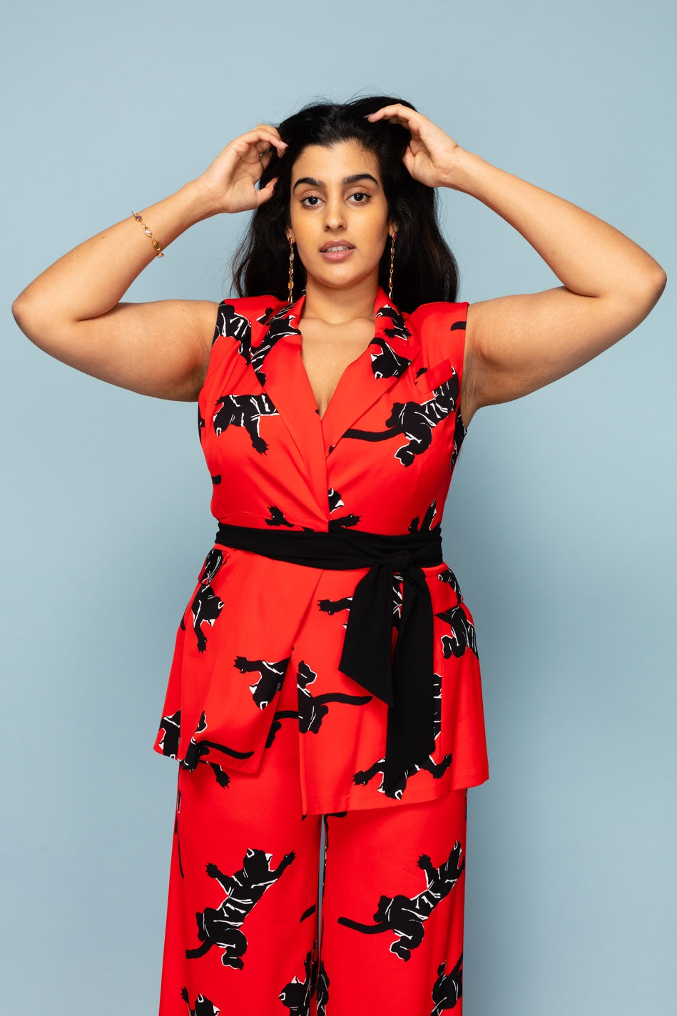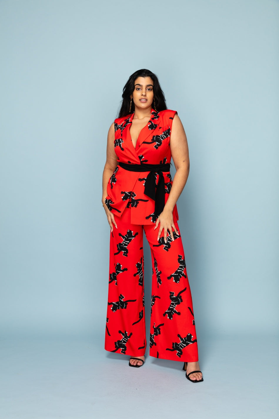 This wrap jumpsuit has the effect of a two piece when on. The waist belt cinches in the waist and ties to the side in a double knot. NB - This item has some markings which are barely noticeable when on. Get in touch for more info/photos!