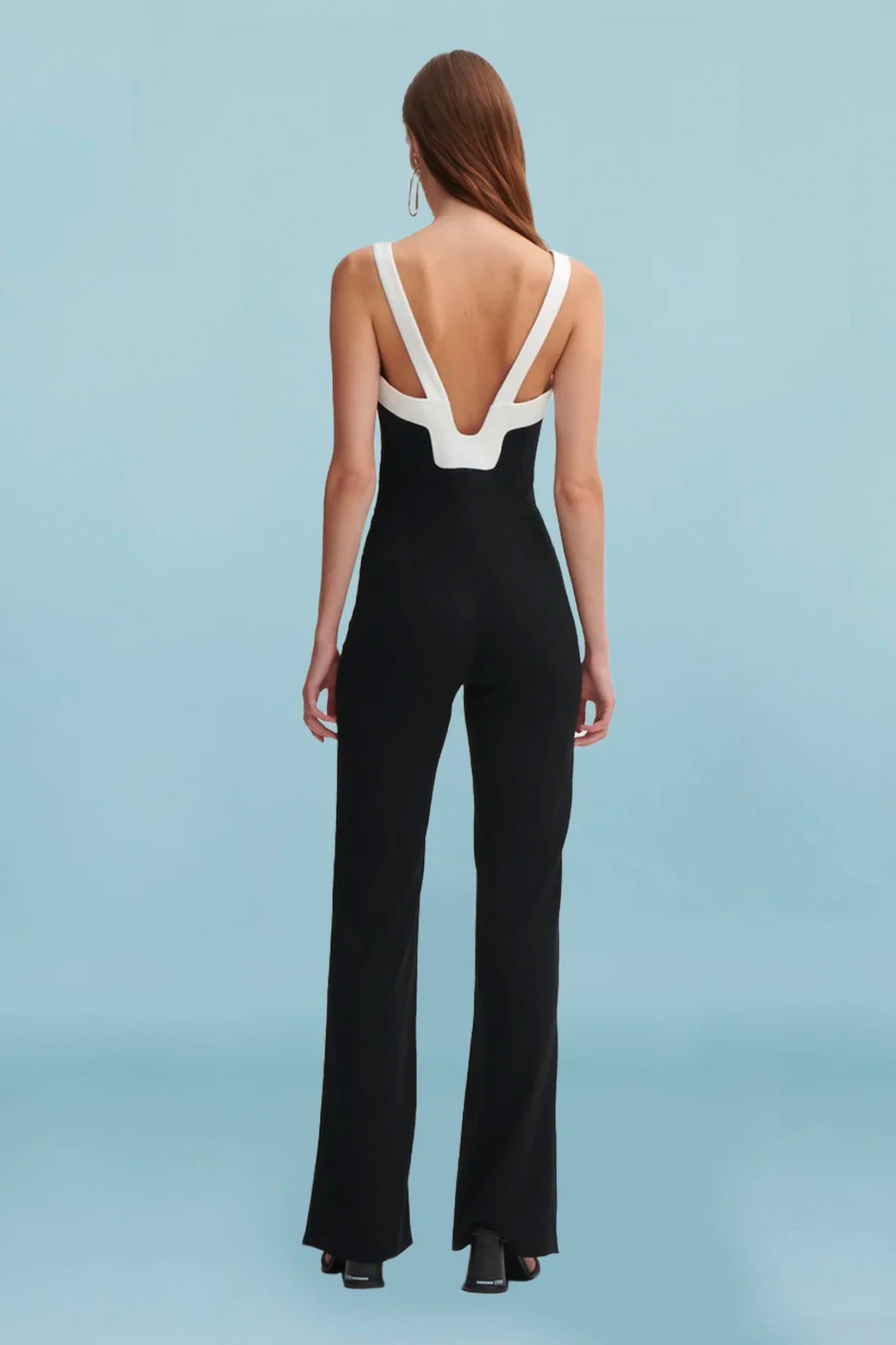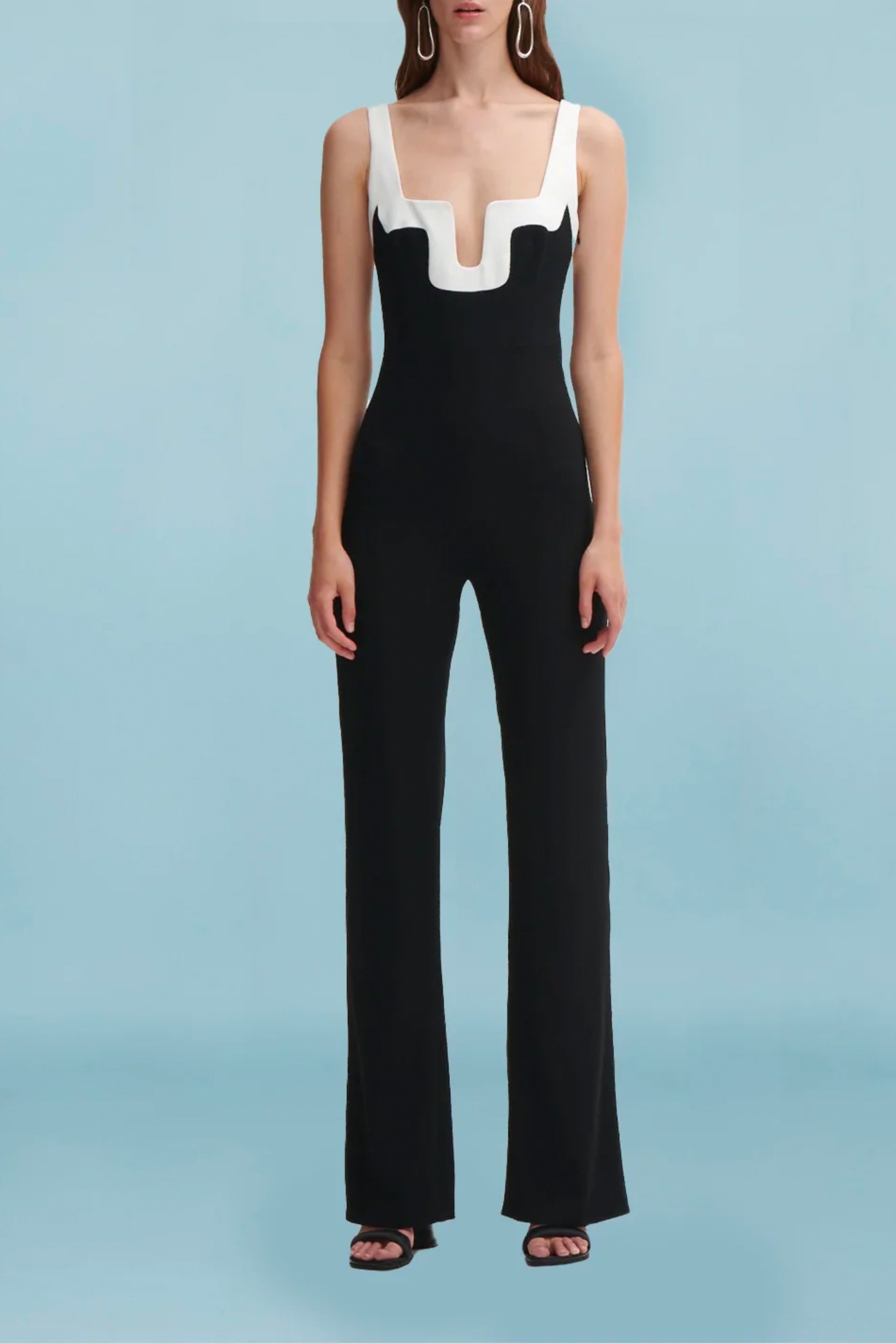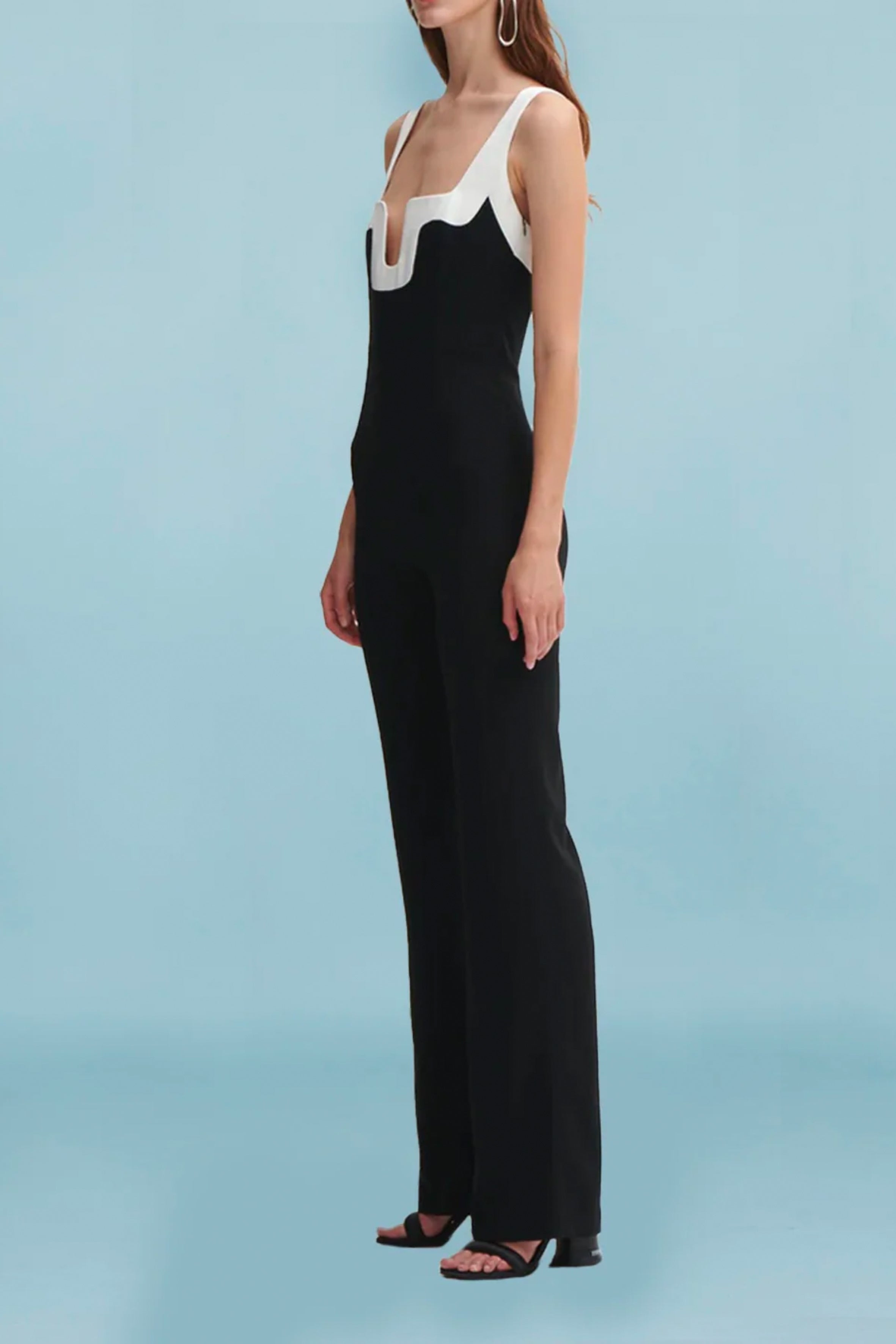 The classic Galvan Signature Jumpsuit with a contrasting white neckline. It has a double zip, and internal hidden corset for maximum support and the most flattering structure
