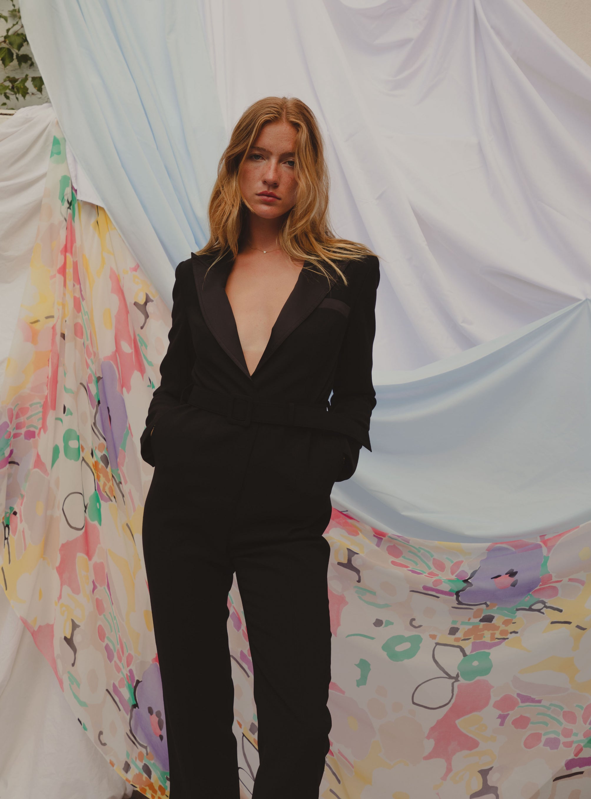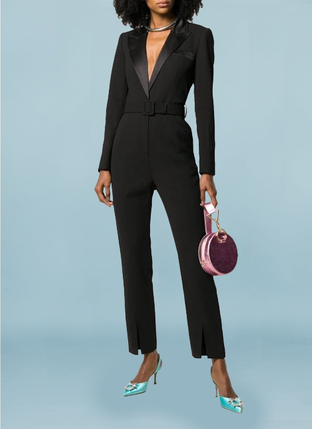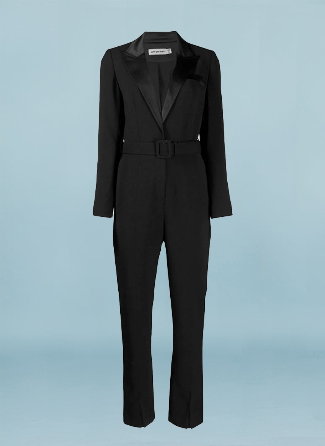 Tuxedo jumpsuit with belt to cinch in the waist. Straigh leg with slight leg slit, and long sleeve with cuff detailing