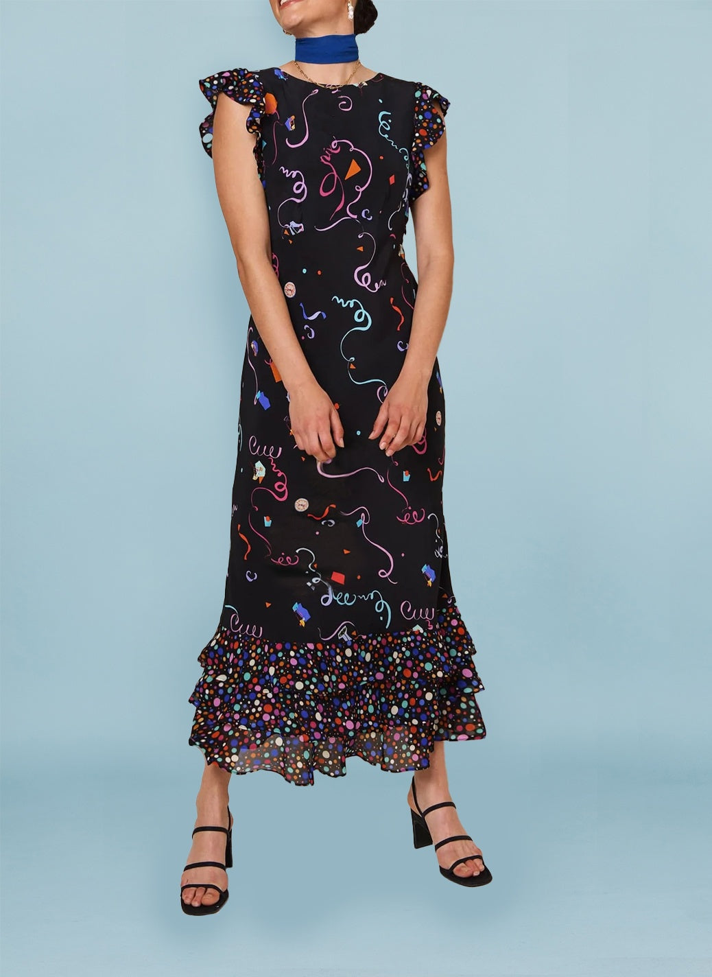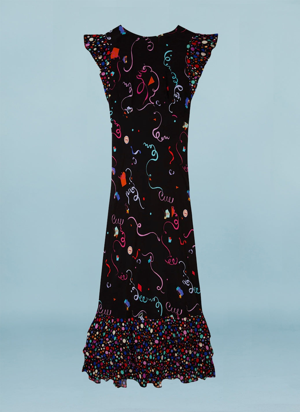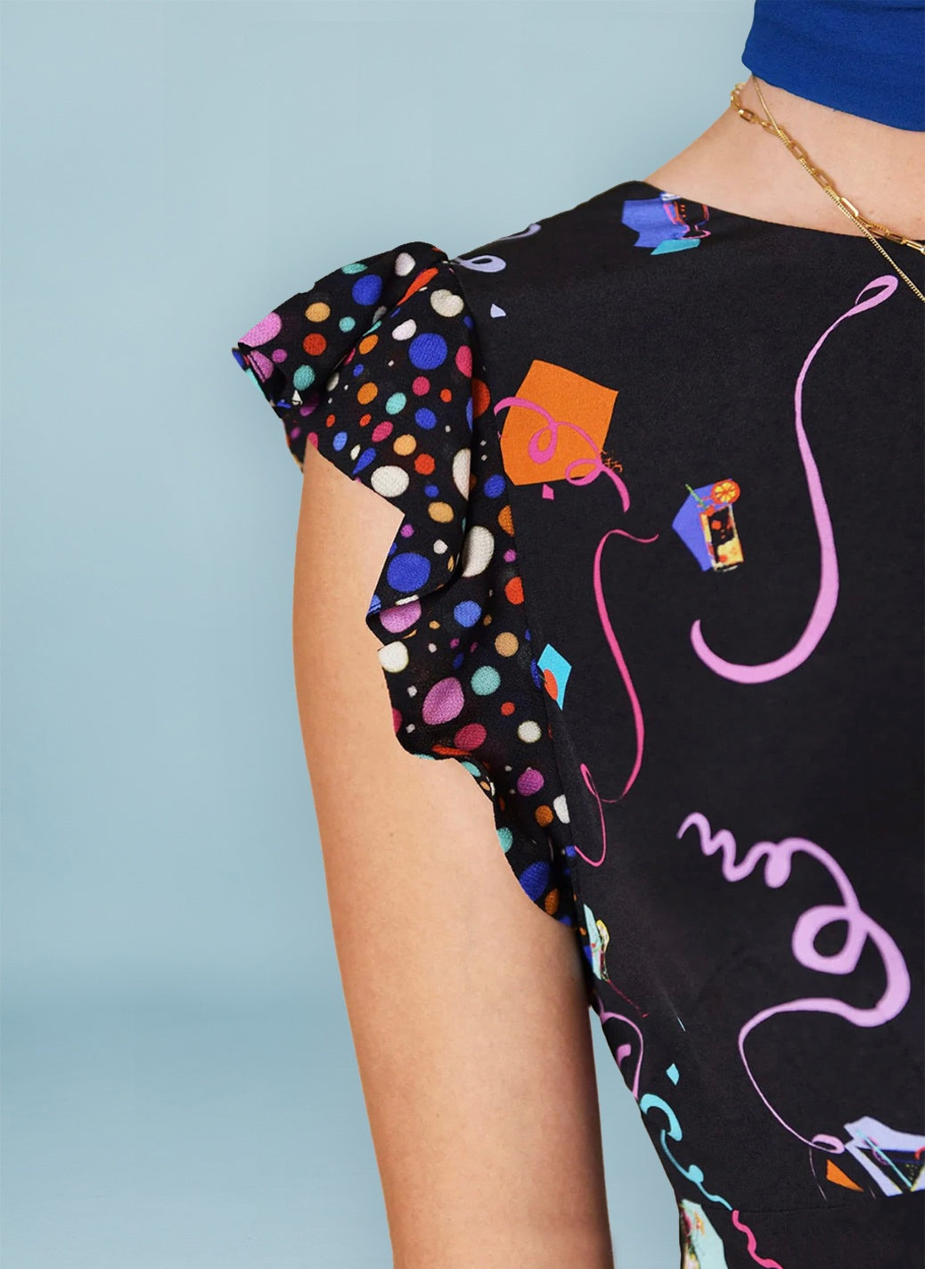 Black dress with funky party illustration print. Gorgeous ruffle sleeve, and flattering darting under the chest. The back hang slightly lower, in a subtle V