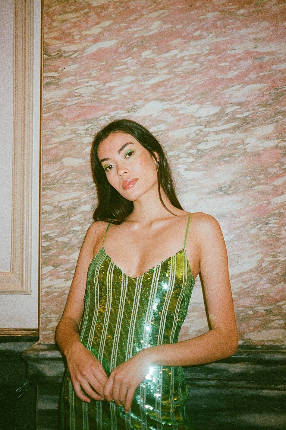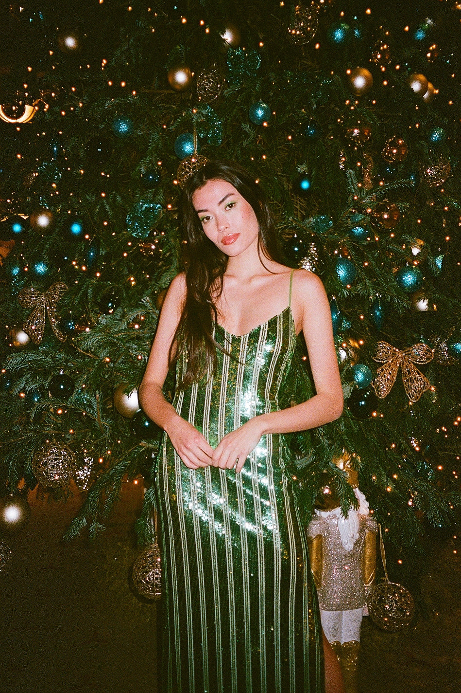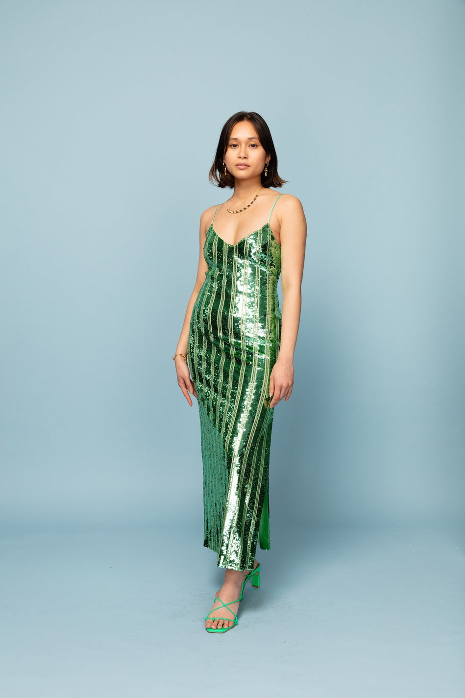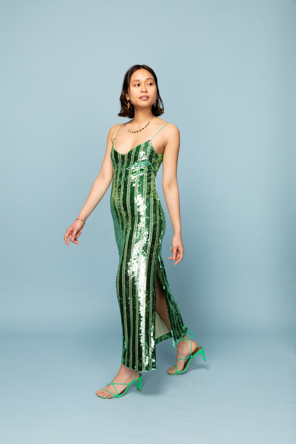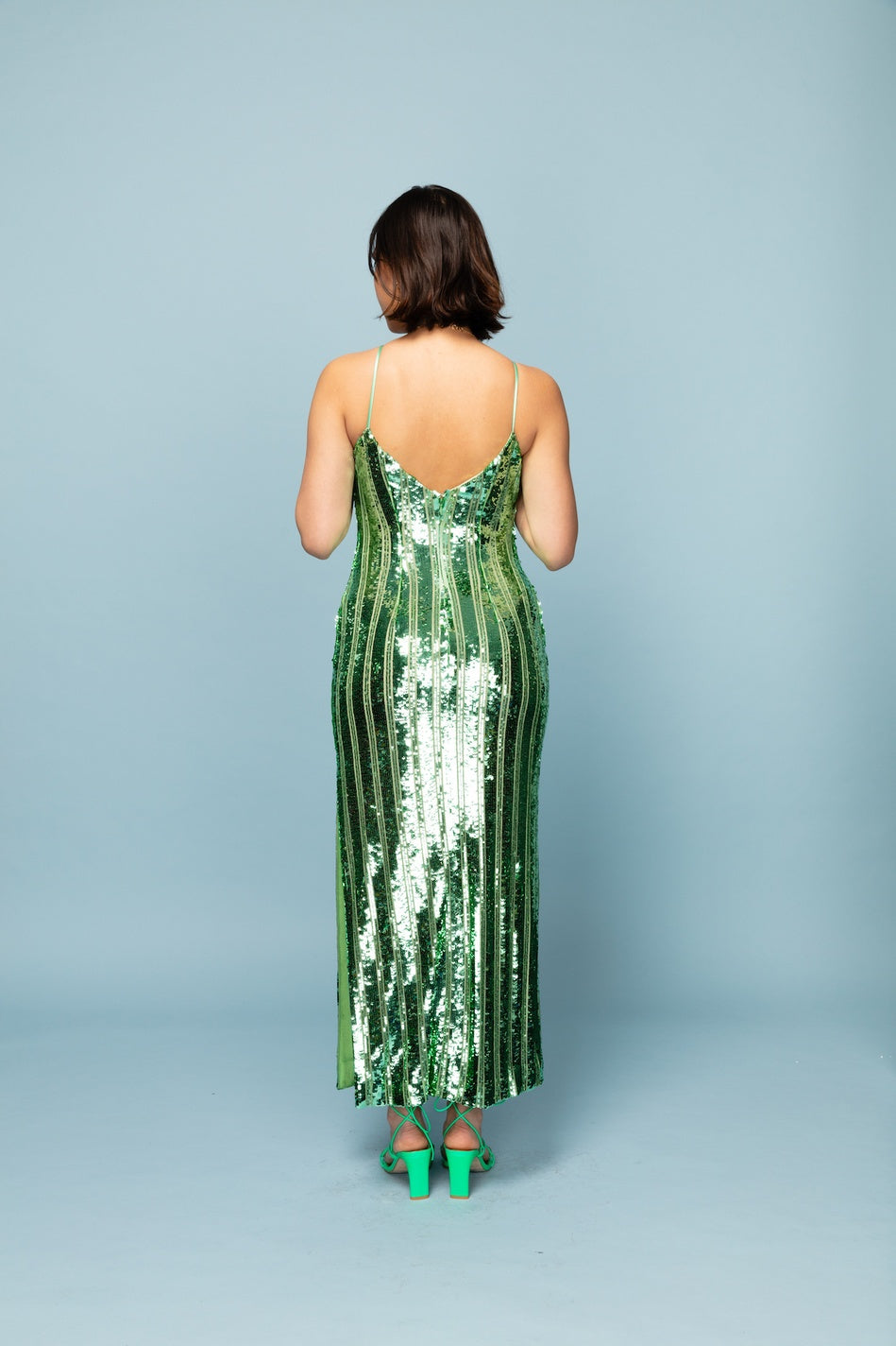 The show-stopper dress, in a beautiful green. V-neck front and scooped back, with a sexy leg side slit. Beautifully lined to avoid any discomfort from sequins
