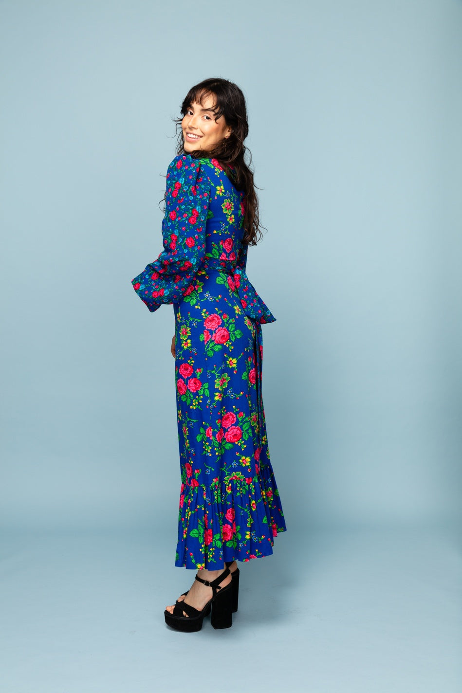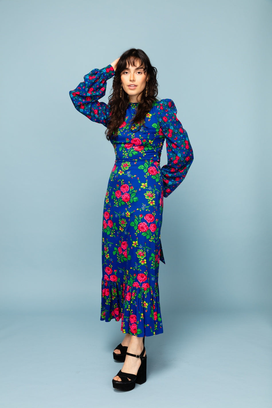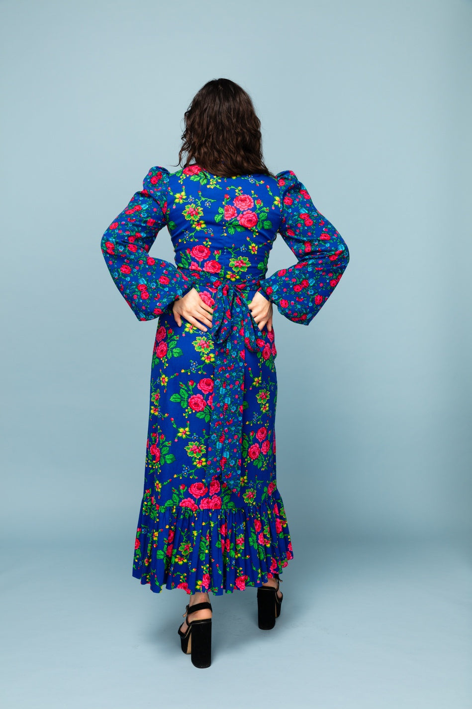 Super flattering dress which ties with a bow at the back. Puff long sleeves with button detail and puff shoulders
