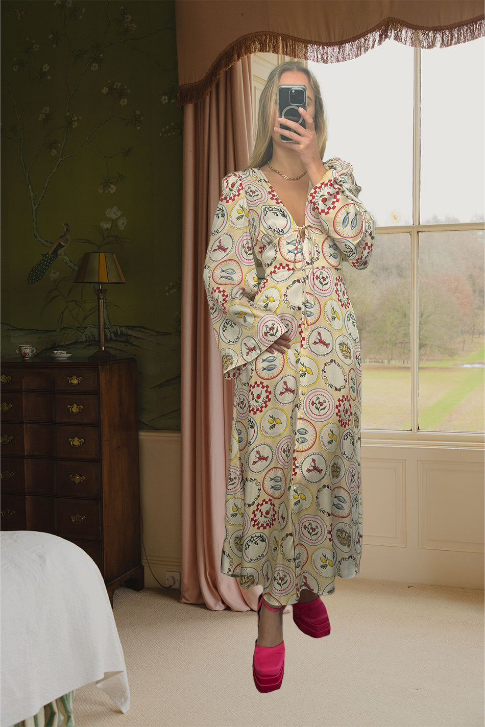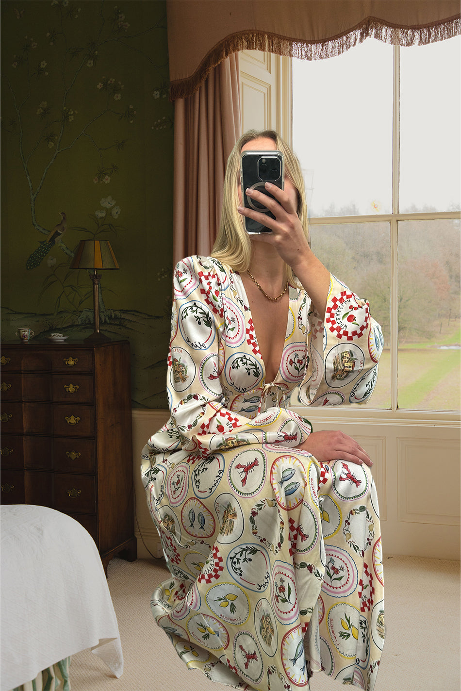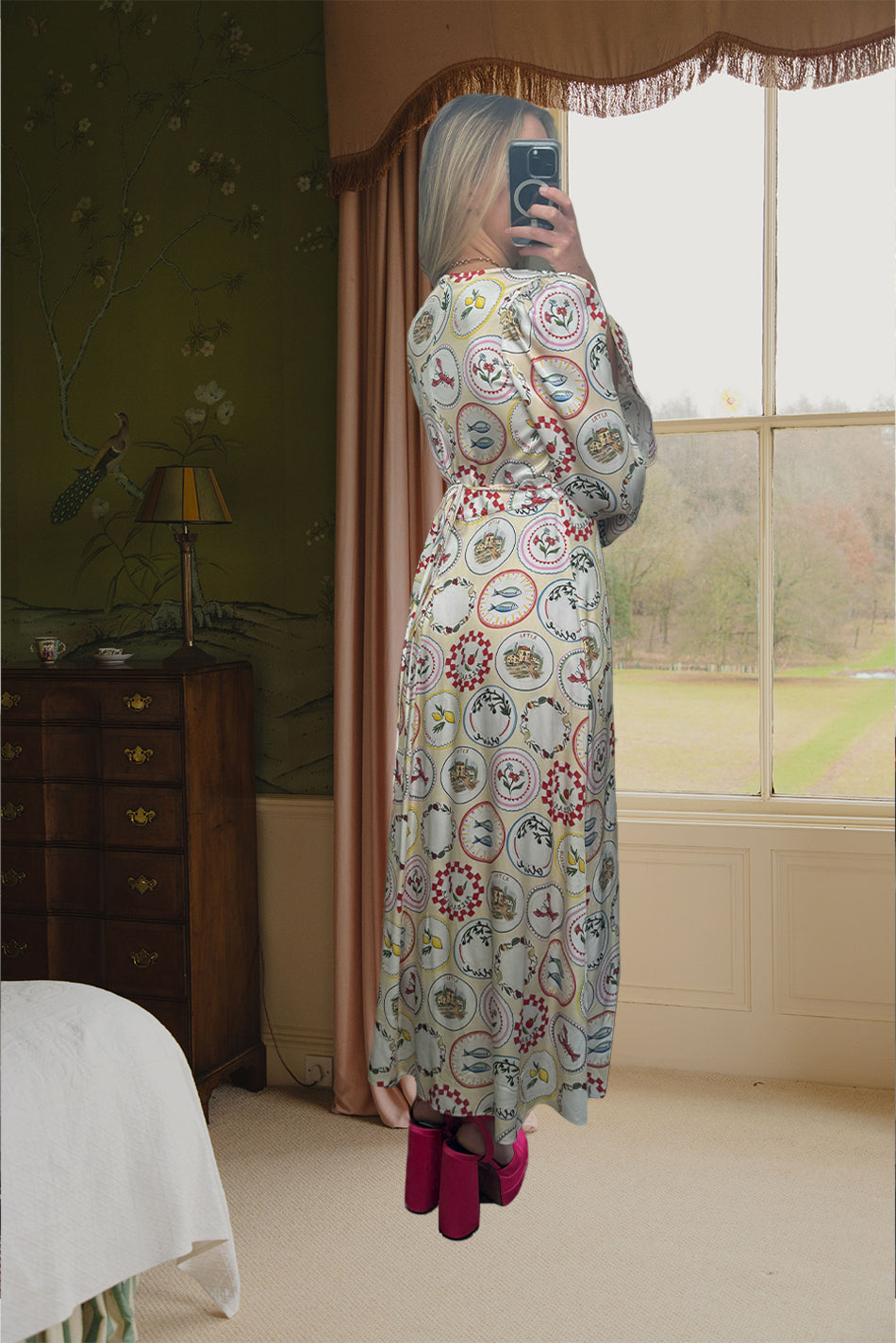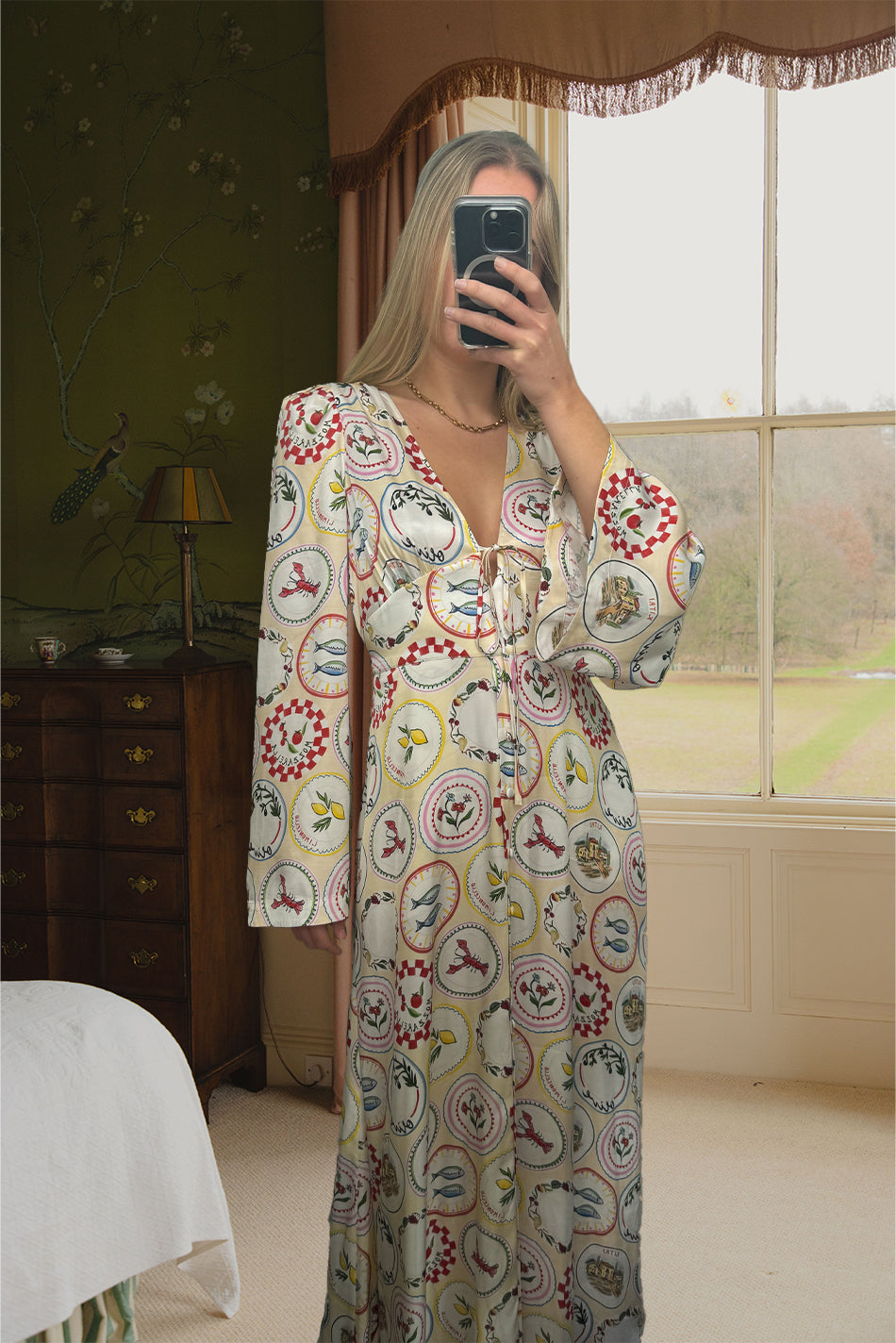 Long sleeve dress in the good-enough-to-eat Vintage Plate print, with tie front detail