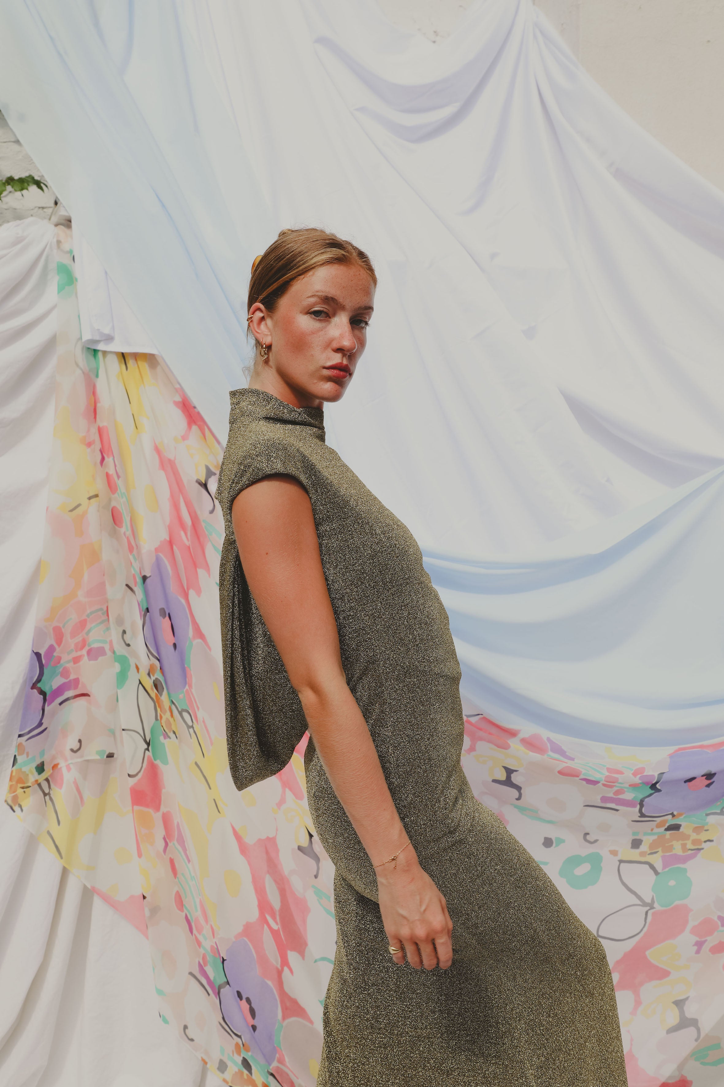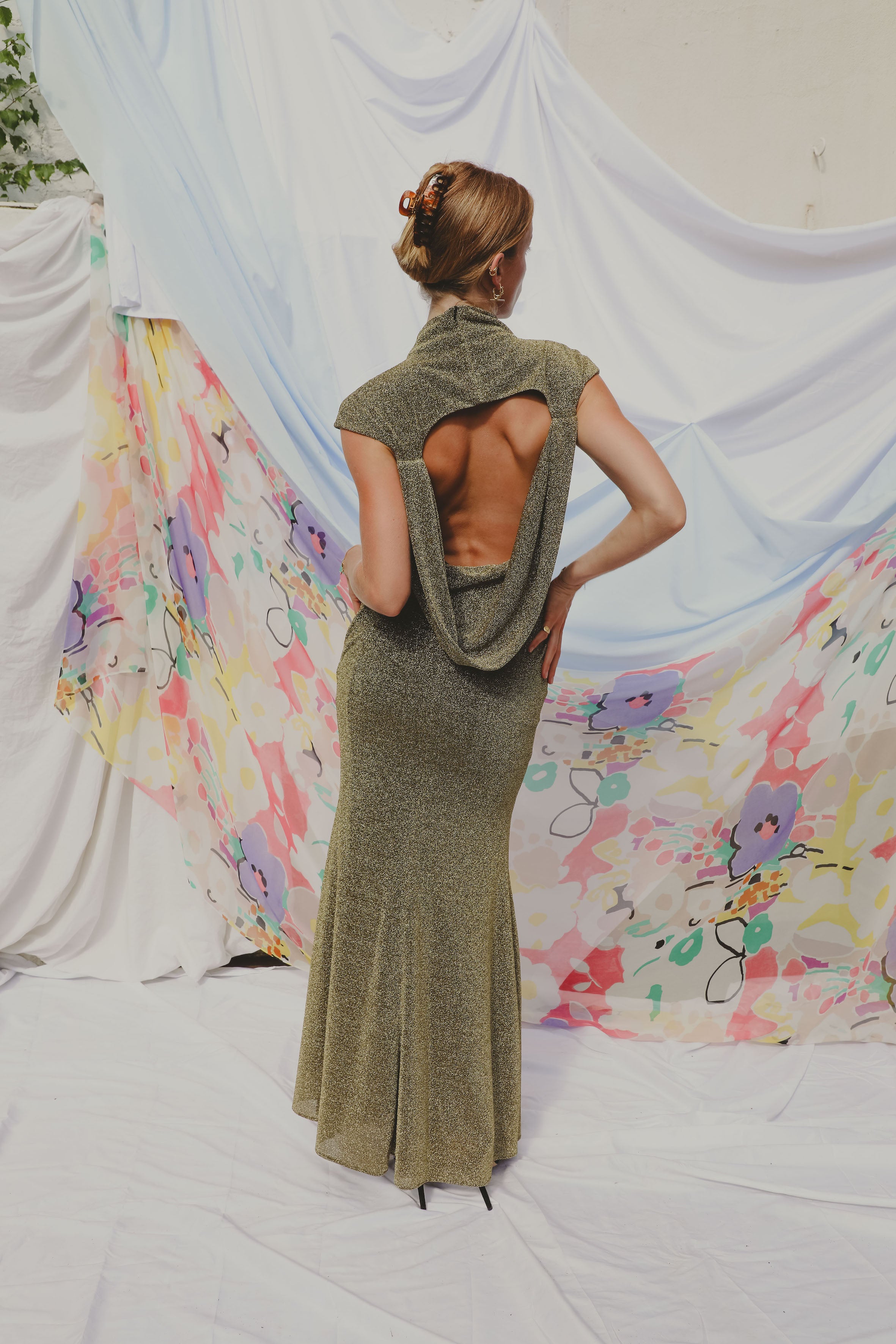 Make a statement in this head-turning dress. Floor length in a stretchy fabric which hugs your figure. Zip at the back at the neck, and sexy open-back.