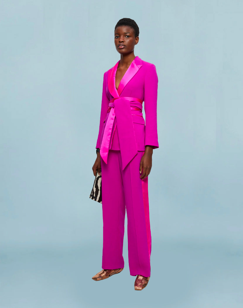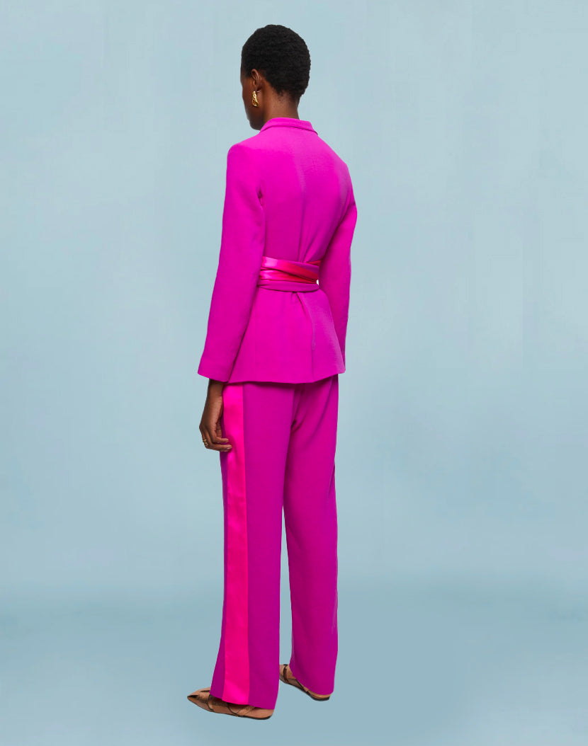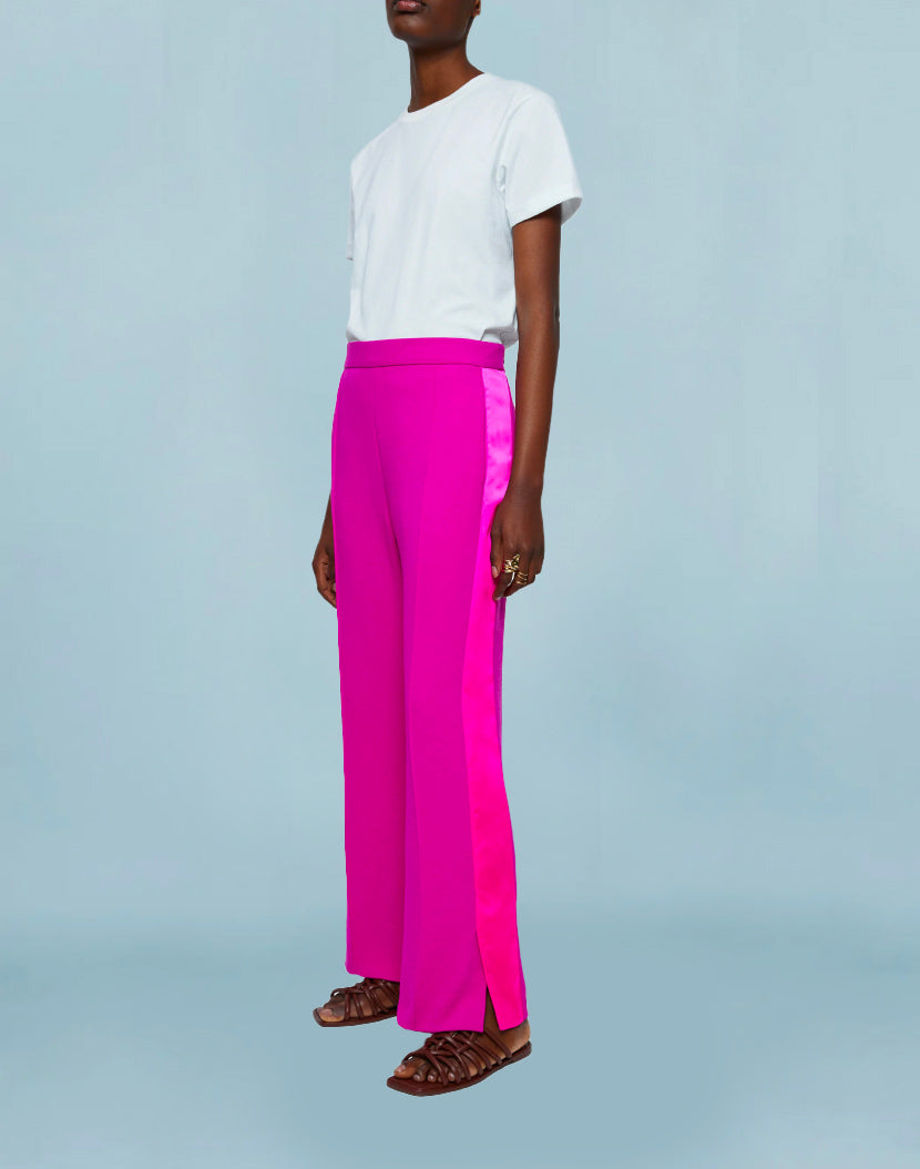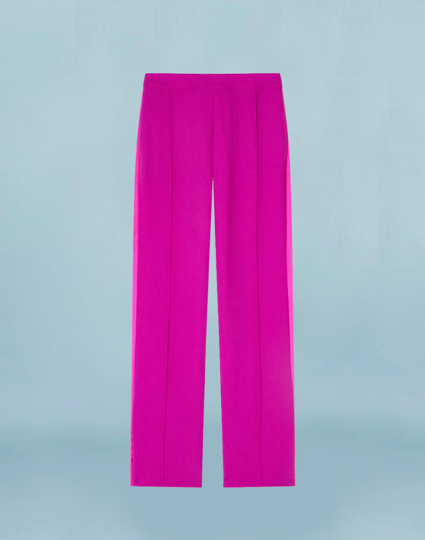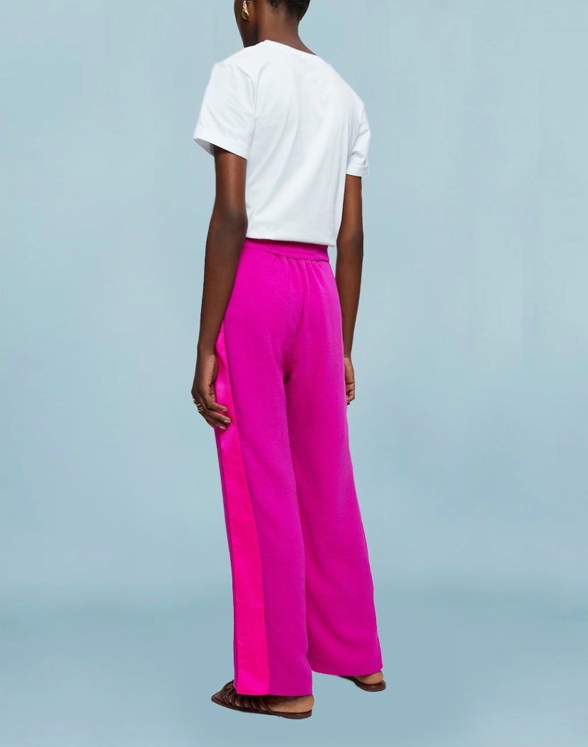 Lounge trousers in soft textured crepe with contrast satin trim detail. Designed with a flat front and elastic back waistband for a more relaxed fit. Style with the Balloon Flower Jacket (order separately).