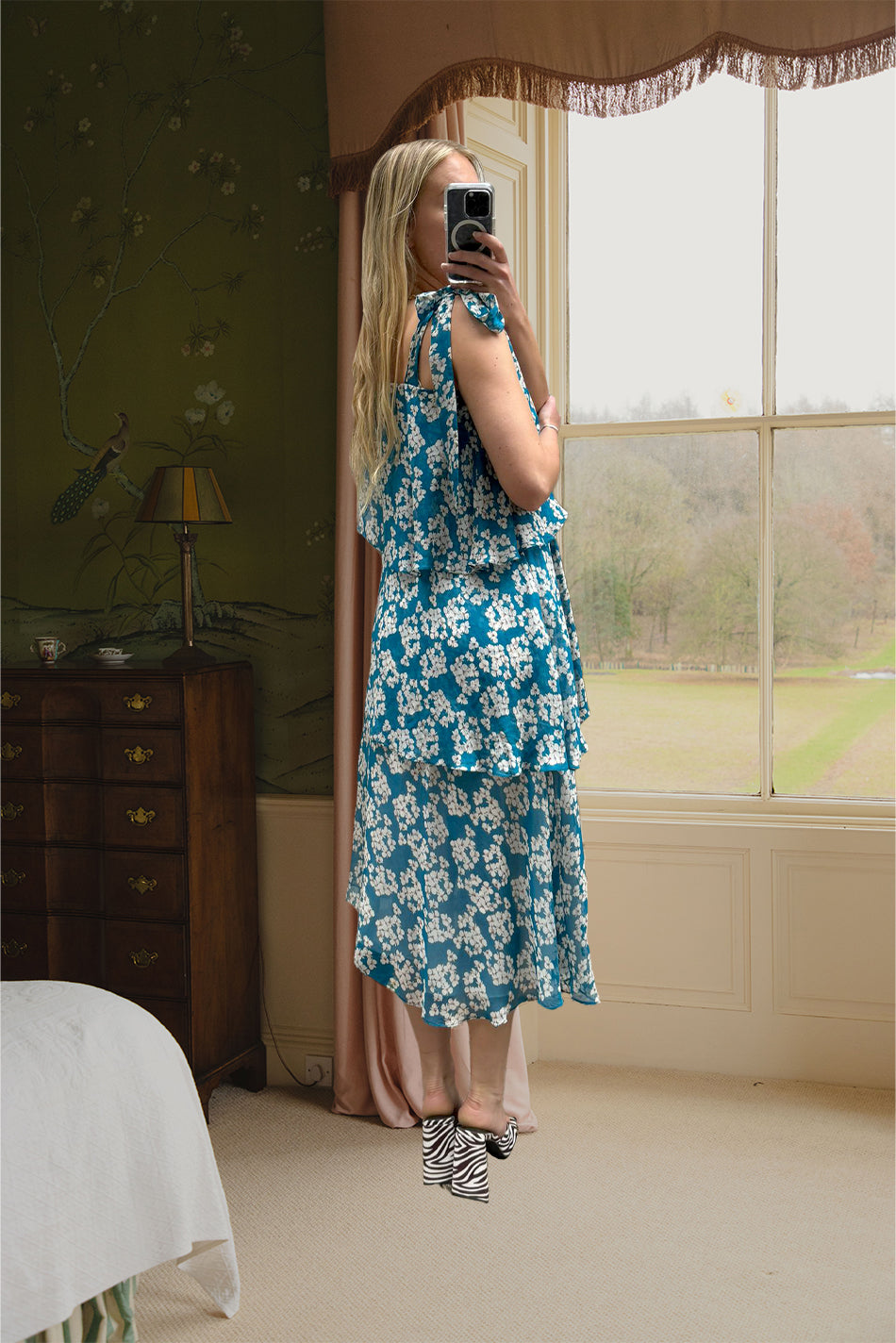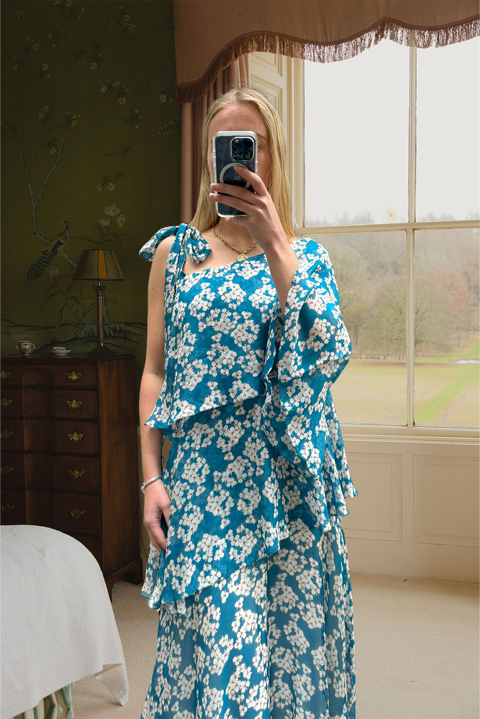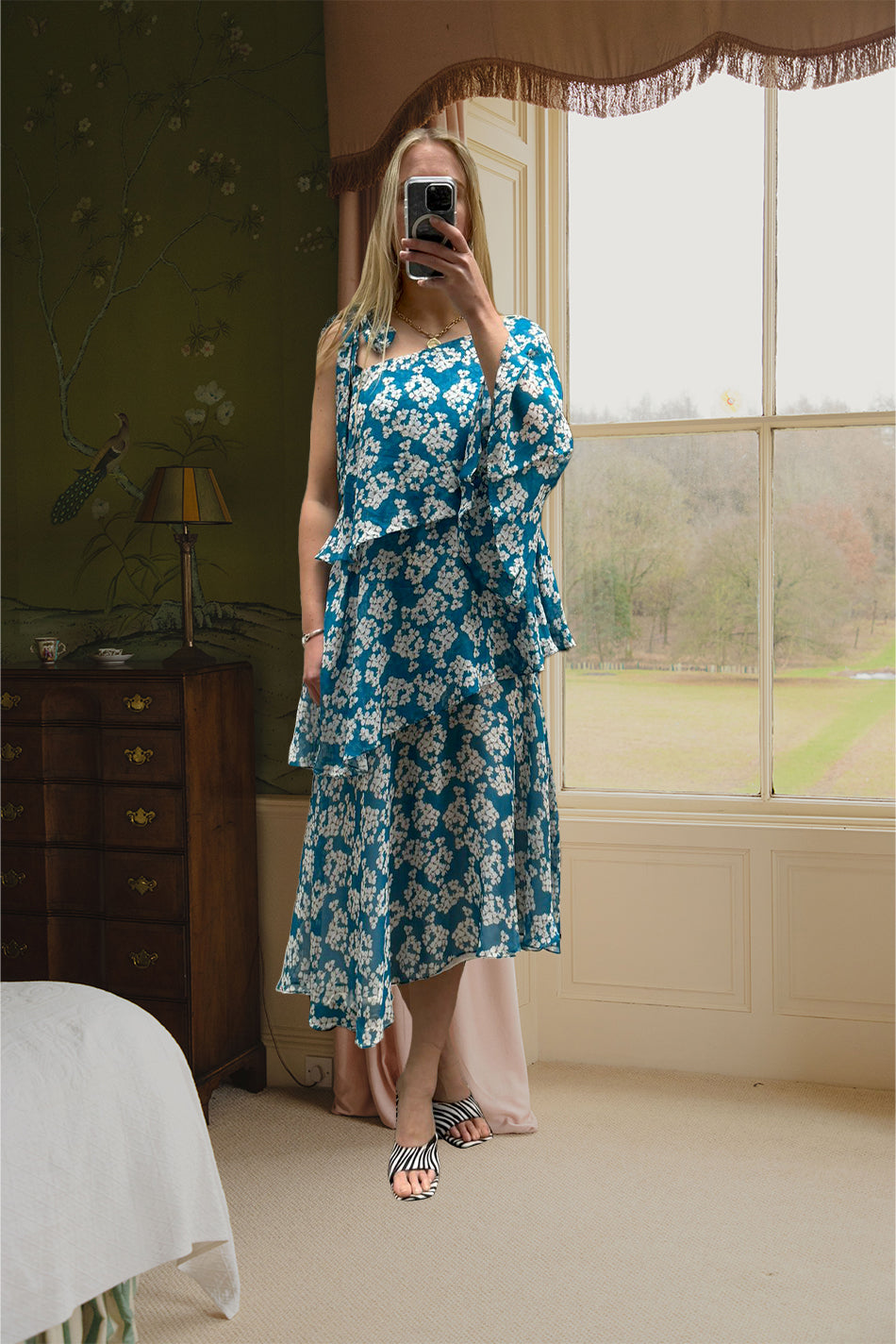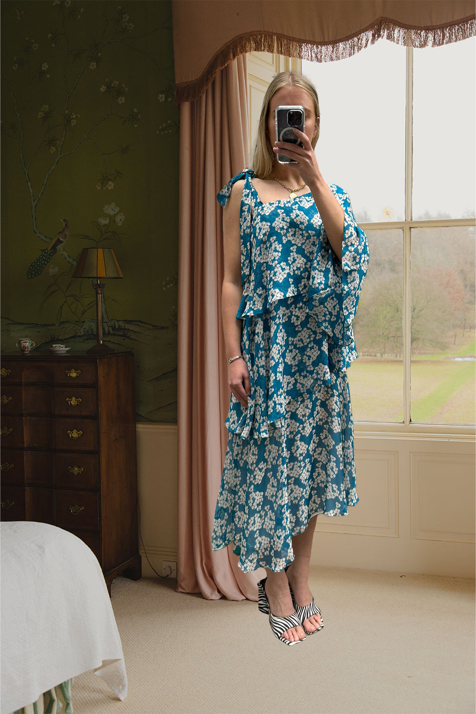 One shoulder floaty floral dress, made with lightweight fabric and an adjustable shoulder tie