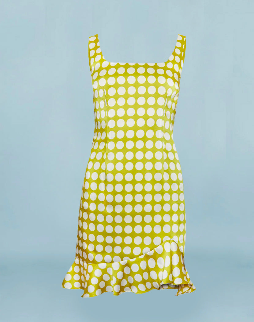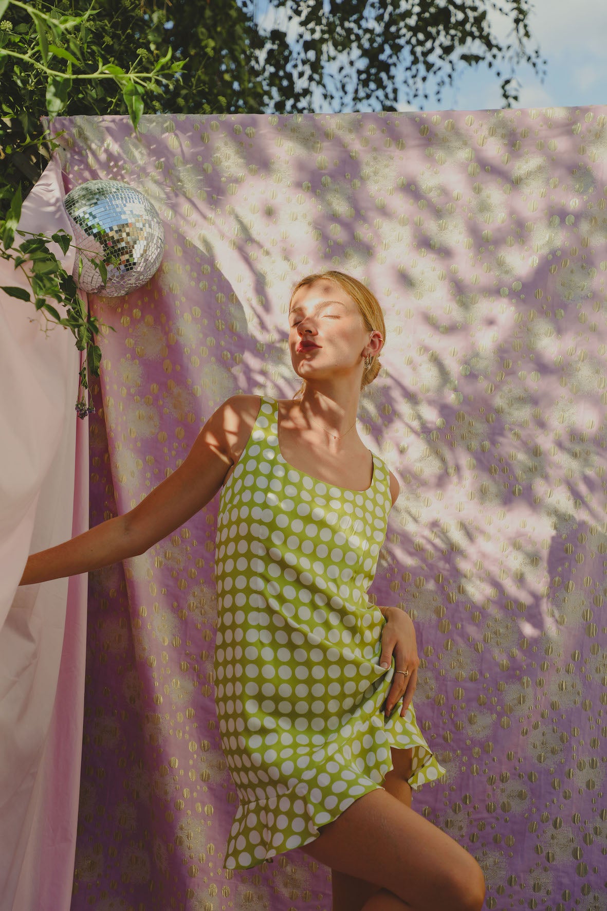 De La Vali’s Christabel mini dress is just the thing for balmy summer events. Cut from recycled lime-green and white polka-dot twill, it features a square neckline and an asymmetric hem with ruffles.