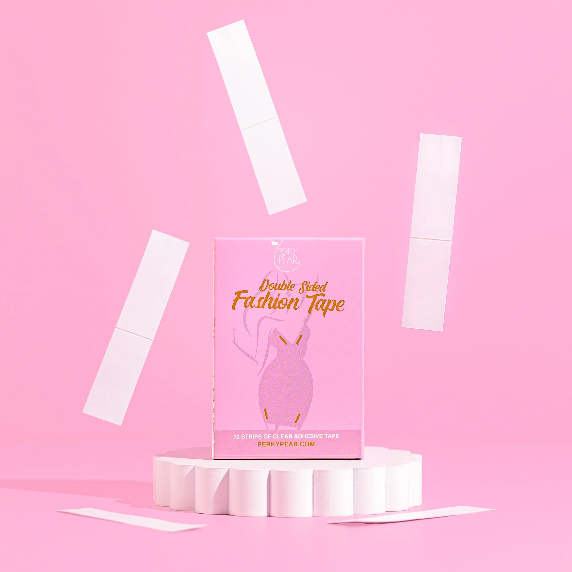 20 strips of pre cut double sided fashion tape to secure fly away clothing in place.