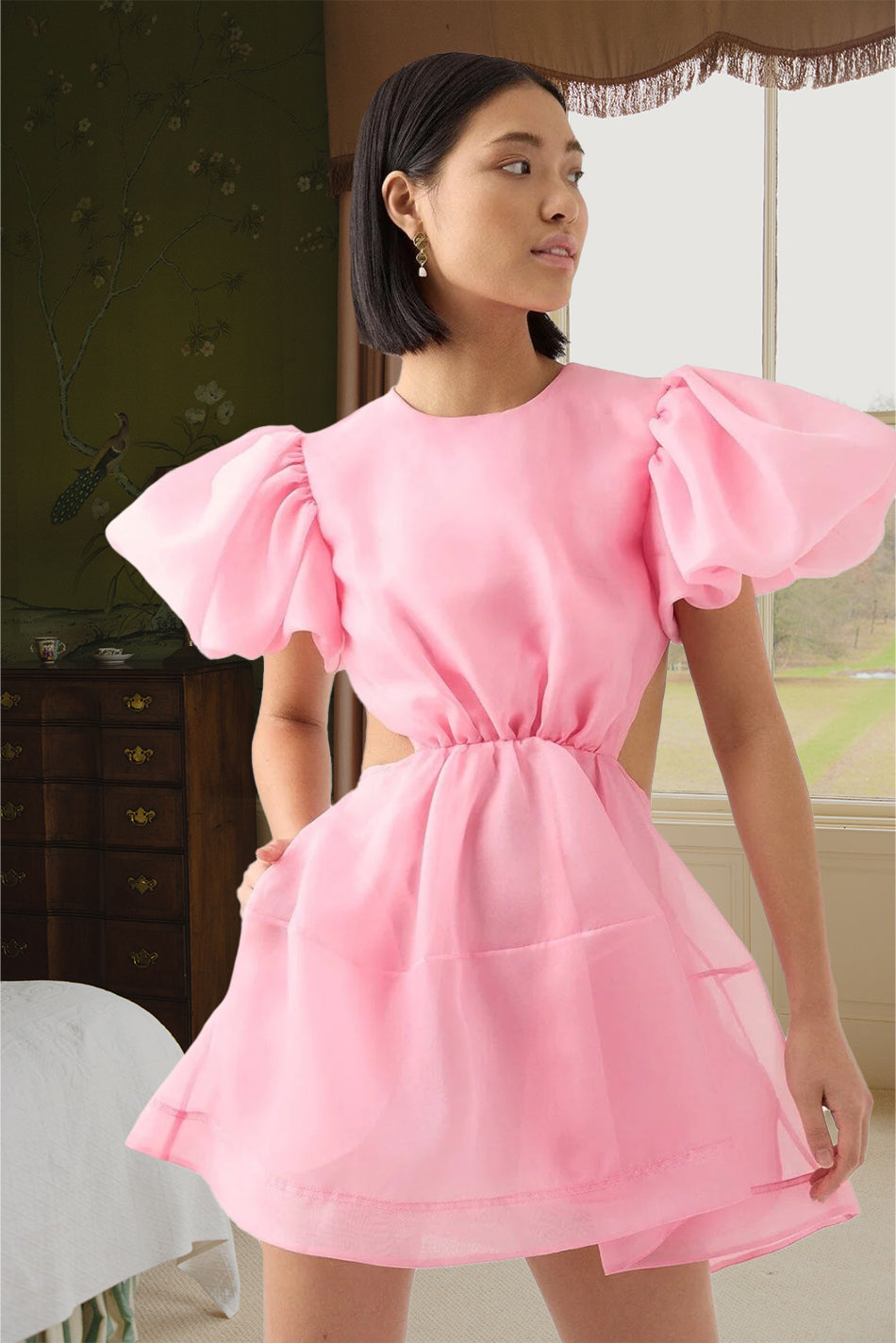 Organza dress, open back with partially elasticated waist and puffed sleeves. Button fastenings along the back with a concealed hook and zip fastening. Fully lined.