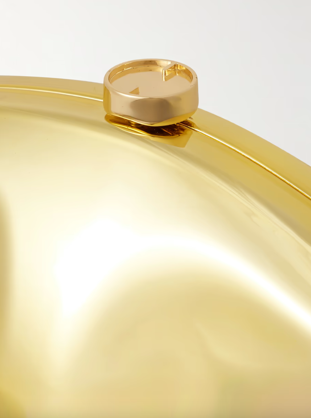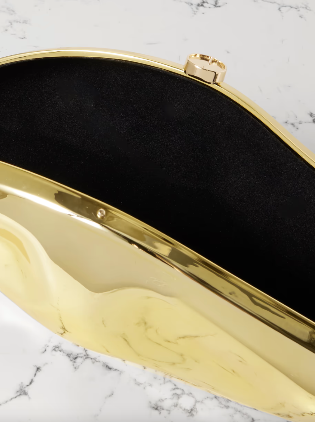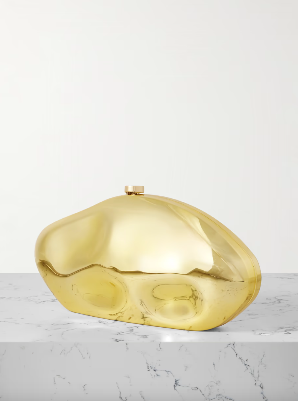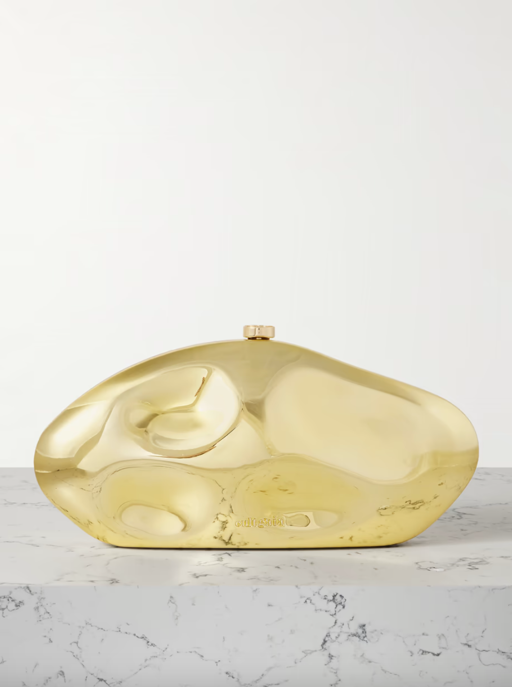 Cult Gaia's clutch has a sculptural shape inspired by - and named after - volcanic calderas. It's made from gold-tone acrylic and has a flocked interior. The bottom is flat, so it'll sit nicely on the table.