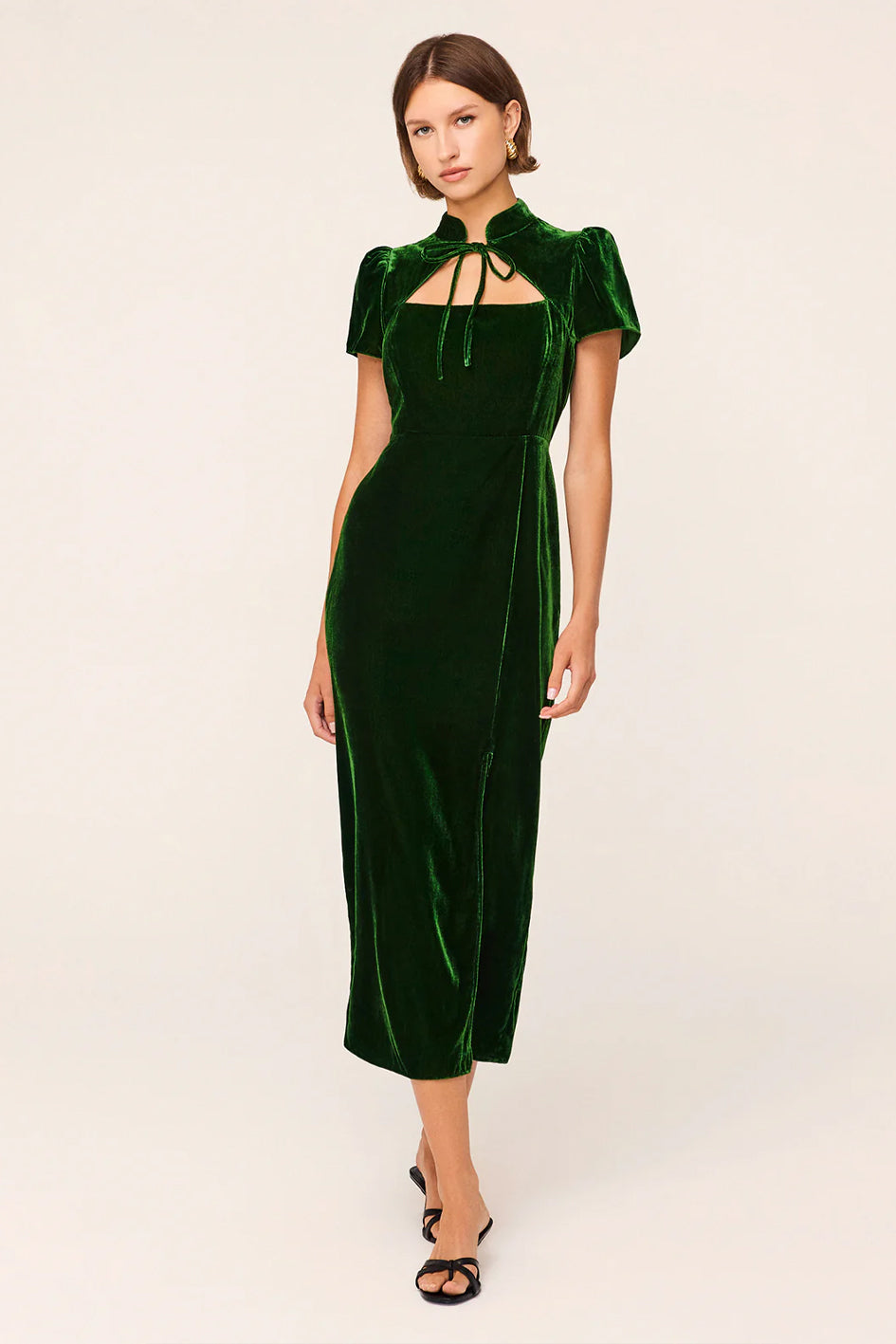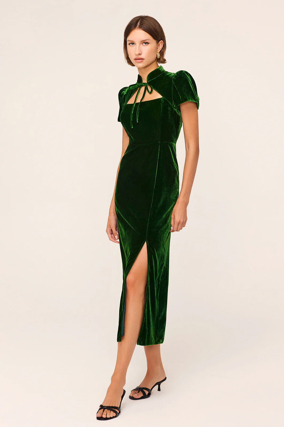 Easy elegance. The Carmella dress in a rich forest green velvet. Her Cheongsam-inspired standing collar and flared short sleeves make her both comfortable and chic. Her thigh-high split turns up the heat and maxi length ensure you'll make quite the impression.