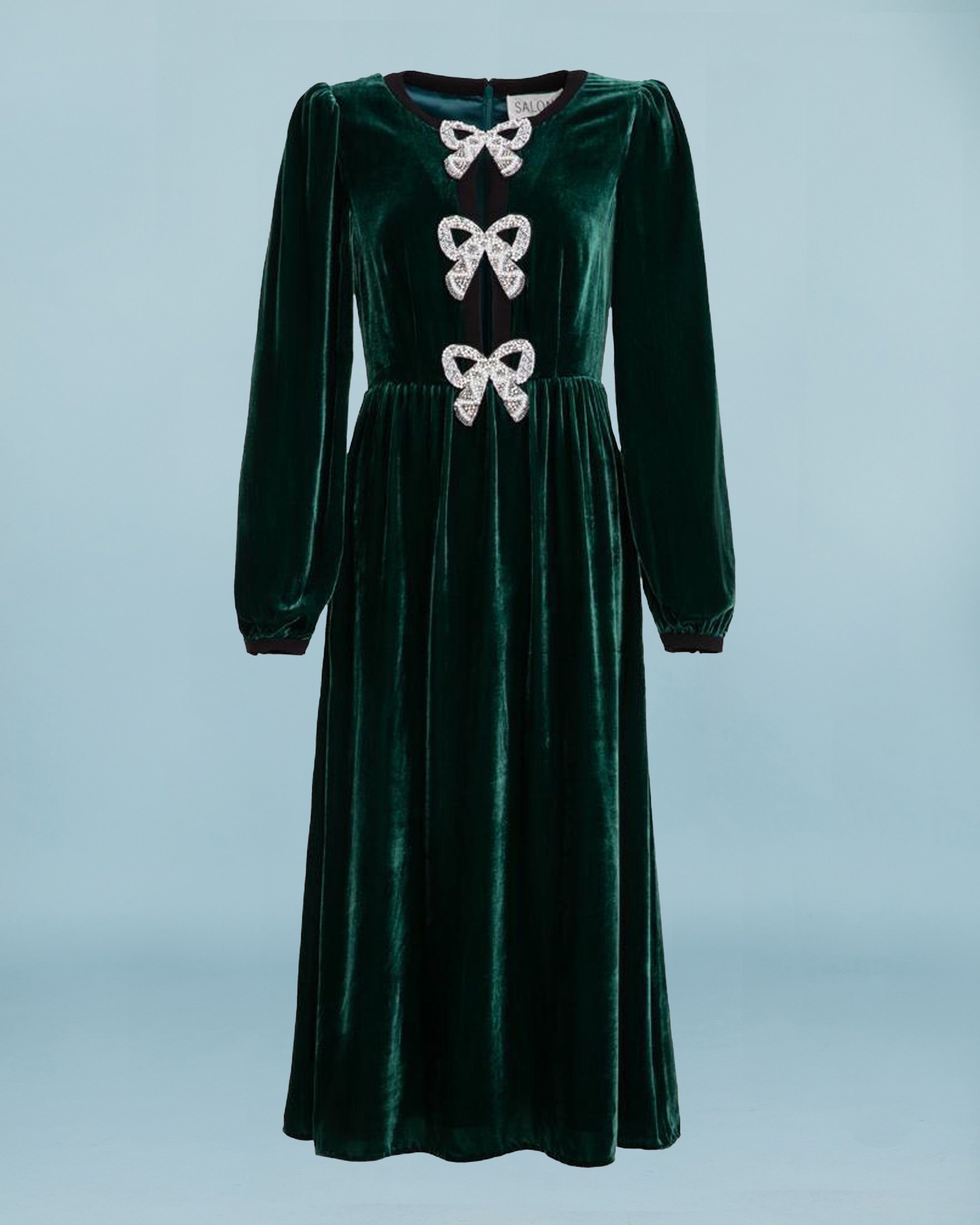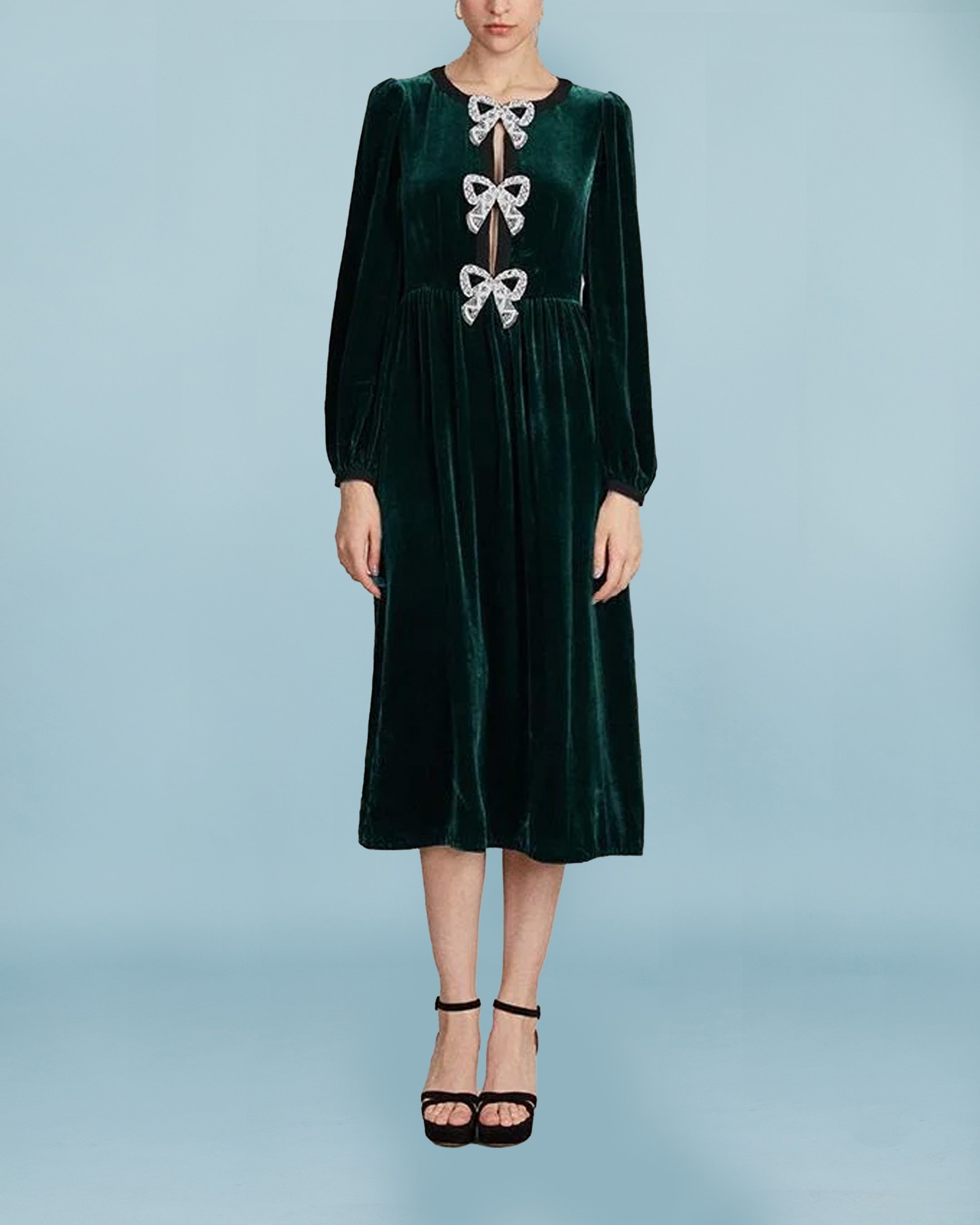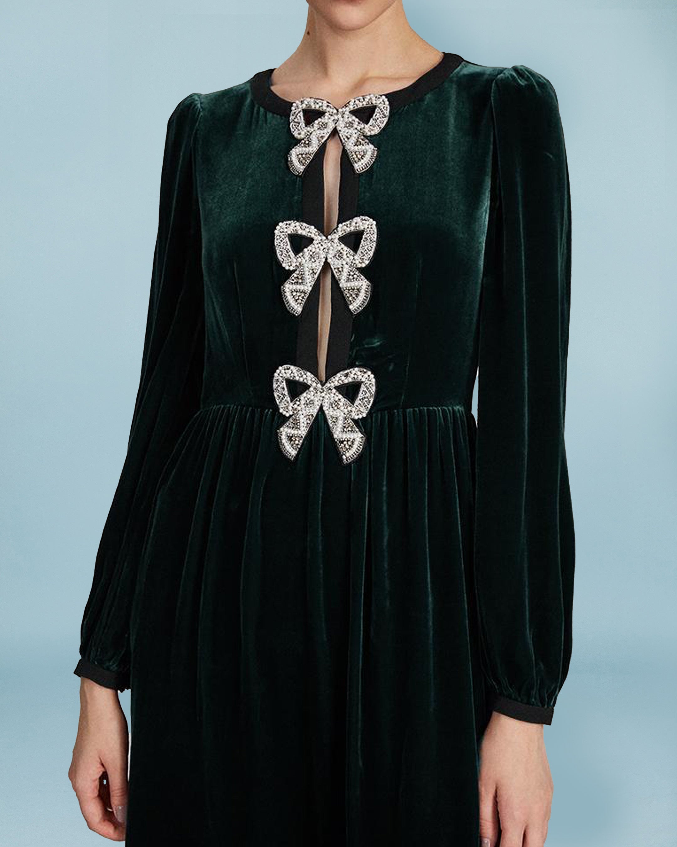 Elegant velvet dress with long sleeves and elasticated cuffs. Concealed zip at the back, and bow detail at the front which is open and shows skin