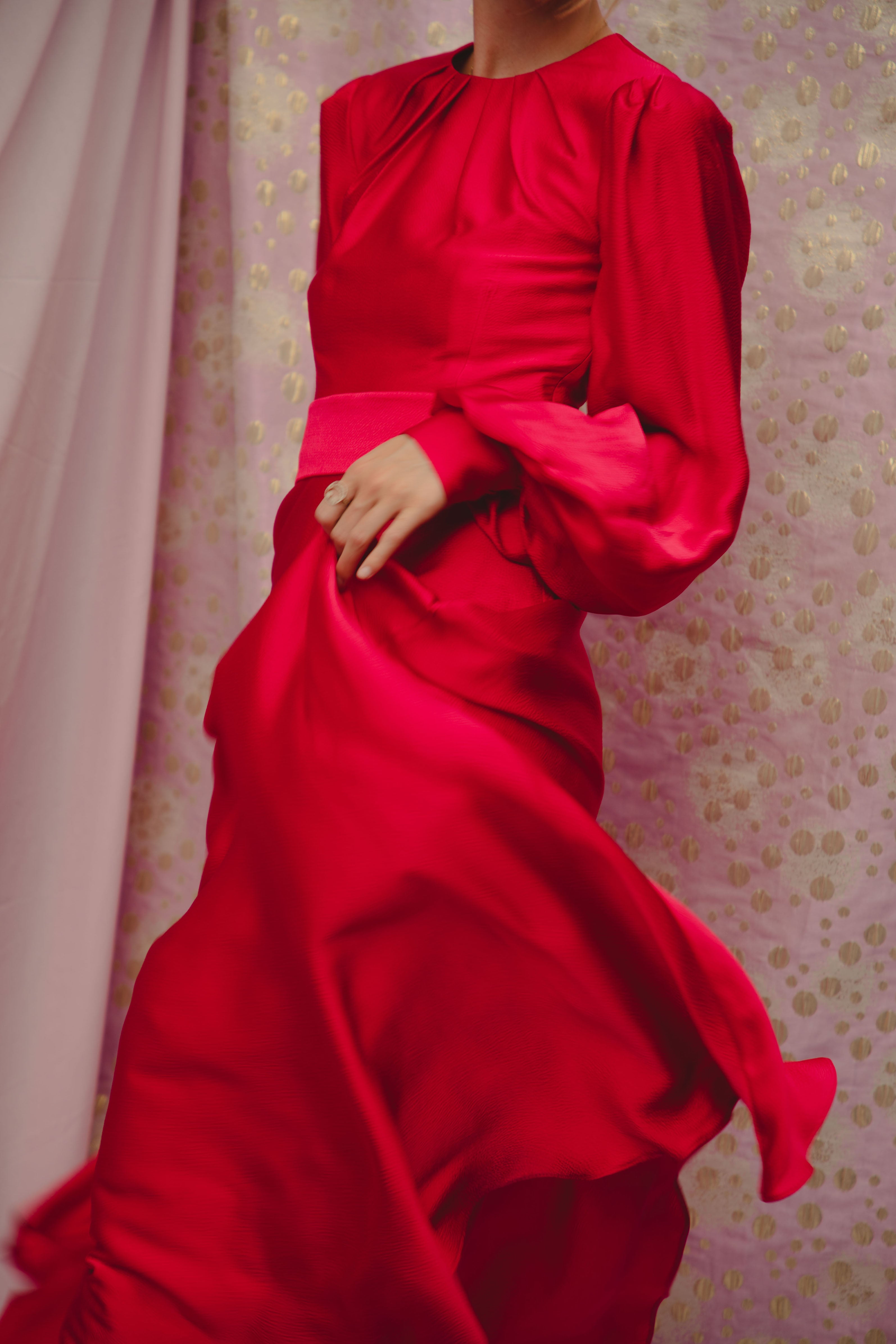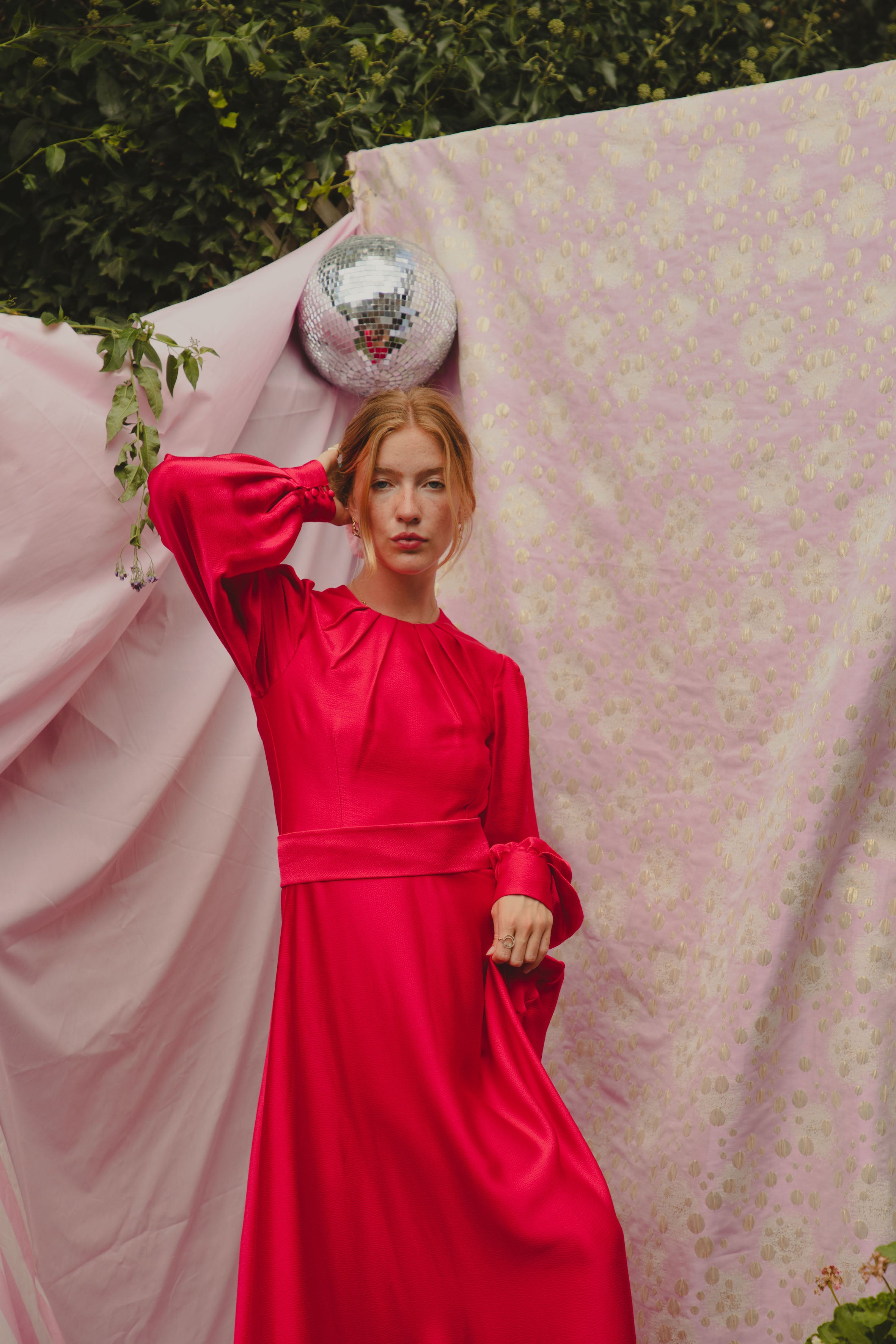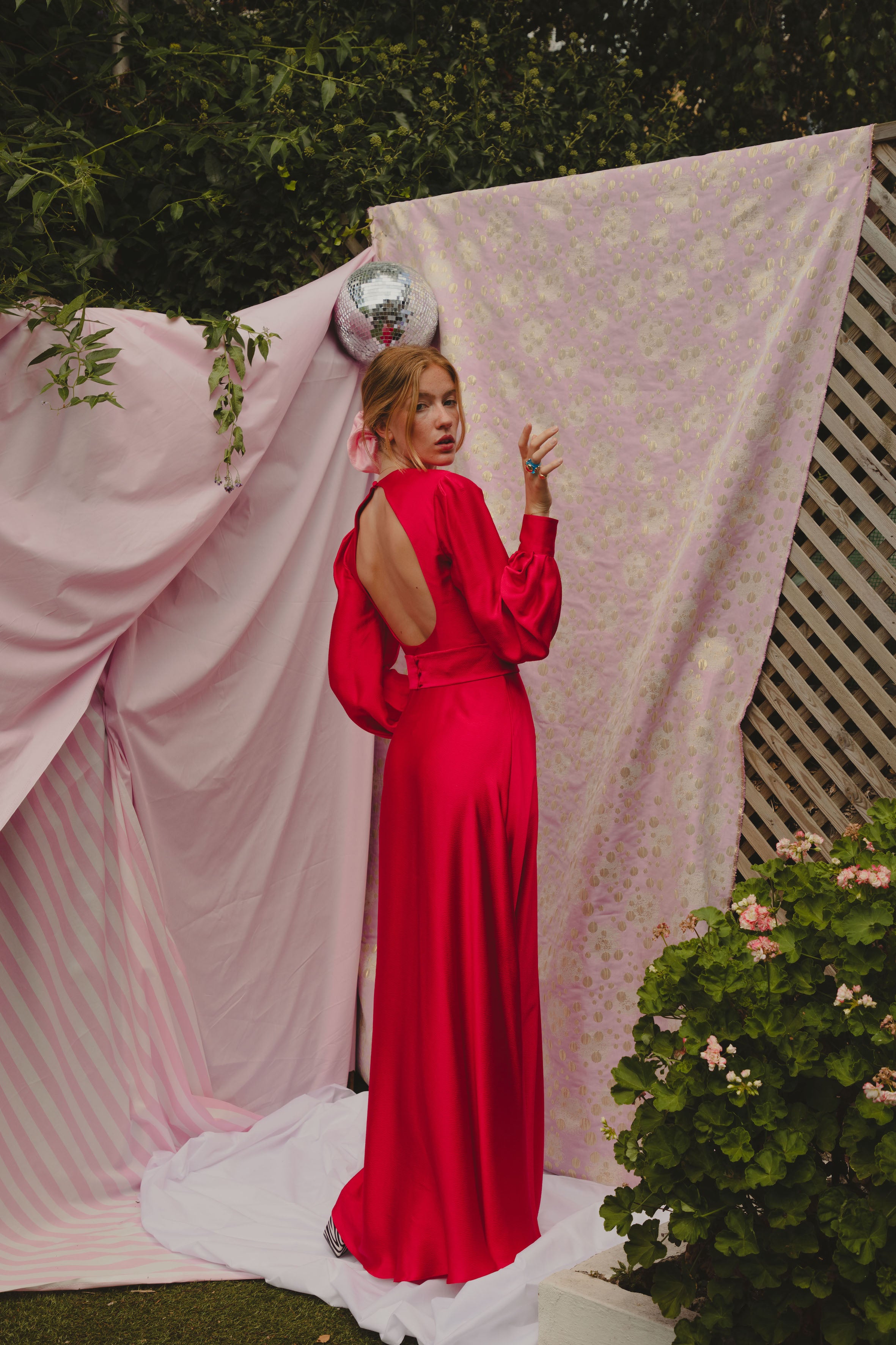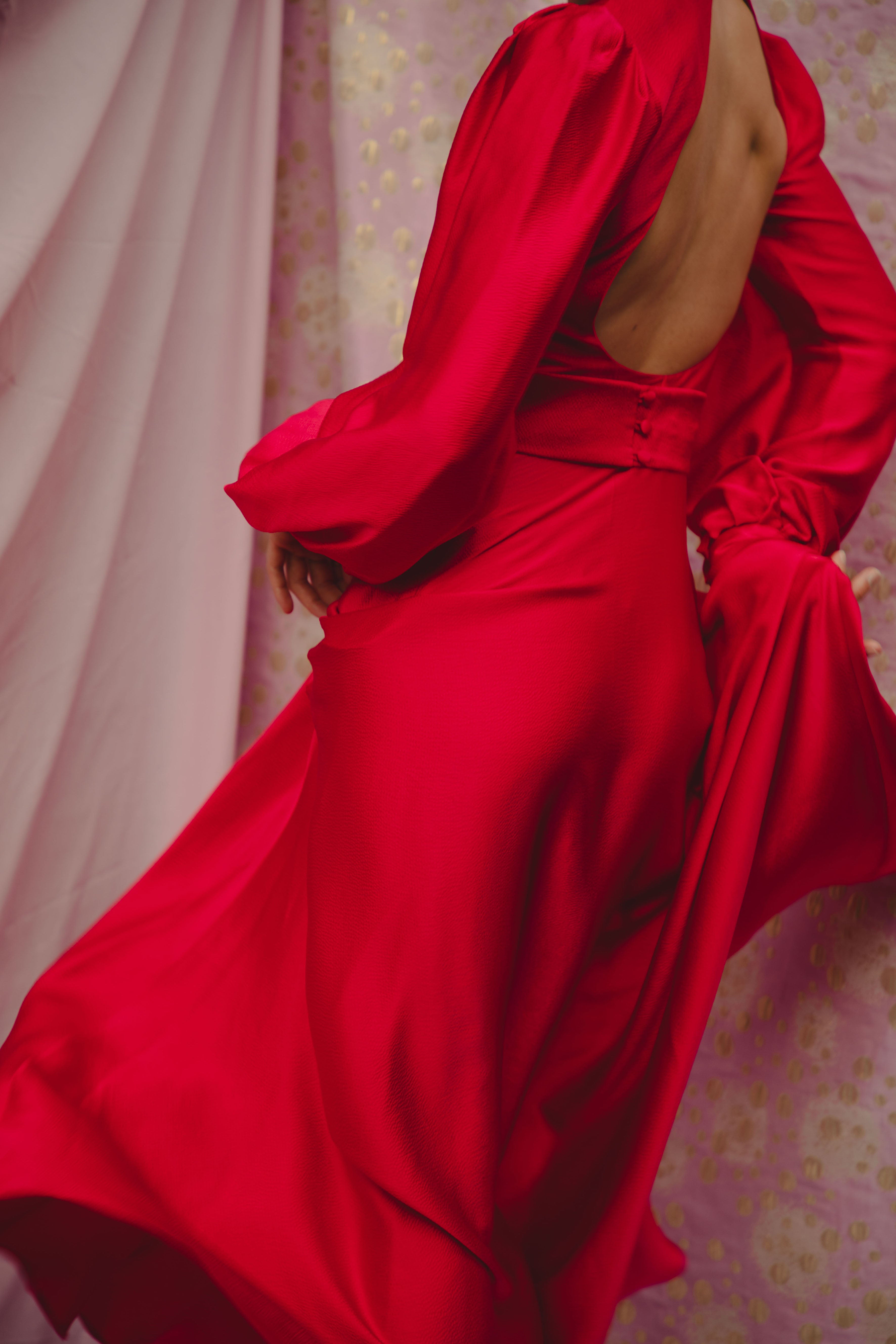 Elegant floor-length red silk maxi dress, with long puff sleeves which button at the end. Open back which buttons at the neck, and includes an option belt attachment. NB There are some signs of wear, which are hardly noticeable when on - get in contact for more information.