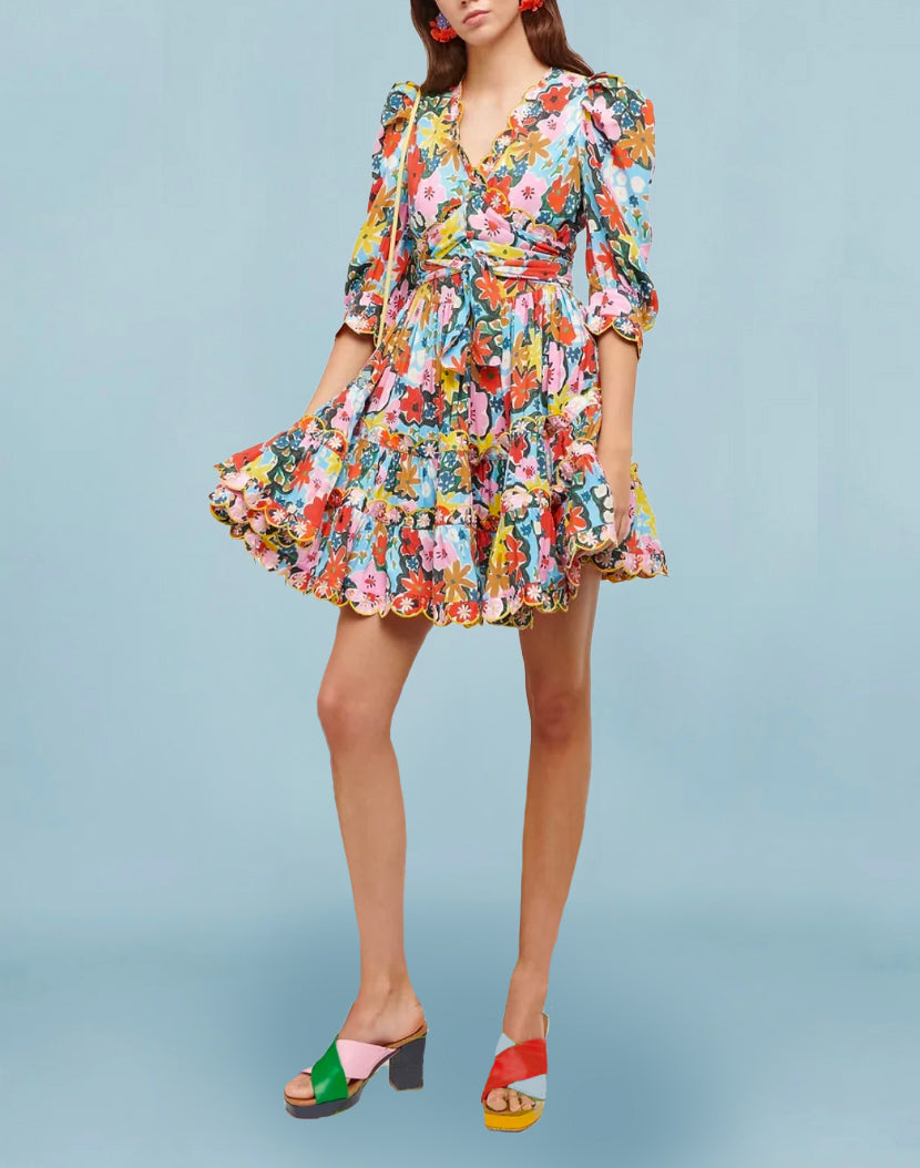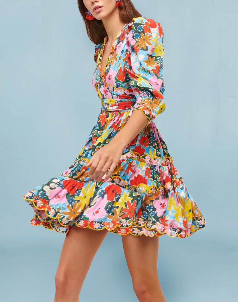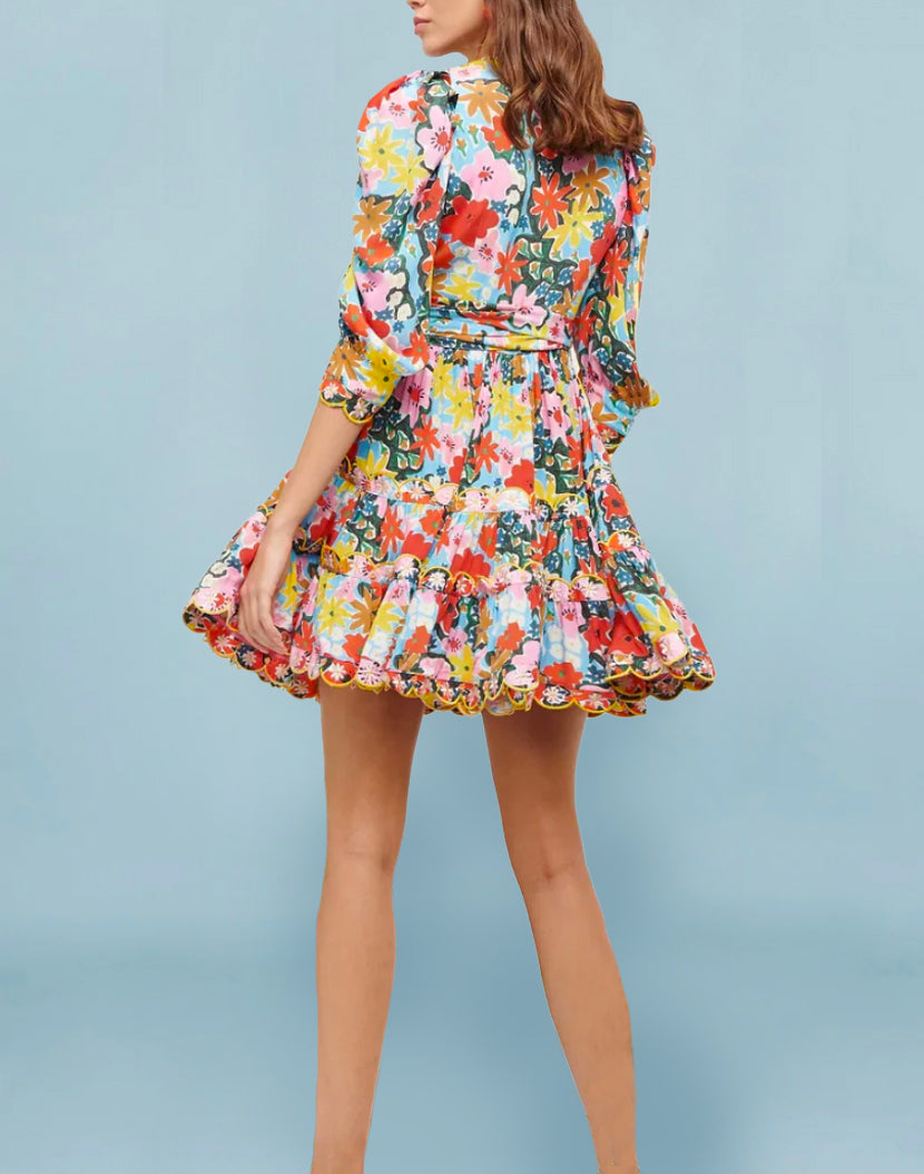 Introducing Celia B's version of the LBD, floral print and summer vibe strong. The sweetest yet vibrant mini dress can be dressed up or down whilst adding a splash of all the summer colours to your outfit. Made with a flattering fit and flare silhouette, this work of art features a matching belt, scalloped neckline and a full tiered scalloped skirt.