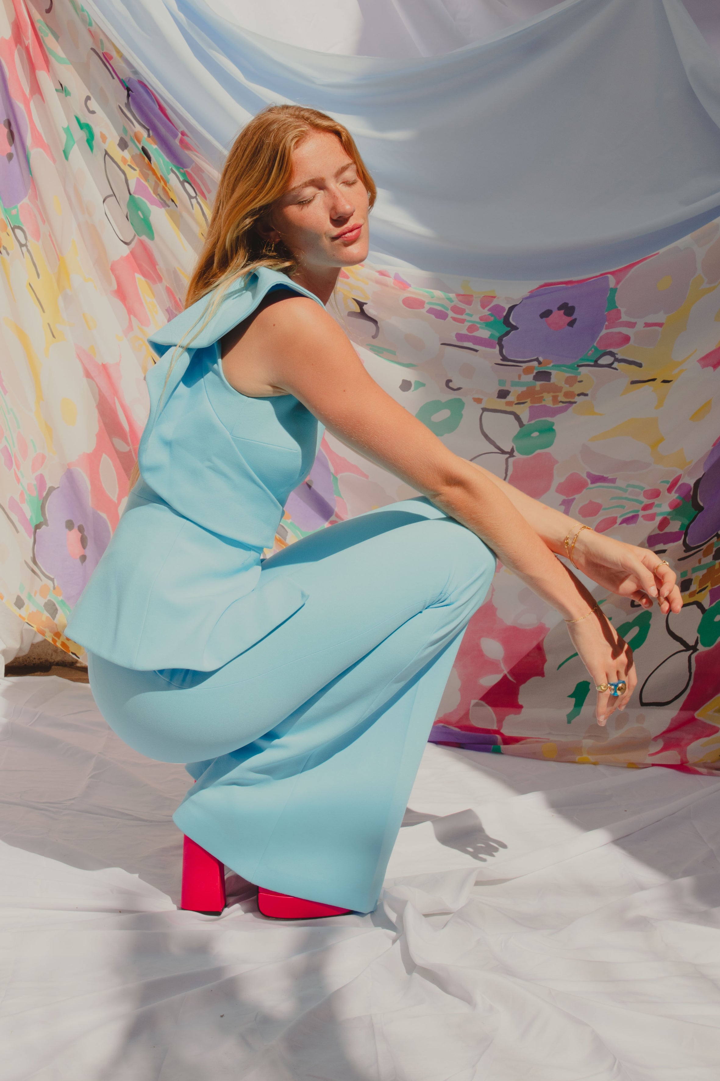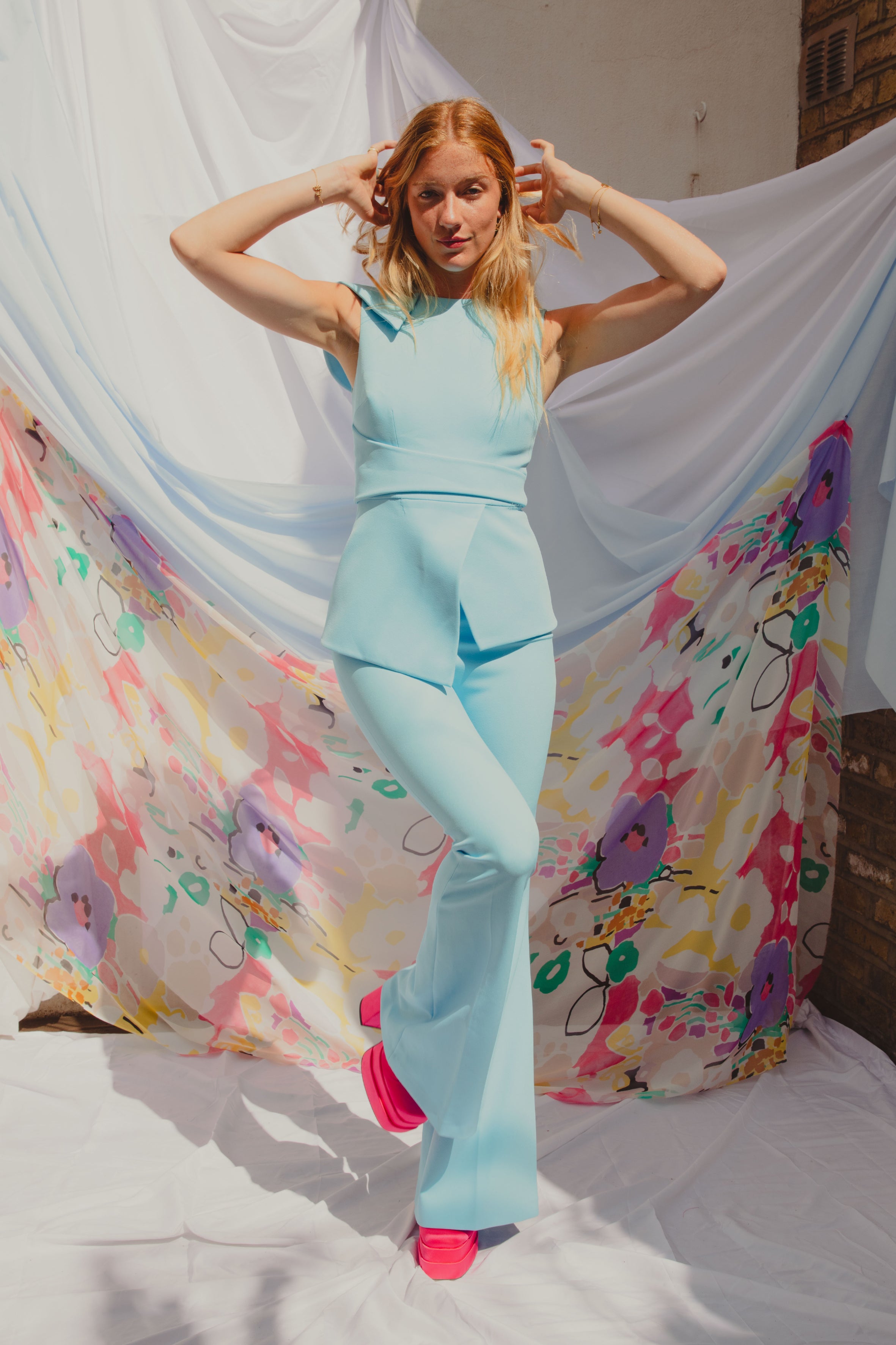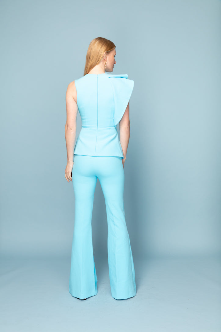 Cool two-piece with side zip for trousers and concealed back zip for the top. Elegant shoulder detailing.