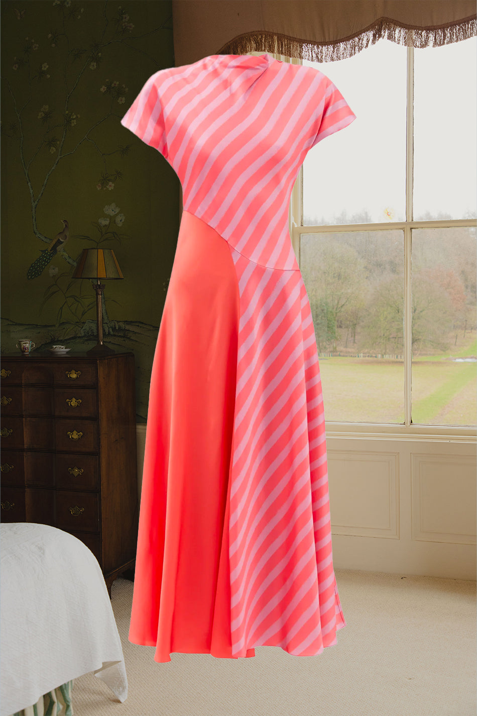 Crafted from lustrous silk satin, Roksanda's pink and orange striped Adriana dress is made with an orange panel that pulls focus to the sweeping skirt. There is a small pin prick from a badge on the chest - get in touch to see photos!